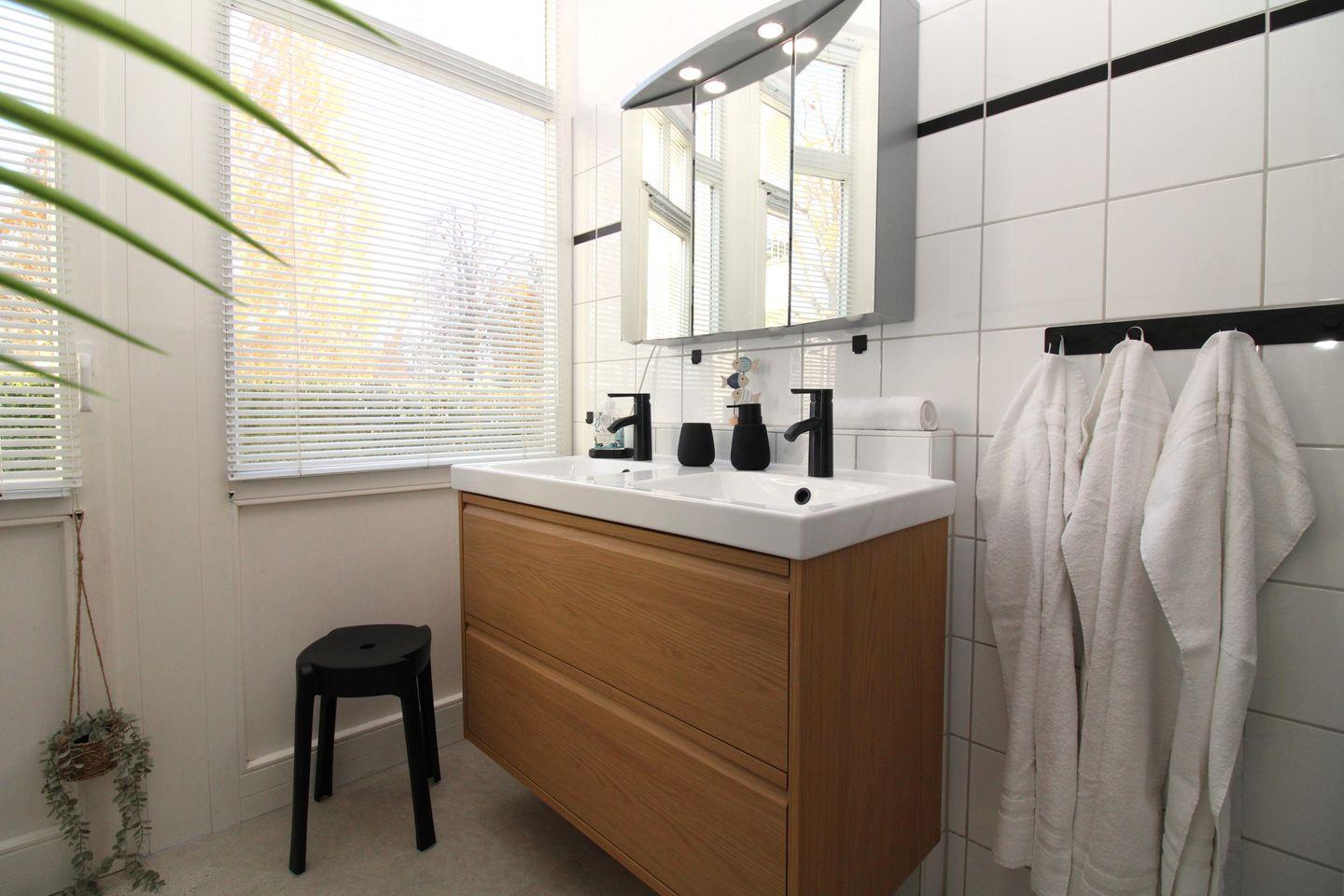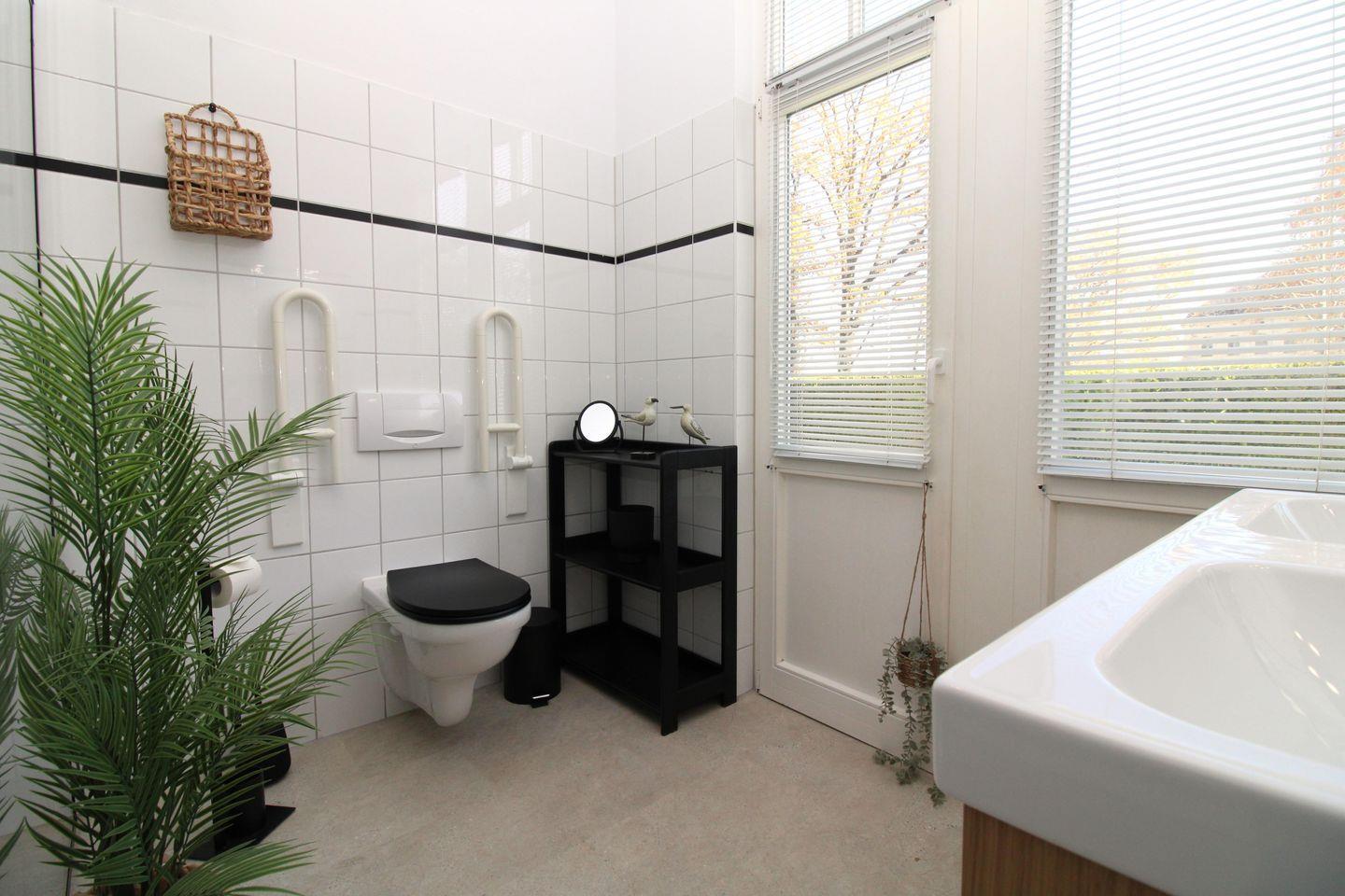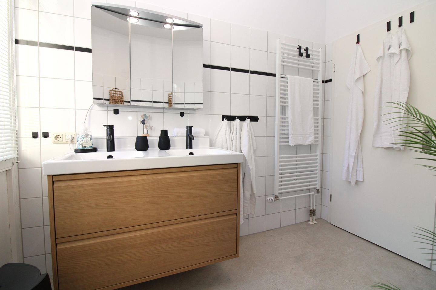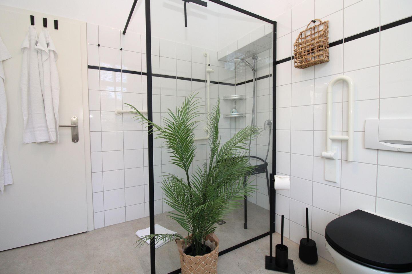 Das freundliche Badezimmer (mit Tageslicht / Fenster) verfügt über eine bodengleiche Echtglas-Dusche, 2 Waschbecken mit Unterschrank, Spiegelschrank, Regal, Hocker, WC, Föhn, Kosmetikspiegel, Handtuch-Heizkörper sowie ausreichend Ablagemöglichkeiten. Neben der Toilette befinden sich für Rollifahrer klappbare Haltegriffe. Die Dusche ist befahrbar und verfügt ebenfalls über Haltegriffe – weiterhin steht auch ein Duschstuhl zur Verfügung.
