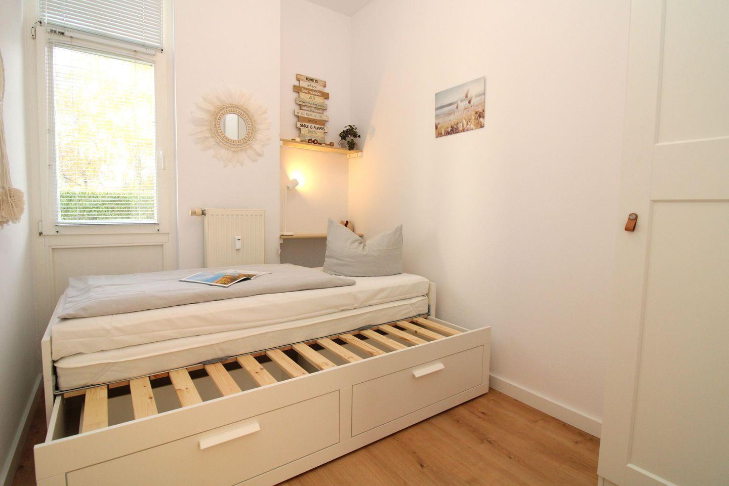 Das separate und zusätzliche 2. Schlafzimmer verfügt über ein (ausziehbares) Einzelbett (80 cm x 200 cm), welches mit wenigen Handgriffen zu einem bequemen Doppelbett (2 x 80 cm x 200 cm) ausgezogen werden kann, Nachttische mit Nachttischlampen sowie einen Kleiderschrank.