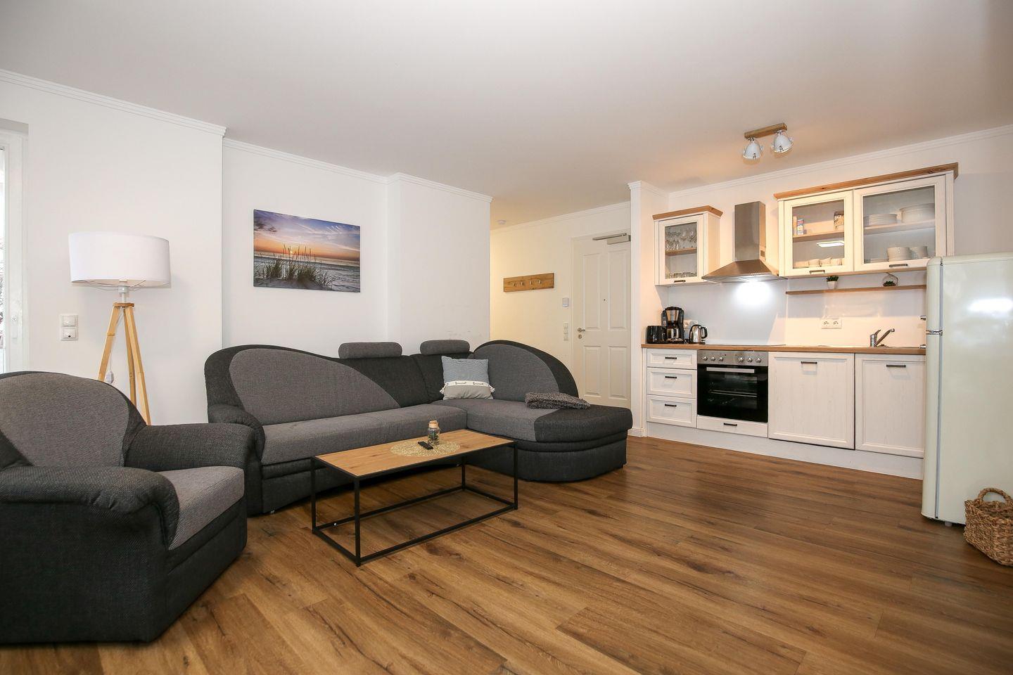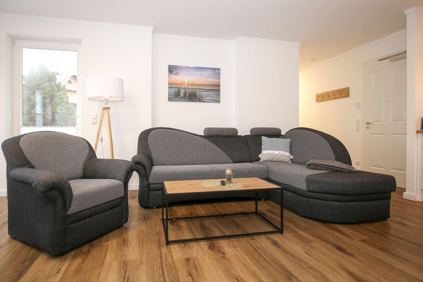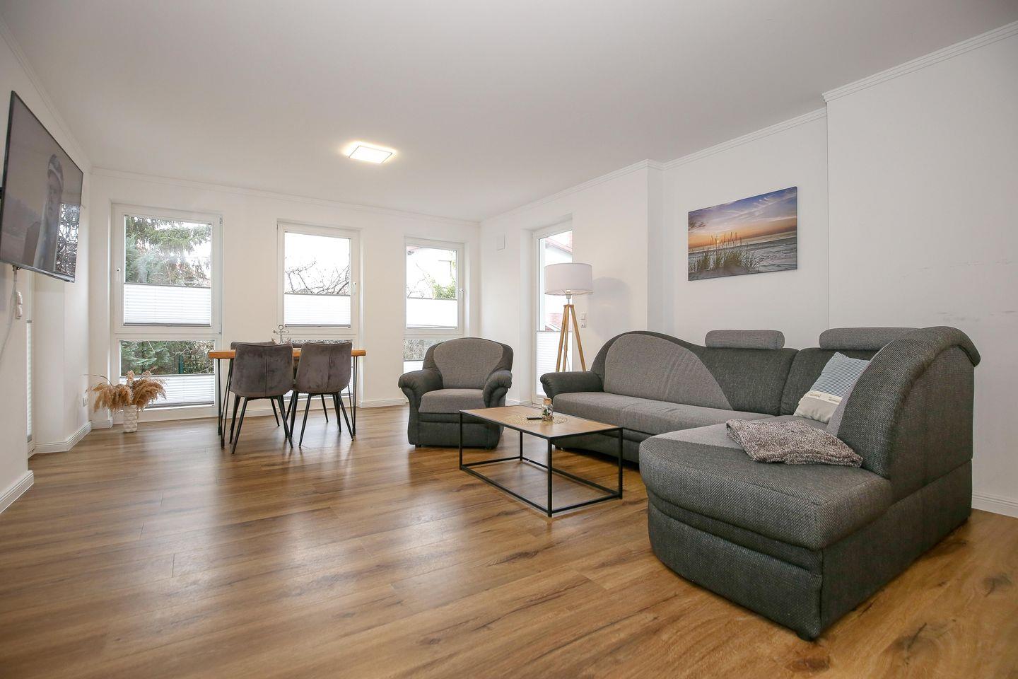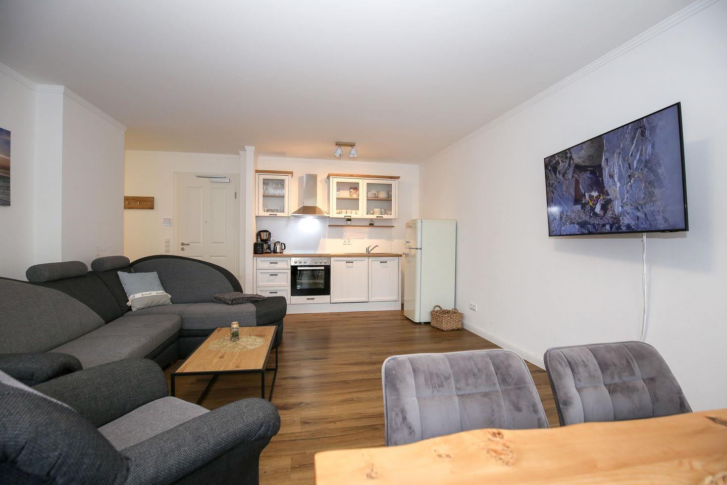 Der Wohnbereich der Ferienwohnung ist für dich mit einer gemütlichen Couch und einem Flachbild-TV eingerichtet. Der Essbereich ist im Wohnbereich integriert und bietet dir Platz für gemeinsame Mahlzeiten.