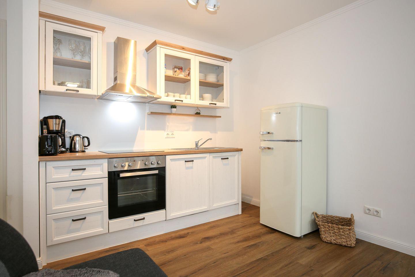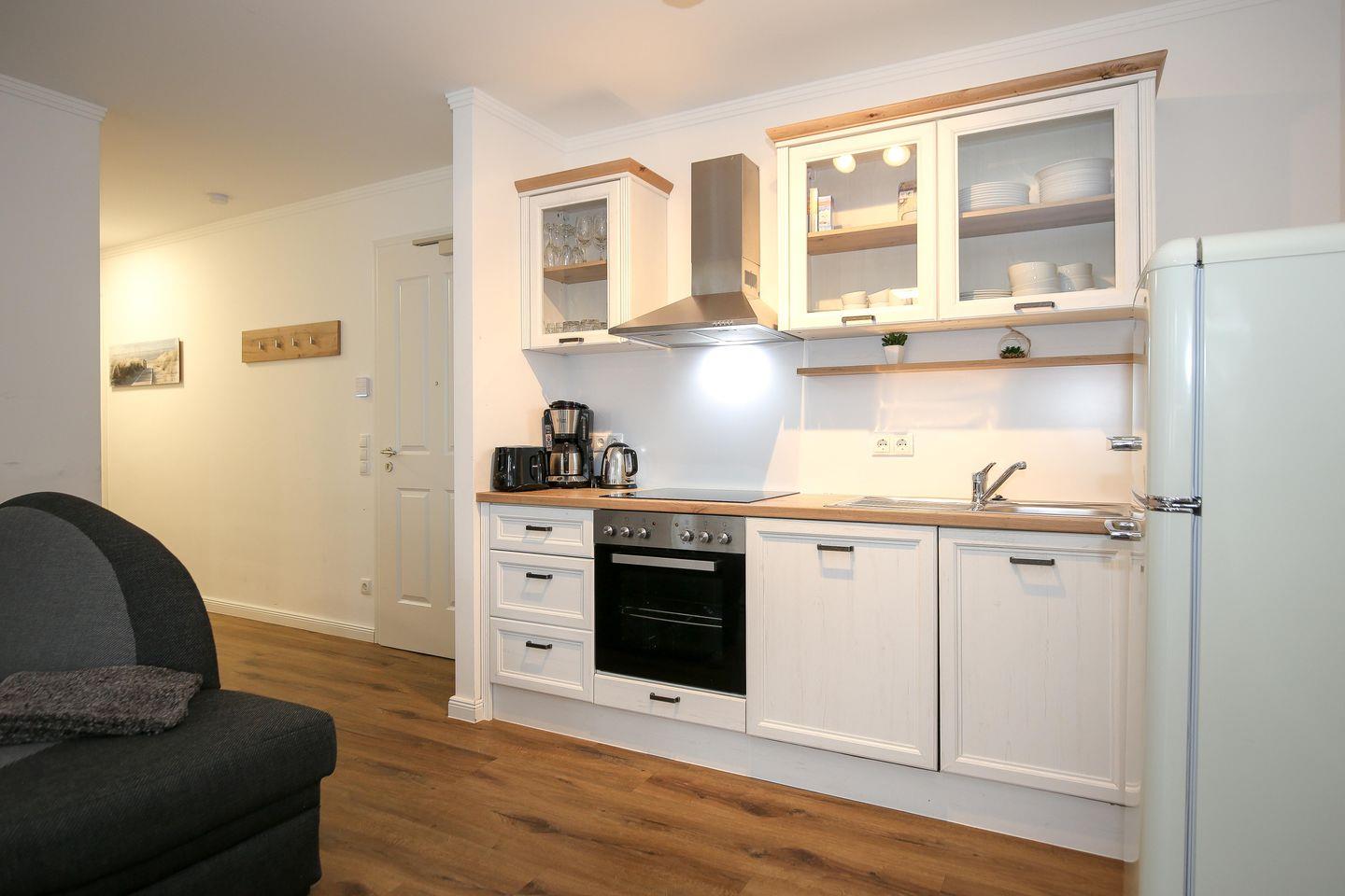 Die angrenzende offene Küchenzeile ist mit einem Kühlschrank mit Gefrierfach, einem Geschirrspüler, einem 4-Platten-Cerankochfeld und einem Backofen voll ausgestattet. Die Küchenausstattung wird komplettiert durch einen Toaster, eine Kaffeemaschine und einen Wasserkocher. Von hier aus hast du ebenfalls einen Blick auf die Ostsee.