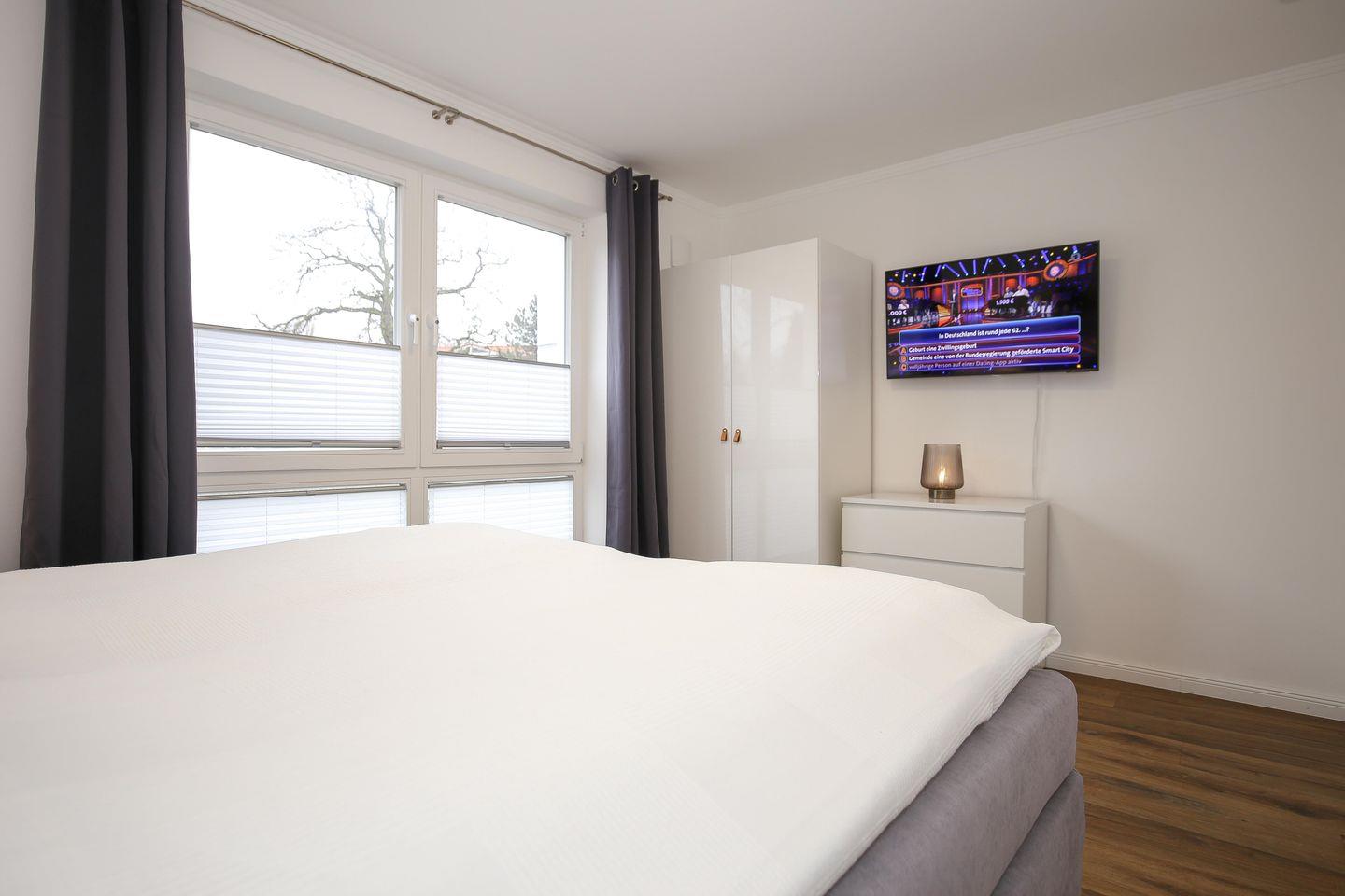 Das Schlafzimmer der Ferienwohnung ist mit einem komfortablen Boxspringbett ( 180 x 200 cm) eingerichtet. Für deine Garderobe bietet der Kleiderschrank ausreichend Stauraum. Zudem erwartet dich hier ein zweiter Flachbild-TV. Zur Verdunklung dienen blickdichte Vorhänge an den Fenstern.