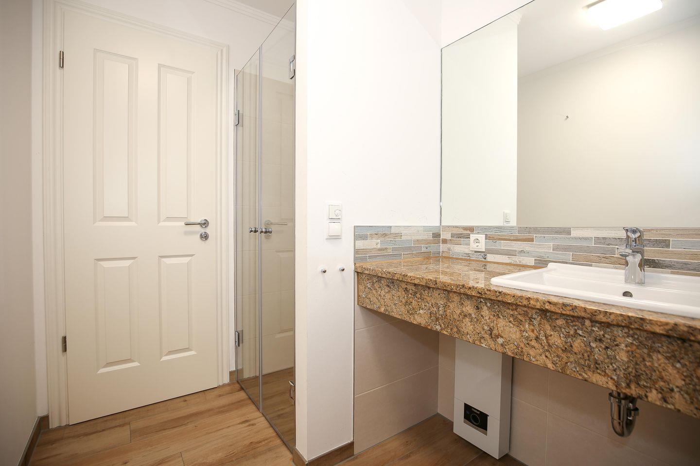 Das Tageslichtbad mit ebenerdiger Dusche ist mit einem großzügigen Waschtisch und einem Föhn ausgestattet.