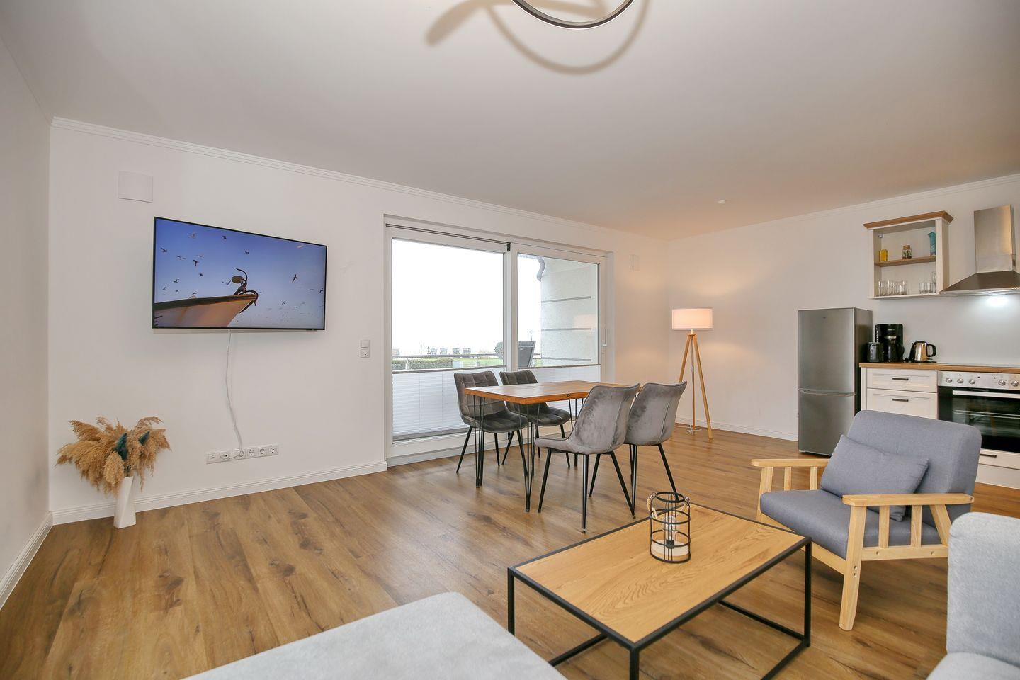 Der Wohnbereich der Ferienwohnung ist für dich mit einer gemütlichen Couch und einem Flachbild-TV eingerichtet. Der Essbereich ist im Wohnbereich integriert und bietet dir Platz für gemeinsame Mahlzeiten.