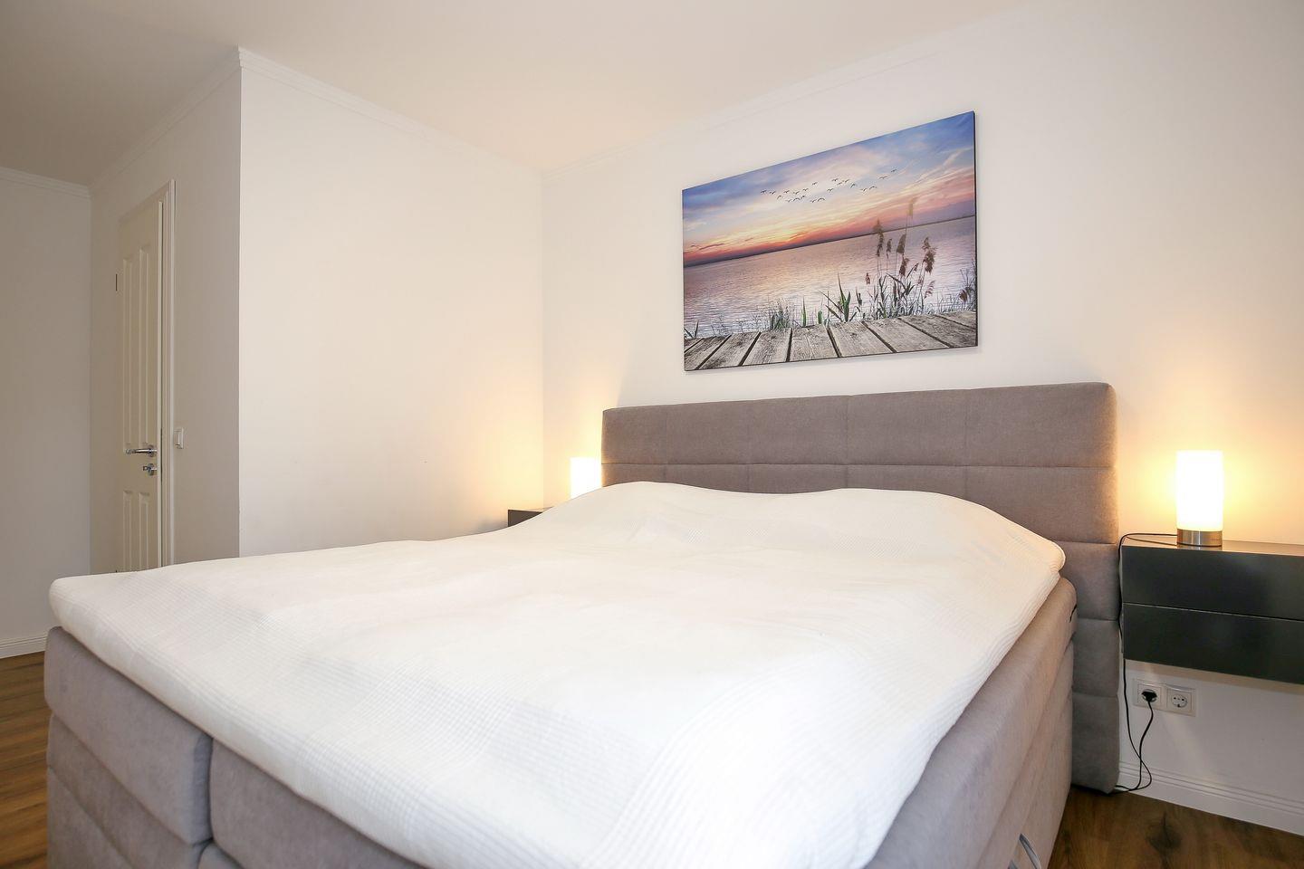 Das Schlafzimmer der Ferienwohnung ist mit einem komfortablen Boxspringbett ( 180 x 200 cm) eingerichtet. Für deine Garderobe bietet der Kleiderschrank ausreichend Stauraum. Zudem erwartet dich hier ein zweiter Flachbild-TV. Zur Verdunklung dienen blickdichte Vorhänge an den Fenstern.