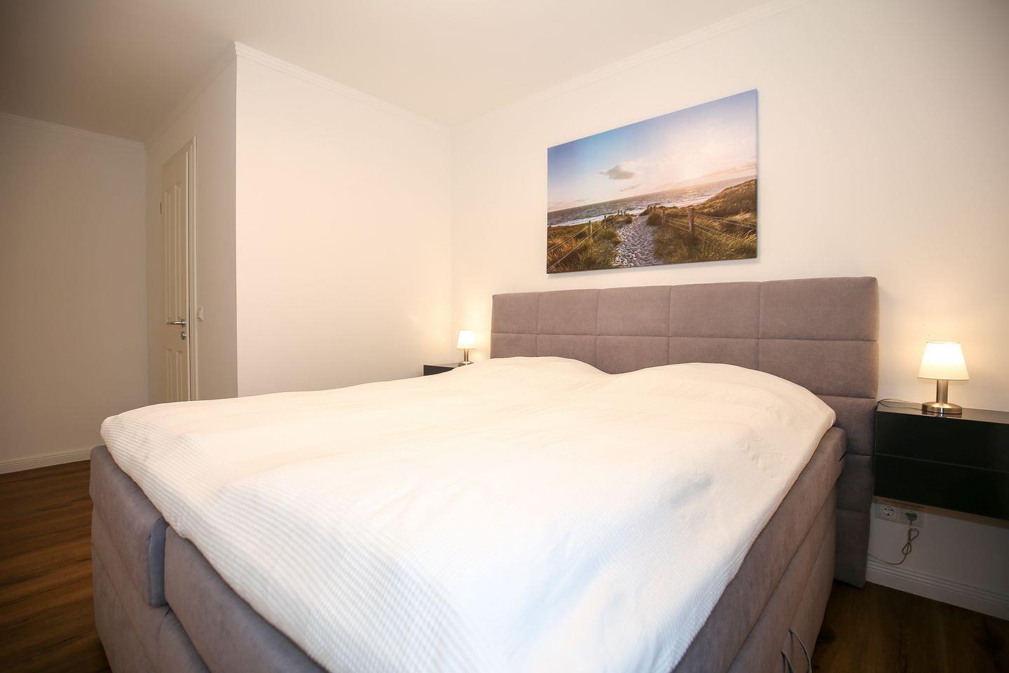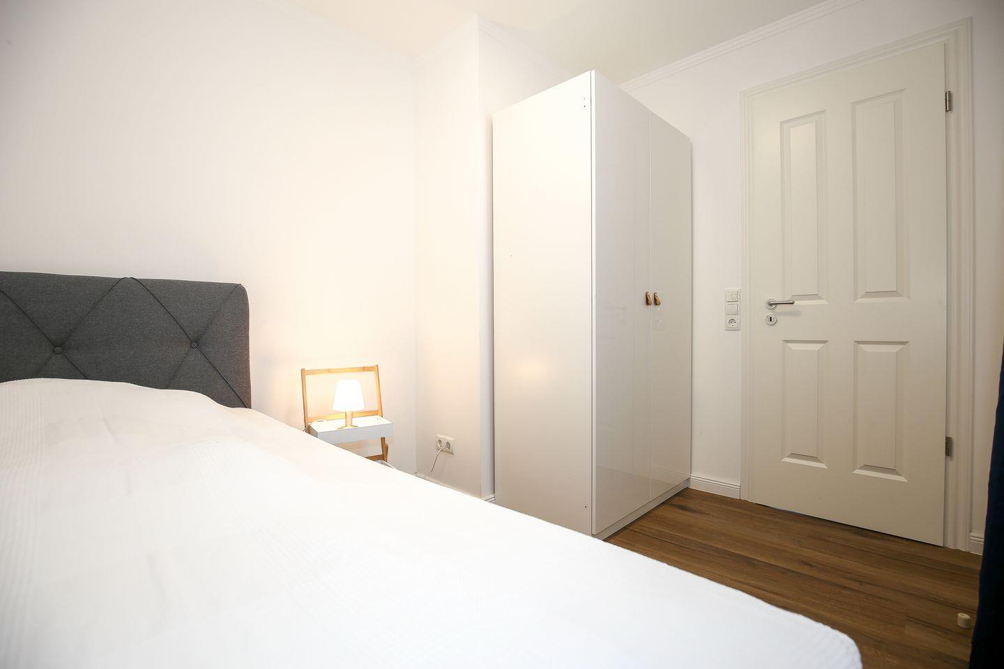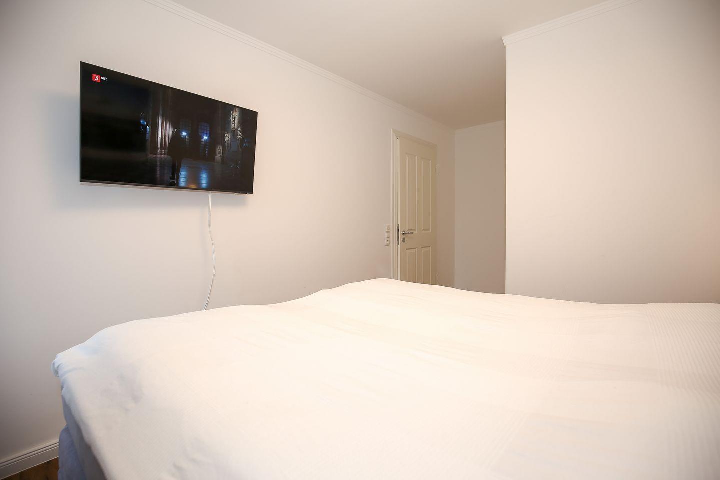 Das Schlafzimmer der Ferienwohnung ist mit einem komfortablen Boxspringbett ( 180 x 200 cm) eingerichtet. Für deine Garderobe bietet der Kleiderschrank ausreichend Stauraum. Zudem erwartet dich hier ein zweiter Flachbild-TV. Zur Verdunklung dienen blickdichte Vorhänge an den Fenstern.
