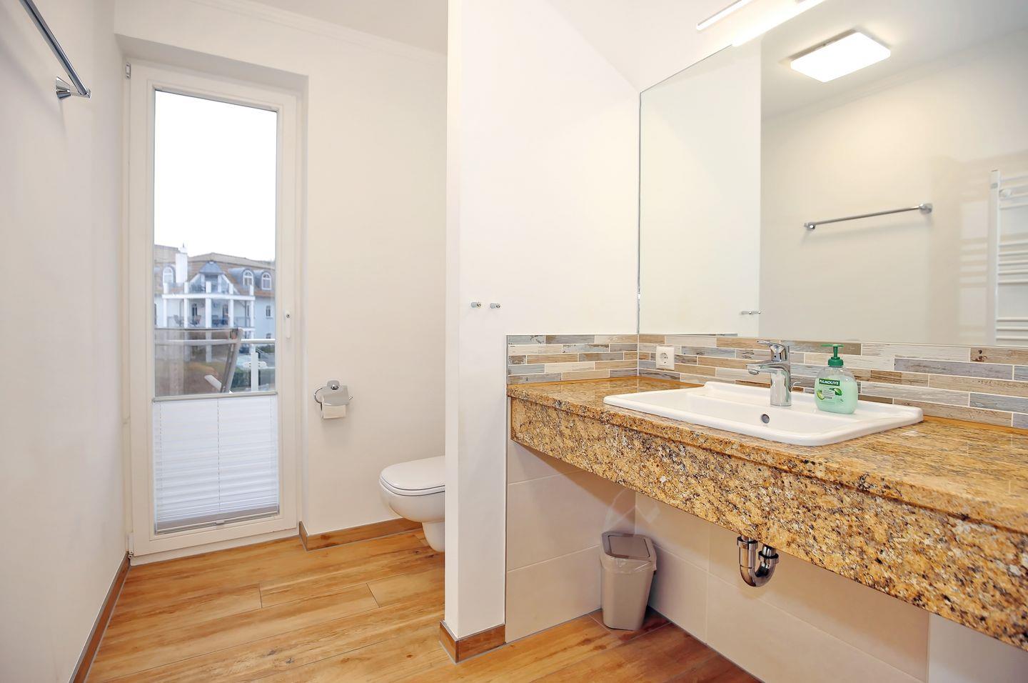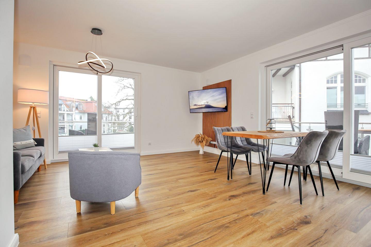 In dieser luxuriösen Ferienwohnung auf ca. 71 m² wird eine hochwertige Ausstattung großgeschrieben. Die moderne 3-Zimmer-Wohnung mit Süd-West-Ausrichtung befindet sich im 1. Obergeschoss der Villa Siegfried und bietet bis zu 3 Personen einen erholsamen Urlaub an der Ostsee – nach nur ca. 50 Metern bist du direkt am Strand. Die Wohnung ist in einen Wohnbereich, einen kombinierten Ess- und Küchenbereich sowie einem Schlafzimmer und einem Tageslichtbad mit Dusche aufgeteilt. Auf dem Balkon kannst du entspannte Stunden mit Blick auf die Ostsee genießen.