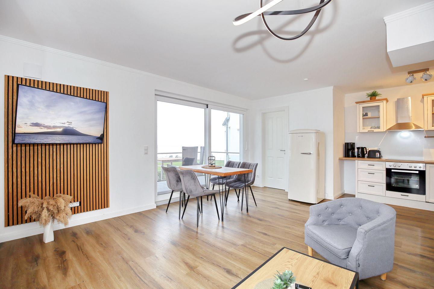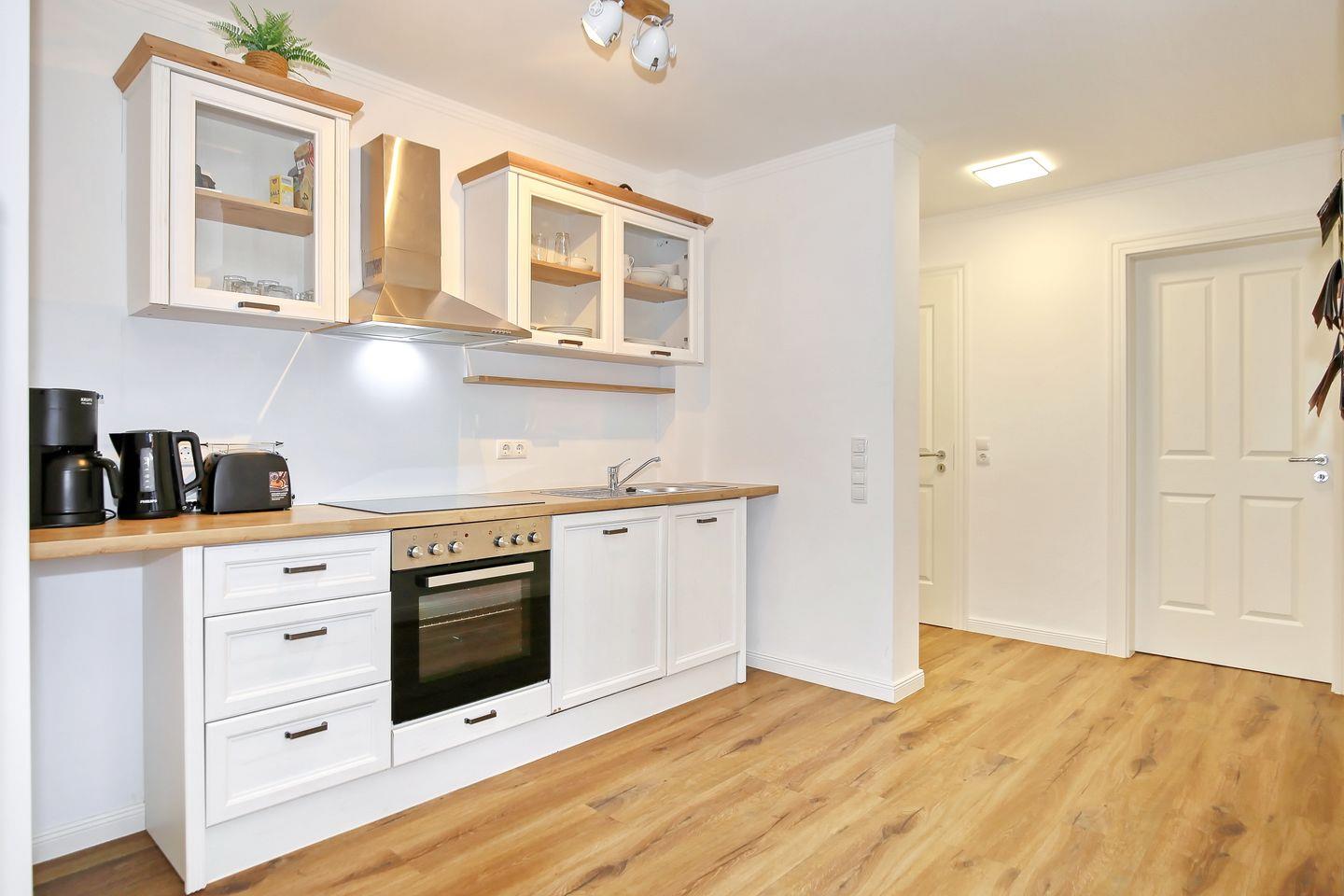 Die angrenzende offene Küchenzeile ist mit einem Kühlschrank mit Gefrierfach, einem Geschirrspüler, einem 4-Platten-Cerankochfeld und einem Backofen voll ausgestattet. Die Küchenausstattung wird komplettiert durch einen Toaster, eine Kaffeemaschine und einen Wasserkocher. Von hier aus hast du ebenfalls einen Blick auf die Ostsee.