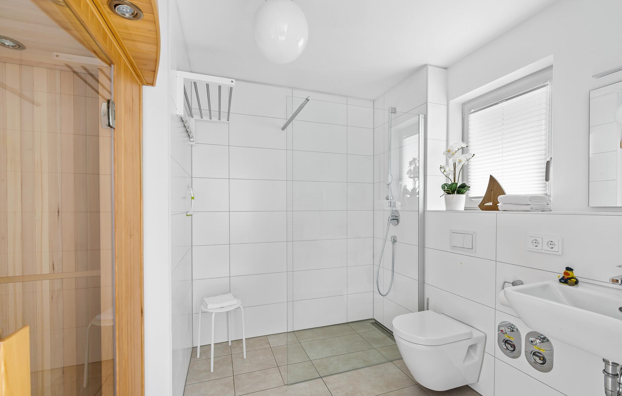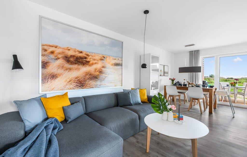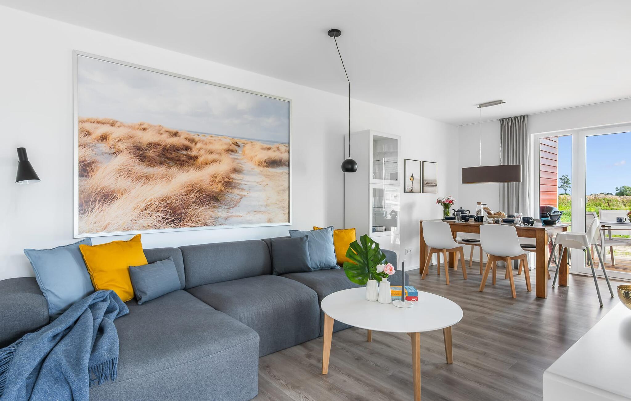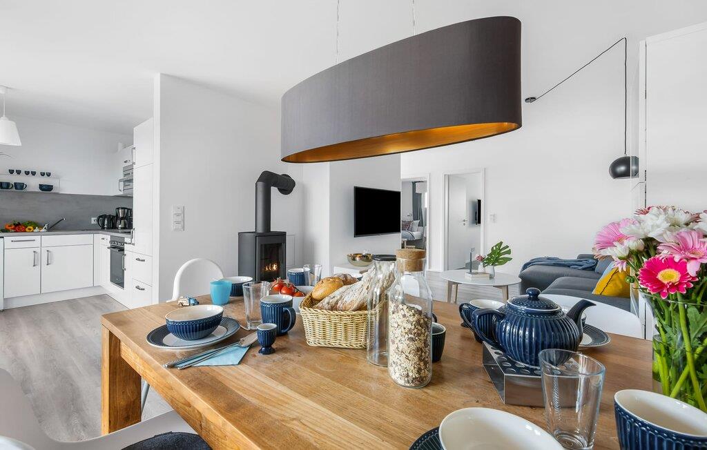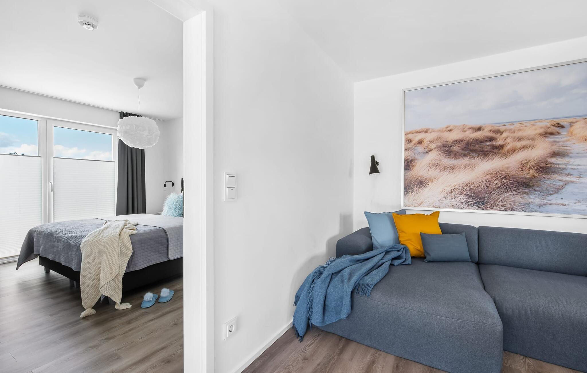 Drømmer I om en afslappende ferie ved Østersøen med hele familien? Så er COASTAL LOVE lige hvad I har brug for! I kan holde en skøn ferie her kun få minutters gang fra Weidefelds sandstrand, som har en kiosk og en rigtig hyggelig restaurant. Og hvis stranden ikke er jeres ting, er der en minigolfbane i nordisk stil i umiddelbar nærhed, som garanterer sjov for hele familien. Stranden er en smuk (næsten stenfri) sandstrand med et børnevenligt, større ståområde i starten. I højsæsonen overvåges dele af stranden af DLRG. KÜSTENLIEBE er indrettet i moderne skandinavisk stil, og den åbne og rummelige stue/alrum udstråler feriestemning fra første øjeblik. Det hyggelige sofahjørne med TV (via DVBT) og pejs inviterer til at dase eller spille spil sammen. I kan gennem vinduerne fra gulv til loft se ud til den tilstødende terrasse. Moderne havemøbler og en grill inviterer jer til at tilbringe selskabelige sommeraftener. Det indbyggede køkken lader intet tilbage at ønske, og kreativ madlavning bliver hurtigt en ny hobby her. Det store soveværelse er udstyret med en 1,80 m bred, komfortabel boxmadras. Det andet soveværelse kan tilpasses optimalt til beboernes behov som dobbeltseng eller med 2 enkeltsenge og en ekstra udtræksseng. Et legeområde med et malebord giver variation til de små gæster. Babyseng og barnestol er til rådighed i huset! På badeværelset, som er udstyret med alt hvad I behøver for at have det godt, venter den infrarøde kabine på jer til et omfattende forkælelsesprogram efter lange gåture på stranden. Den tærskelfri bruser fra gulv til loft lader intet tilbage at ønske efter et besøg på stranden. For at bade selv de mindste gæster er der også et babybadekar, der kan placeres i bruseren. I bliver også forkælet med to parkeringspladser foran huset. Og cykling er næsten obligatorisk i dette smukke område - I vil elske de brede kyster! Vores favoritsted: På terrassen bag huset, lytte til mågerne, der skriger i de behagelige afslappende stole og ser de lokale fugle i parken. Ren afslapning! Bemærk venligst: OstseeResort Olpenitz er meget populært, og der bygges fortsat i parken. Ikke desto mindre kan I se frem til en 5-stjernet standard og et førsteklasses ophold. Byggeaktiviteterne kommer ikke til at forstyrre jer på ferien, og derfor gives der ikke yderligere afslag i prisen.