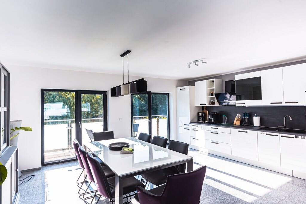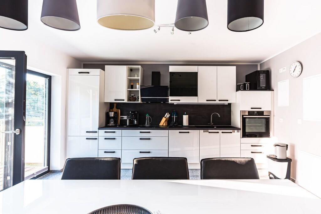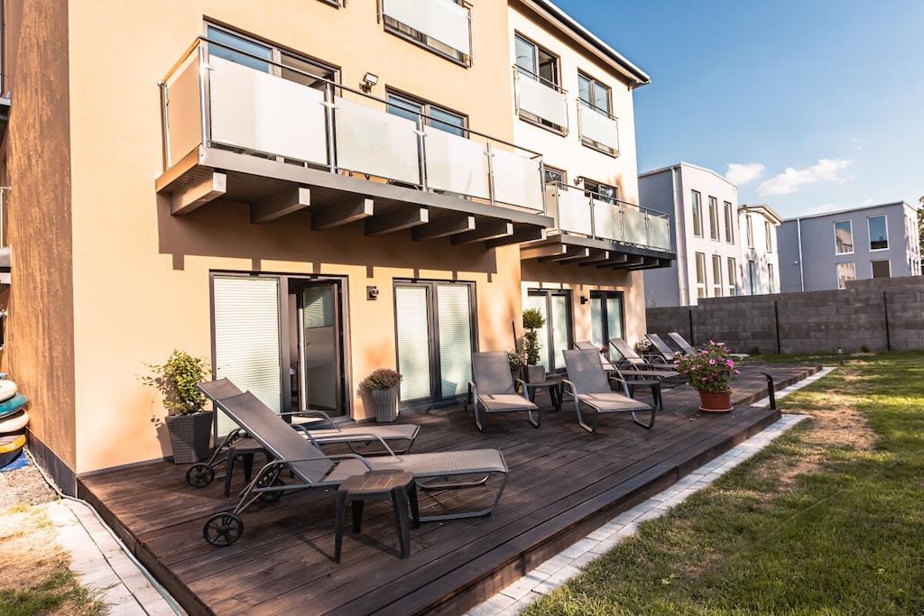 Lagunenhaus Joy für 6 Erwachsene plus 2 Zusatzschlafplätzen 160 qm - 3 Etagen 3 Schlafzimmer, 1 Durchgangsschlafzimmer (4 Doppelbetten) 2 Bäder mit Dusche offener Wohnbereich mit Küche und Essbereich Sonnenterasse mit Liegen im EG teils überdachte Terrasse mit großem Esstisch und zusätzlichen Loungemöbeln überdachte, möblierte Terrasse im 2. OG Carport und Stellplatz Seezugang Steg über die Strasse Nutzung inklusive: Geschirrspüler – Waschmaschine – Kajak (3 Pers.) – 4 Standup-Paddeling-Boards