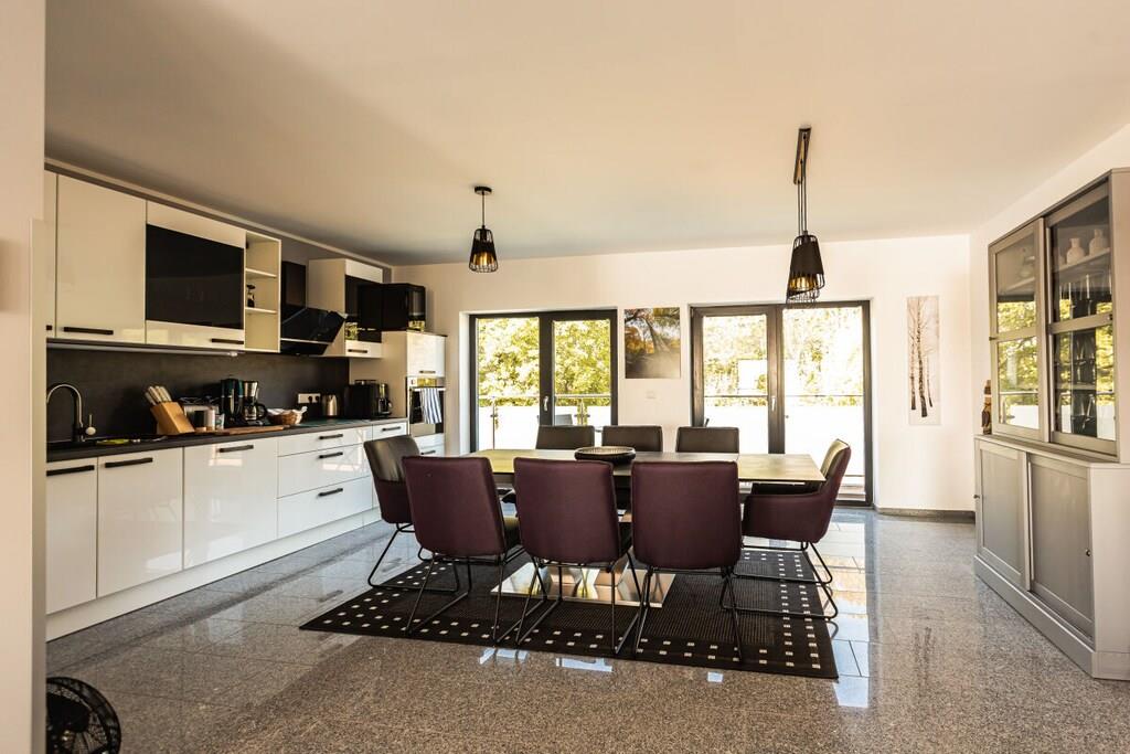 Für 6 Erwachsene plus 2 Zusatzschlafplätzen 160 qm - 3 Etagen 3 Schlafzimmer, 1 Durchgangsschlafzimmer (4 Doppelbetten) 2 Bäder mit Dusche offener Wohnbereich mit Küche und Essbereich Sonnenterasse mit Liegen im EG teils überdachte Terrasse mit großem Esstisch und zusätzlichen Loungemöbeln überdachte, möblierte Terrasse im 2. OG Carport und Stellplatz Seezugang Steg über die Strasse Nutzung inklusive: Geschirrspüler – Waschmaschine – Kajak (3 Pers.) – 4 Standup-Paddeling-Boards
