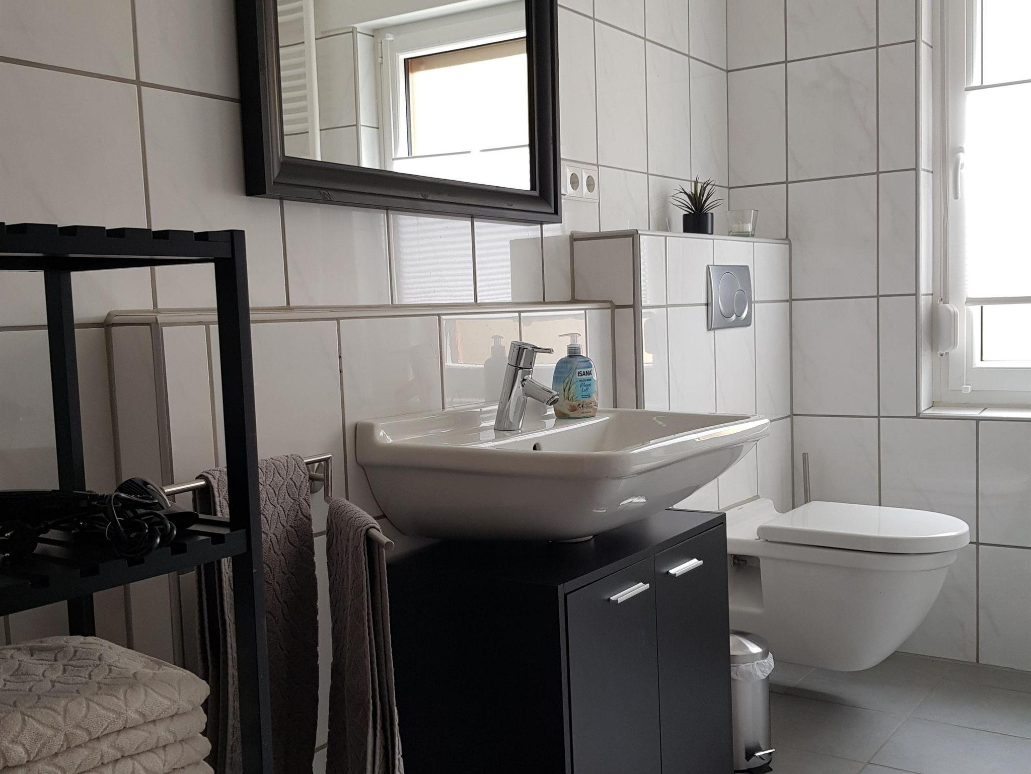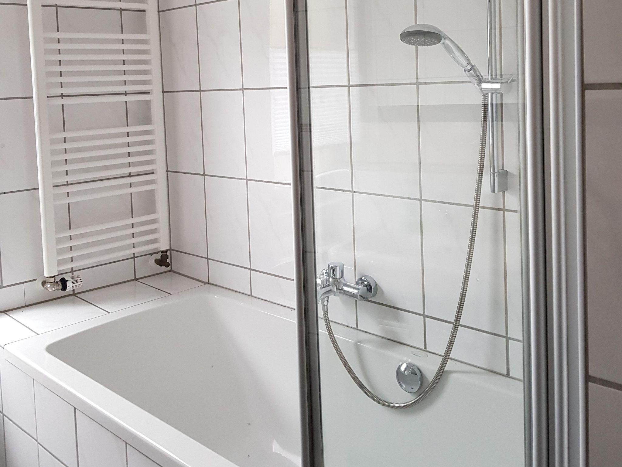 Im Tageslichtbad erwartet Sie eine große Badewanne, die durch eine ausfaltbare Glasabtrennung auch als Dusche genutzt werden kann.