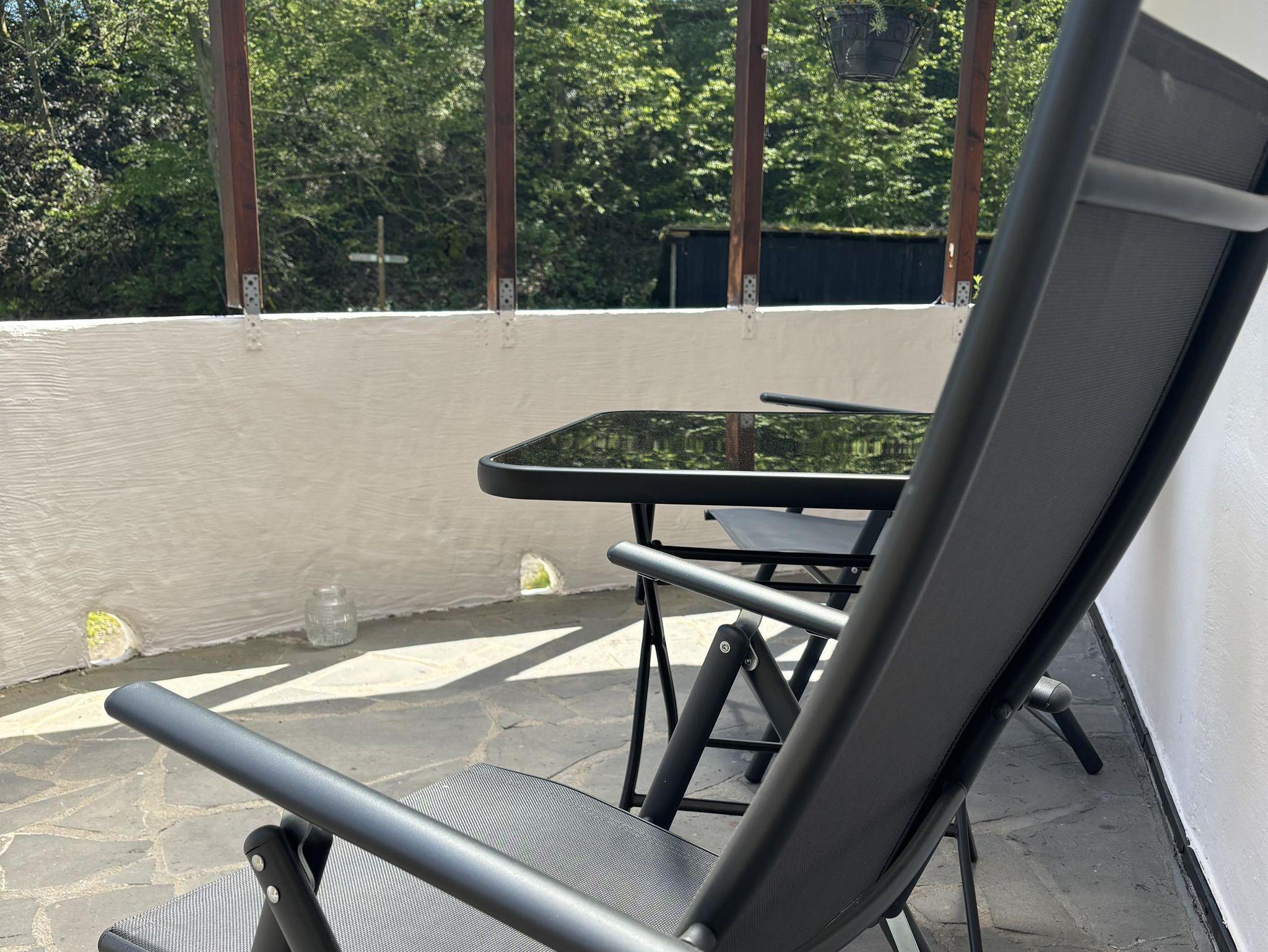 Der großzügige Wohn-/Essbereich lädt zum Verweilen ein und hat einen direkten Zugang zur überdachten Veranda, die sich ideal für gemütliche Stunden im Freien eignet, mit herrlicher Aussicht auf den Brohlbach und die „Stegwiese Das Wohn-/Esszimmer ist mit großem Esstisch, einer bequemen Couchgarnitur, die auch zum Schlafen genutzt werden kann, und einem Smart-TV ausgestattet.