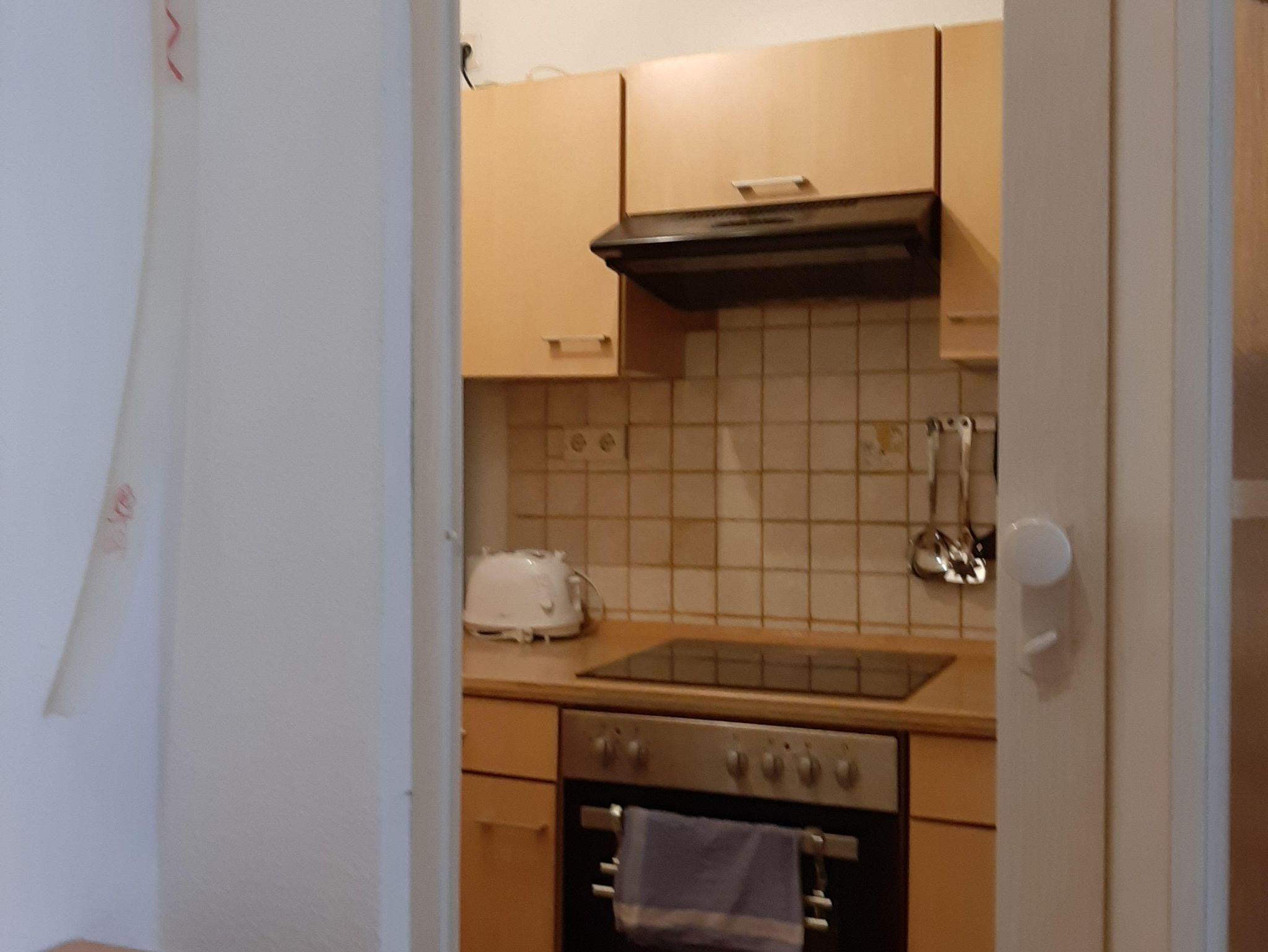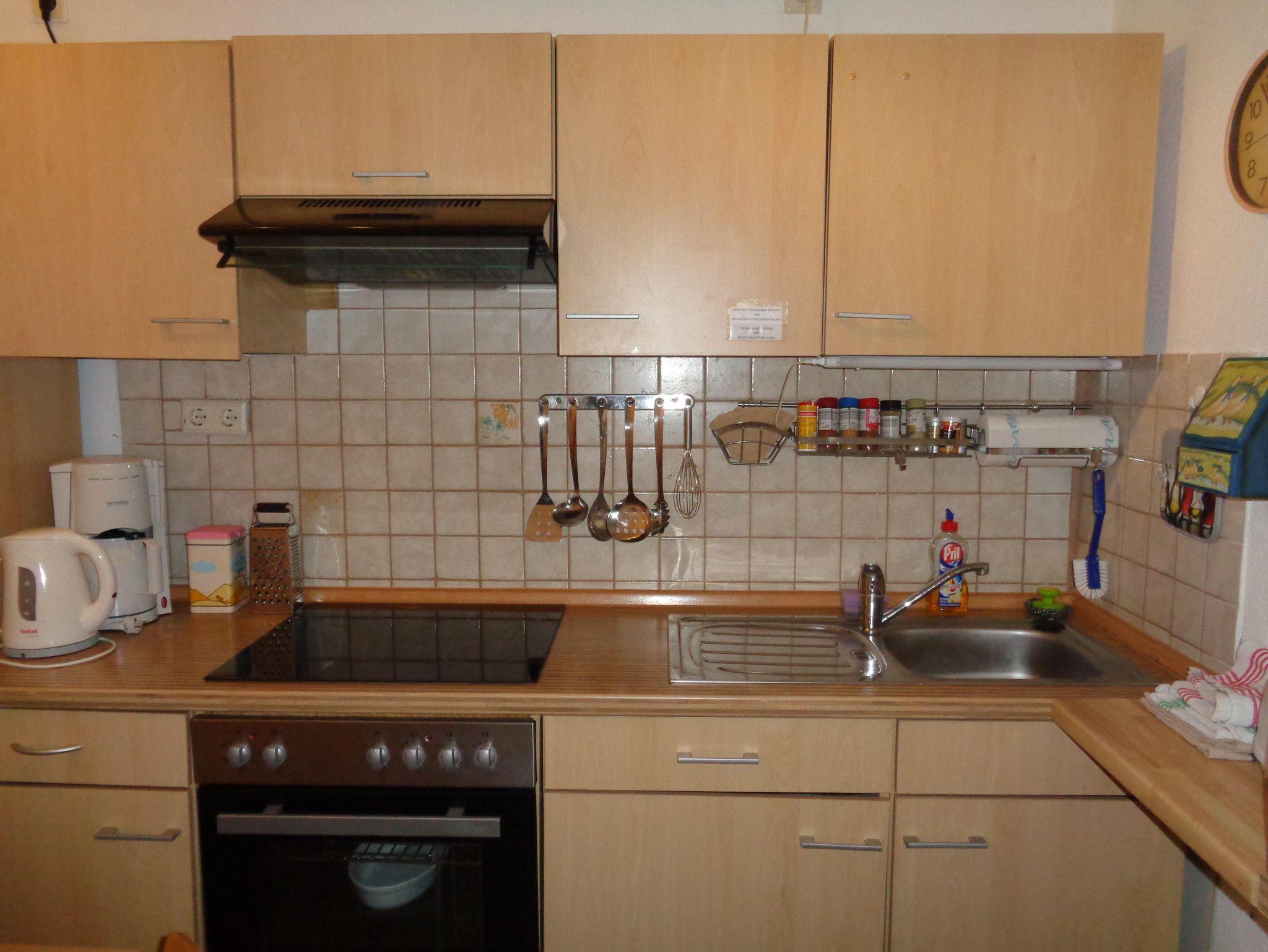 In der Wohnung befindet sich eine kleine Einbauküche (ca. 5 qm), ausgestattet mit Kühlschrank/ Gefrierfach, Elektroherd mit Ceranfeld und Backofen, Spüle, Tisch und 2 Stühle, Mikrowelle, Kaffeemaschine, Wasserkocher und Toaster.