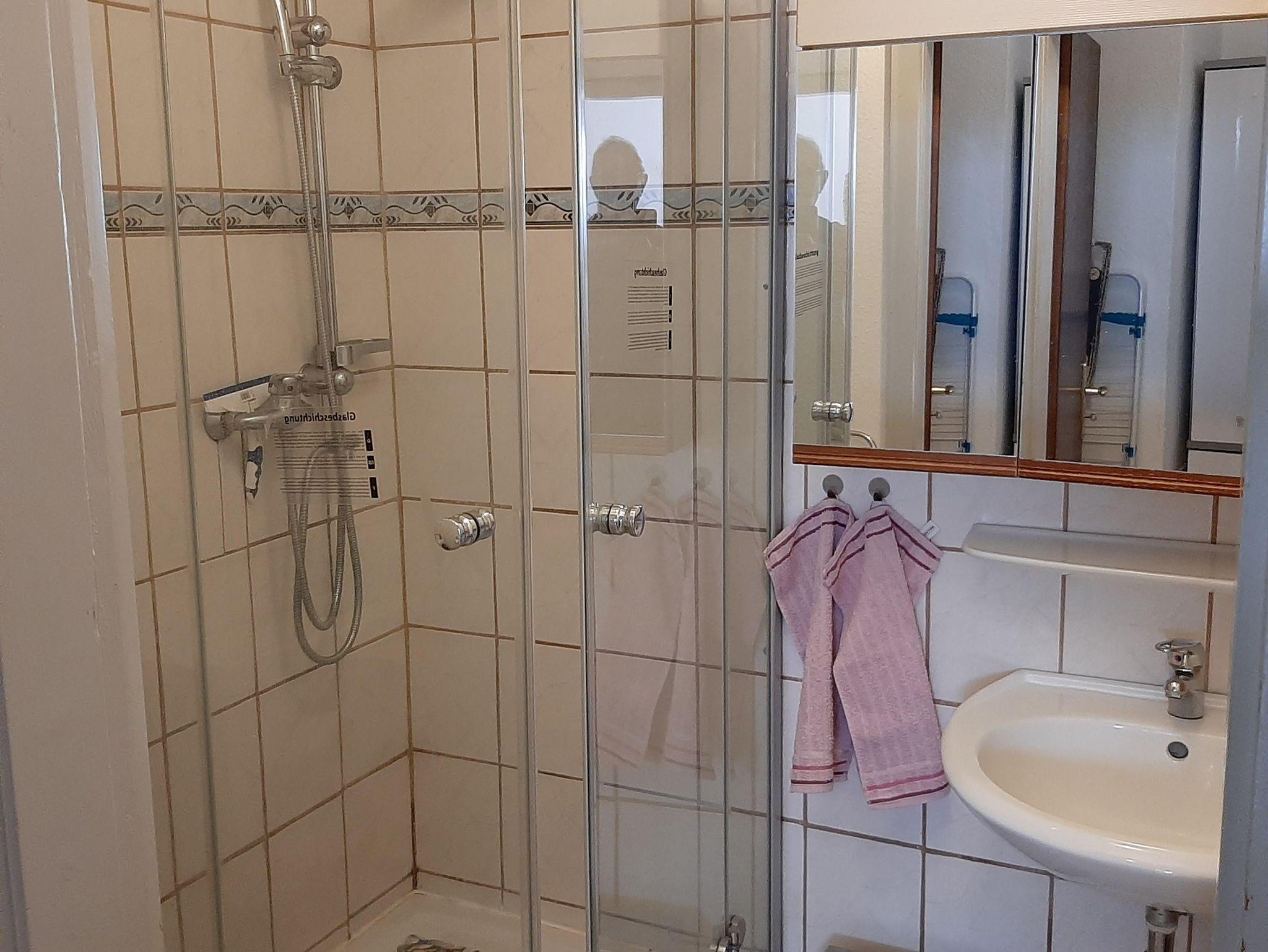 Das kleine Bad (ca. 3 qm) verfügt über eine Dusche, WC, Waschbecken, Spiegelschrank und Waschmaschine. Föhn, Dusche- und Handtücher.
