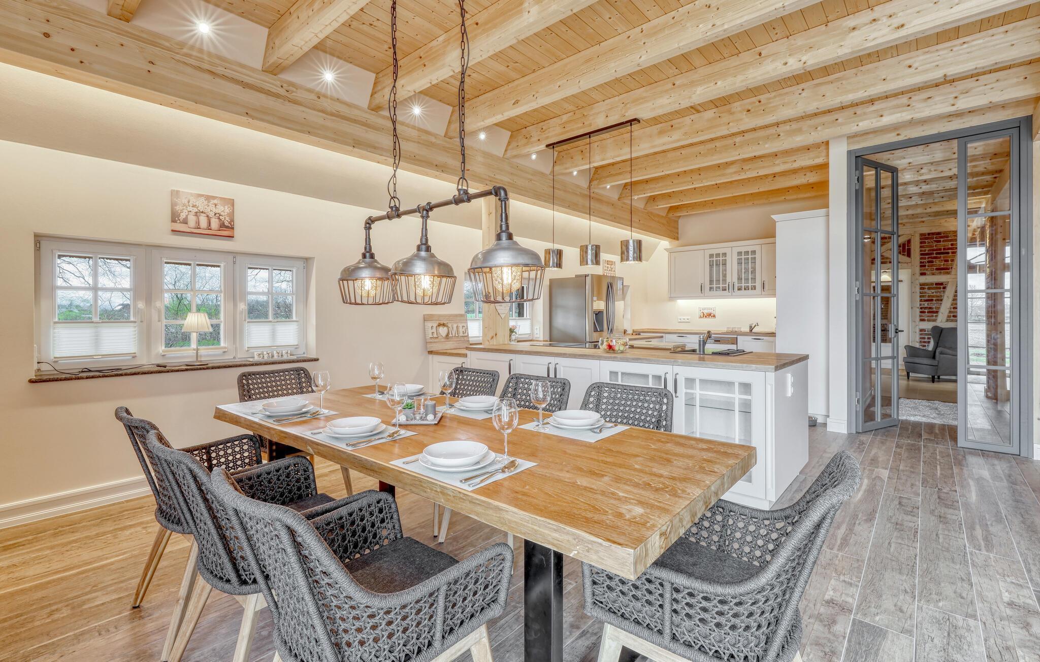 Dette skønne feriehus giver jer en luksuriøs pause i landlige omgivelser. Nyd naturens vidder, langt væk fra den travle hverdag. Indenfor finder I et rummeligt opholdsområde med en komfortabel sofa, træloft og moderne belysningsaccenter. Det naturlige design med varmt træ skaber en særlig indbydende atmosfære. Slap af med en filmaften eller tilbring omgængelige timer i det åbne spiseområde. Gør retterne klar i det højkvalitets køkken med kogeø og stilfuld belysning. børnene kan slippe dampen i aktivitetsområdet med bordtennisbord og bordfodbold.