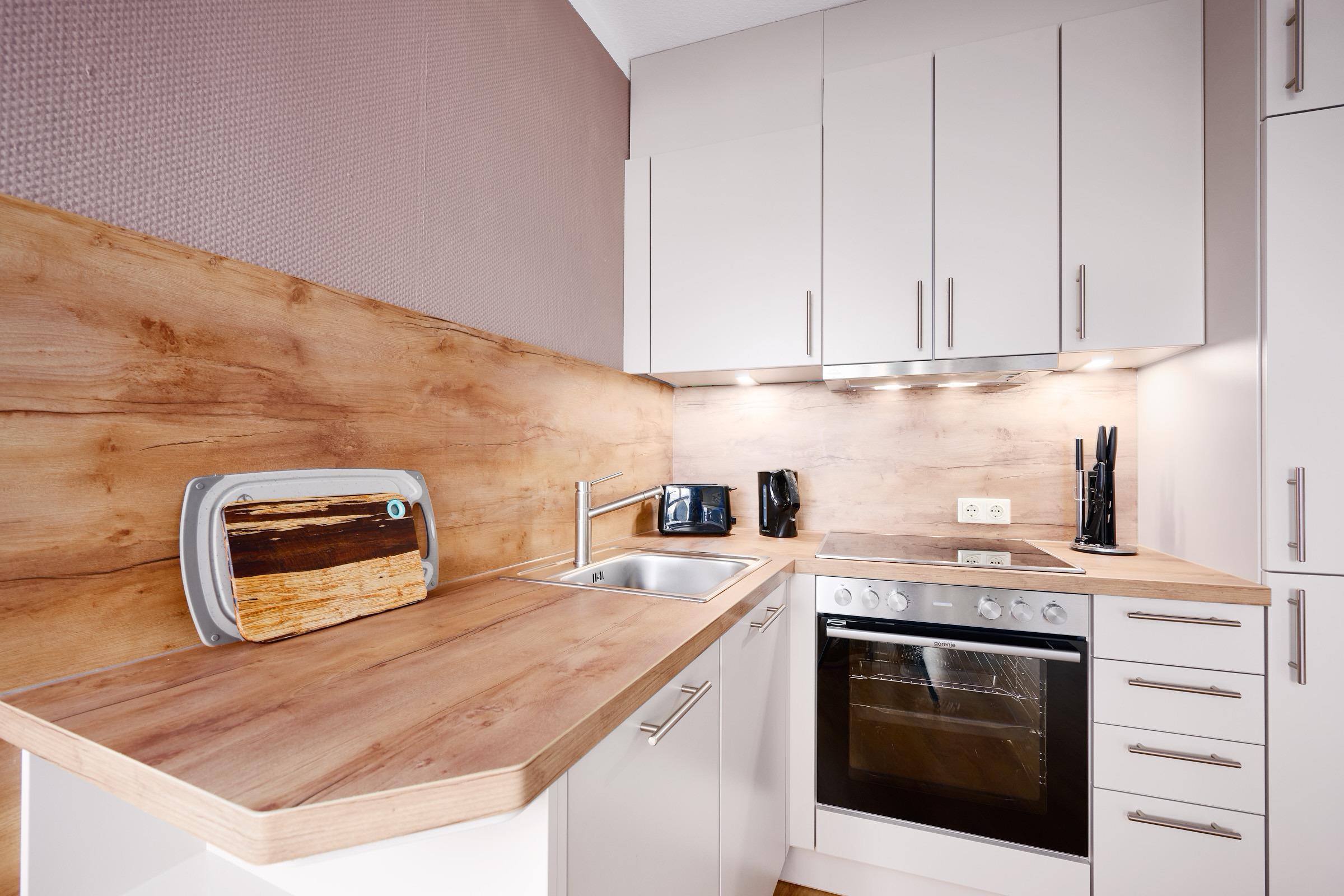 Der helle Wohnbereich lädt mit einem komfortablen Sofa und Fernseher zu entspannten Stunden ein. Von hier gelangen Sie direkt auf den Balkon, der Ihnen mit gemütlichen Sitzmöglichkeiten einen wunderbaren Platz zum Verweilen bietet. Die offene Küche ist mit Backofen, Geschirrspülmaschine, Kühlschrank, Cerankochfeld und Kaffeemaschine bestens ausgestattet und grenzt an den Essbereich, der zum gemeinsamen Genießen Ihrer Mahlzeiten einlädt. Im Schlafzimmer mit Meerblick sorgt ein bequemes Doppelbett (ca. 160x200 cm) für erholsamen Schlaf. Das moderne Badezimmer verfügt über eine ebenerdige Dusche und WC.