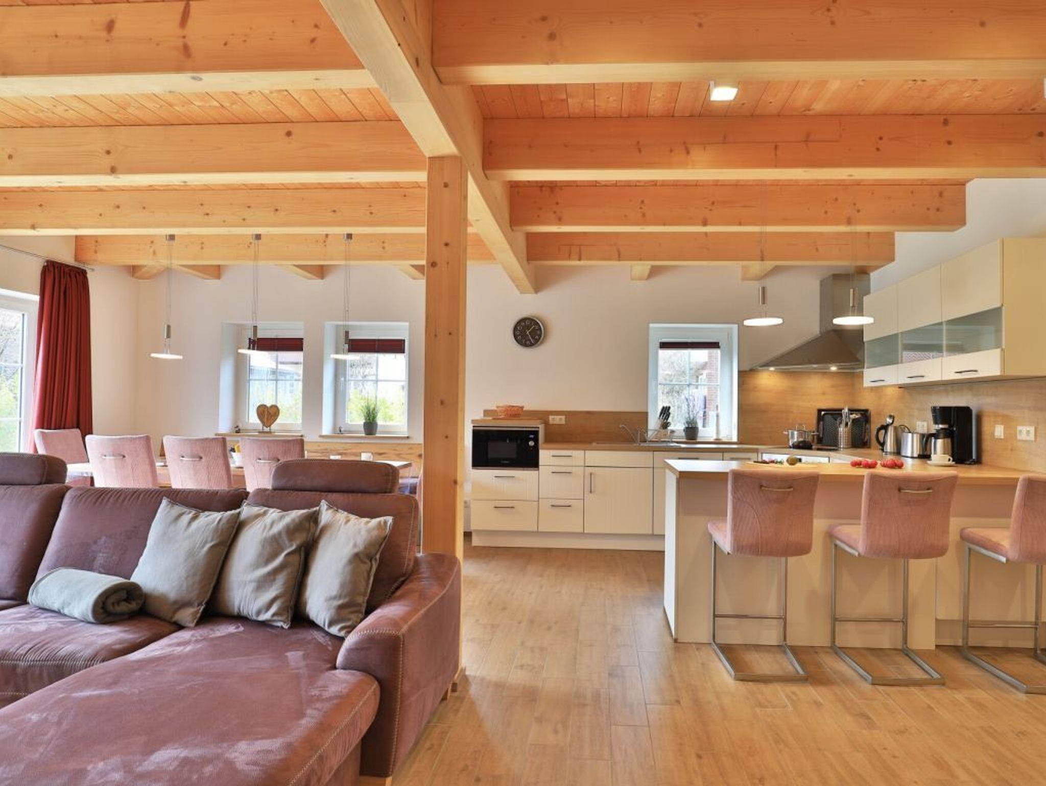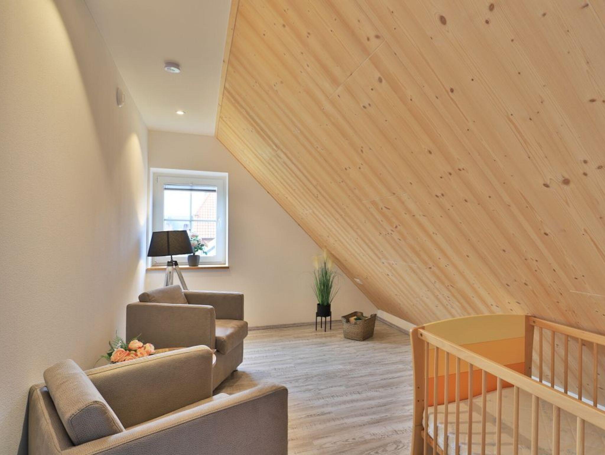 Die Möblierung im Erdgeschossbereich ist stilvoll. Eine Sofalandschaft lädt zur Auszeit am wohligen Kaminofen ein. Fernseher, Musikanlage und auch kostenfreie WLAN-Nutzung sind vorhanden. Vom Wohnbereich gelangen Sie eine saisonal möblierte Terrasse in süd-/westliche Ausrichtung. Der große Garten ist ideal für Kinder und bietet zudem eine Grillmöglichkeit. Die offene Küche ist in den Wohnbereich integriert und verfügt über ein Induktionskochfeld, Backofen, Mikrowelle, Kühlschrank, Gefrierschrank, Kaffeemaschine, Toaster, Wasserkocher, Geschirrspüler u.v.m. Ihre zubereiteten Mahlzeiten nehmen Sie an einem großen Esstisch zu sich. Bei schönem Wetter, bestimmt auch gerne auf der Terrasse mit Blick in den Garten. Eines der separaten Komfort- Schlafzimmer befindet sich auf der Wohnebene. Dieses Schlafzimmer ist mit einem Doppelbett, TV und einem eigenen Bad mit ebenerdiger Dusche ausgestattet. Auch ein Hauswirtschaftsraum mit kostenfreier Waschmaschine & Wäschetrocknernutzung sowie ein Gäste-WC sind im Erdgeschoss vorhanden.