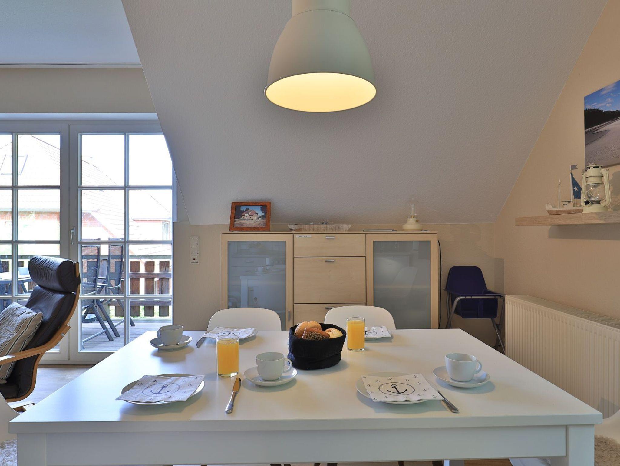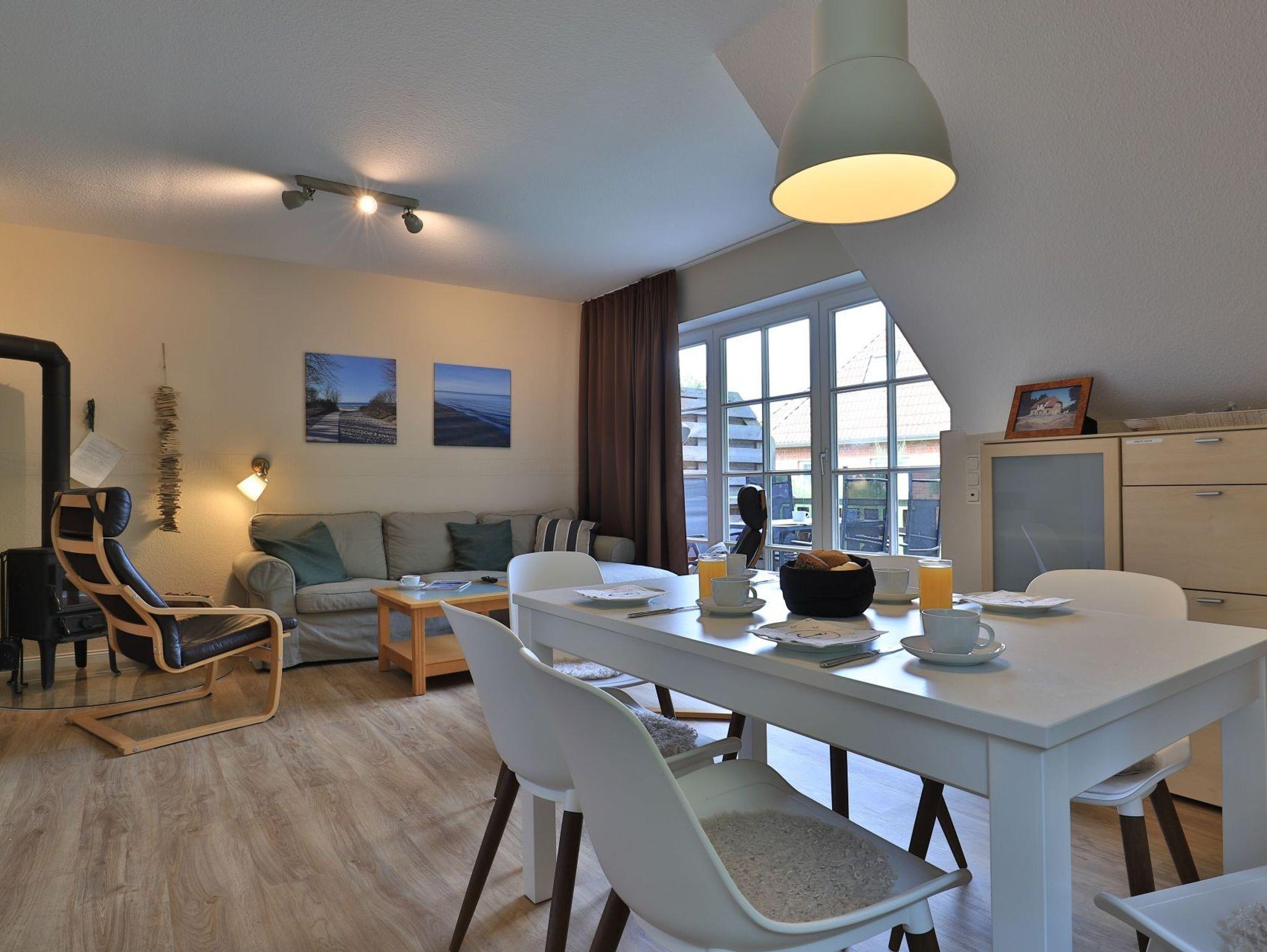 Die geräumige Wohnfläche von 65qm empfängt Sie mit einem behaglich eingerichteten Wohn-/Essbereich mit Kaminofen, Sofa, Lesesessel, Flachbild TV, Musikanlage sowie Balkon. Am großen Esstisch nehmen Sie Ihre Mahlzeiten ein, die Sie zuvor in der gut ausgestatteten Wohnküche zubereitet haben.