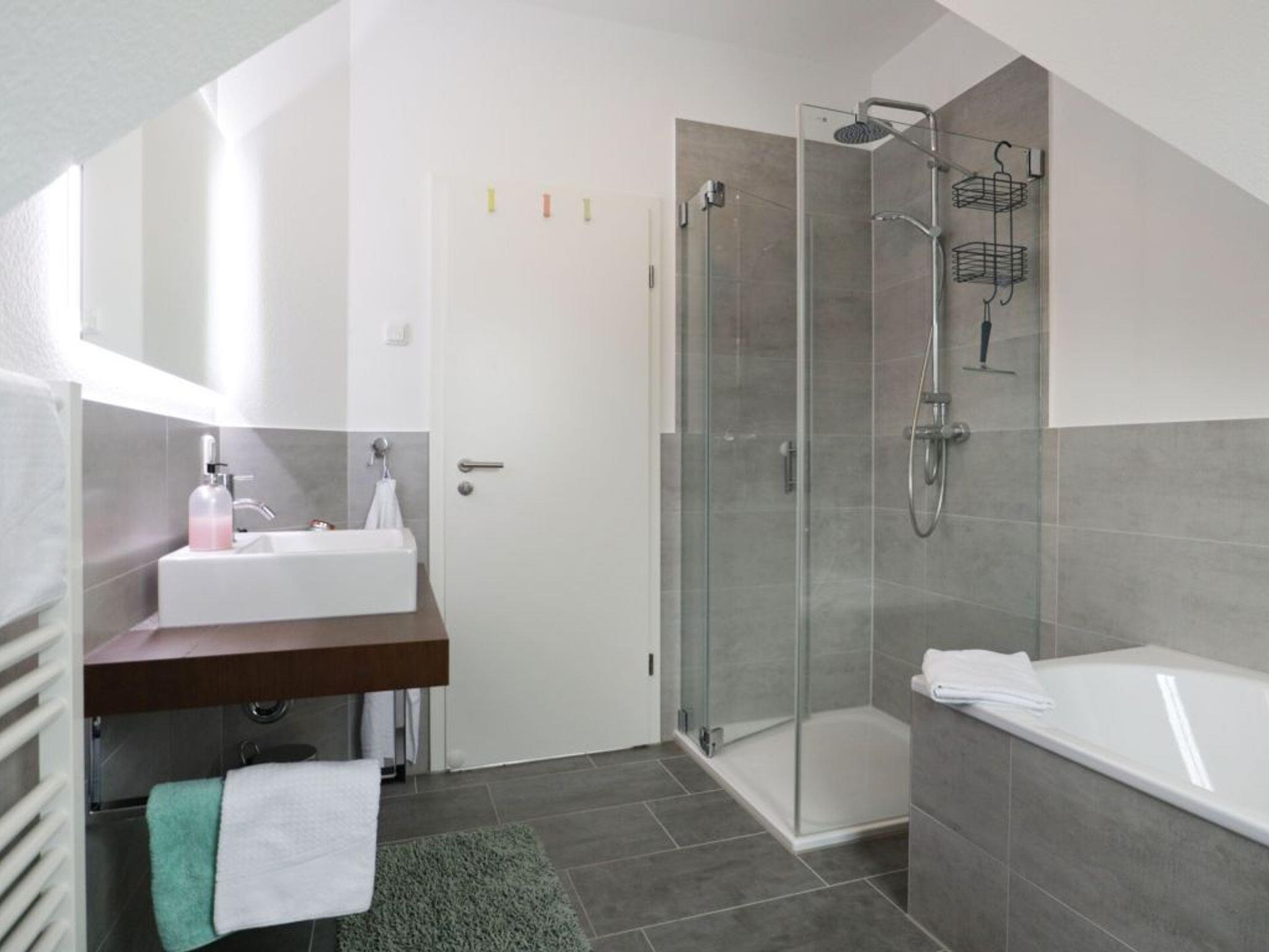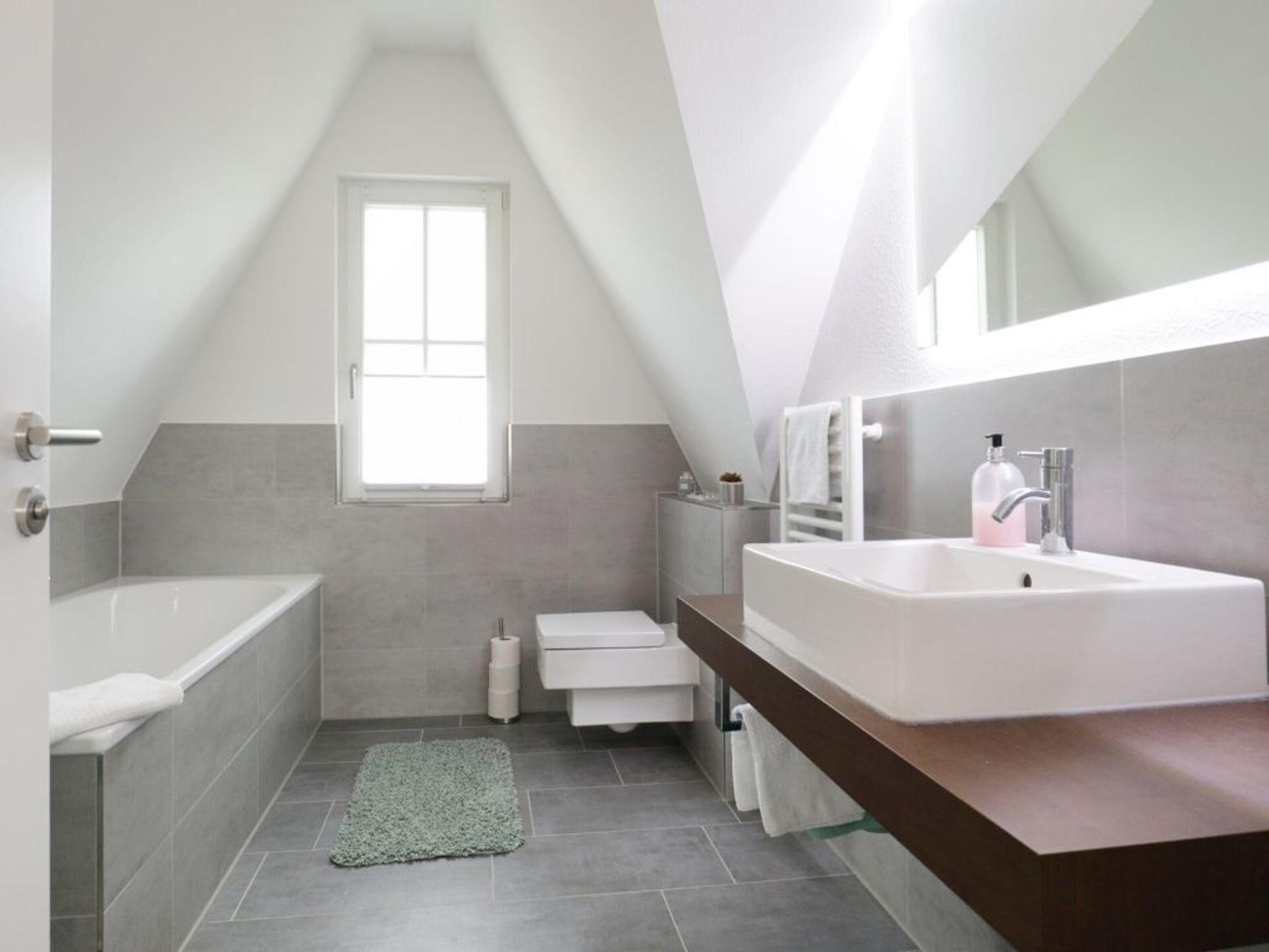 Badewanne, ebenerdiger Dusche, Waschtisch und WC.