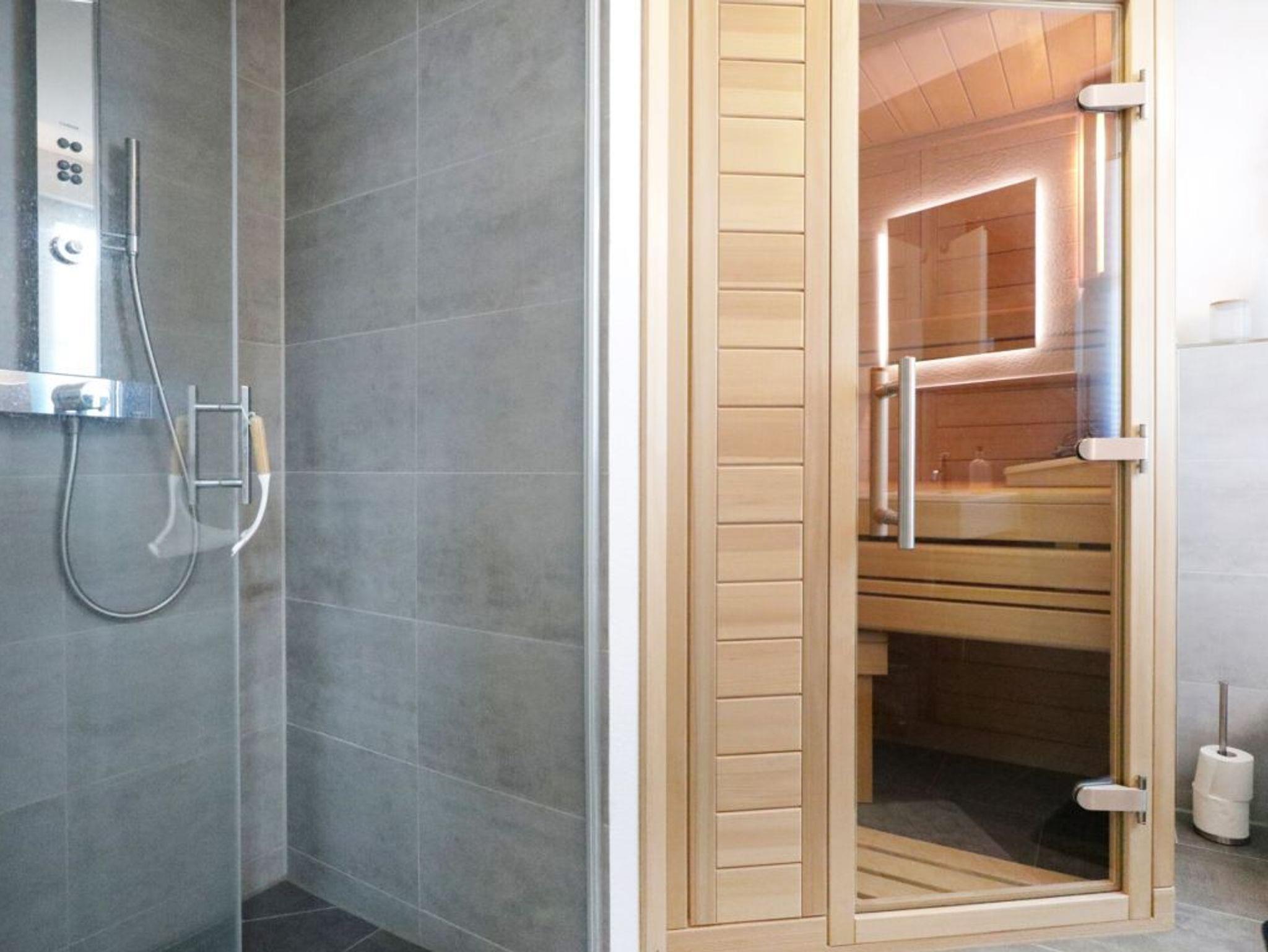 Wellnessbad mit Sauna (gegen Gebühr), Dusche, WC.