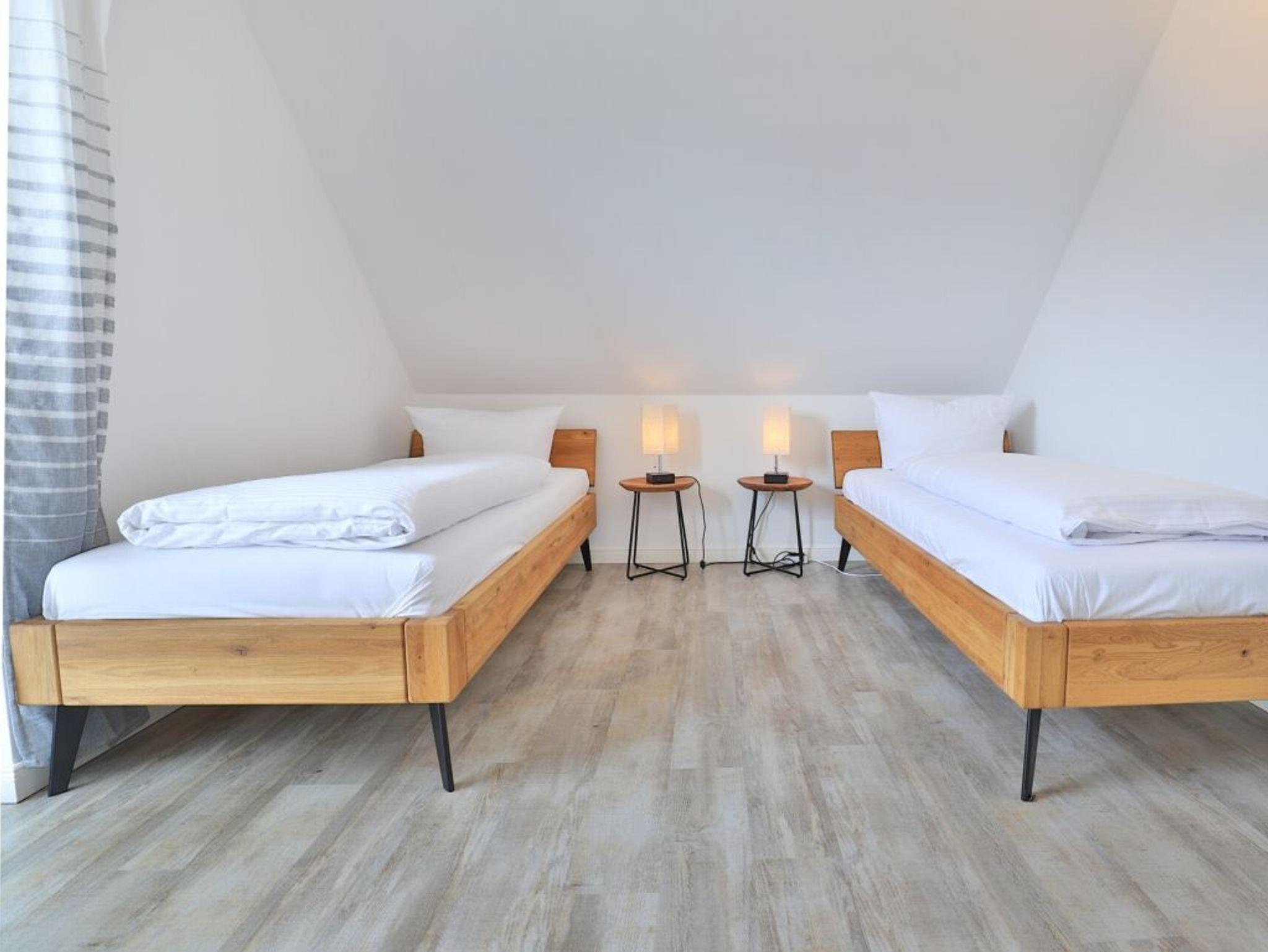 Über eine Treppe im Eingangsflur gelangen Sie in die obere Etage, wo sich zwei weitere Komfort Schlafzimmer befinden. 1x mit Doppelbett, Kleiderschrank, TV sowie Balkonzugang mit Blick über die Felder, 1x mit zwei Einzelbetten, Kleiderschrank und TV. Idealerweise besitzt auch diese Etage ein großzügiges Tageslicht Badezimmer mit Eckbadewanne, bodengleicher Dusche, zwei Waschtische und WC.