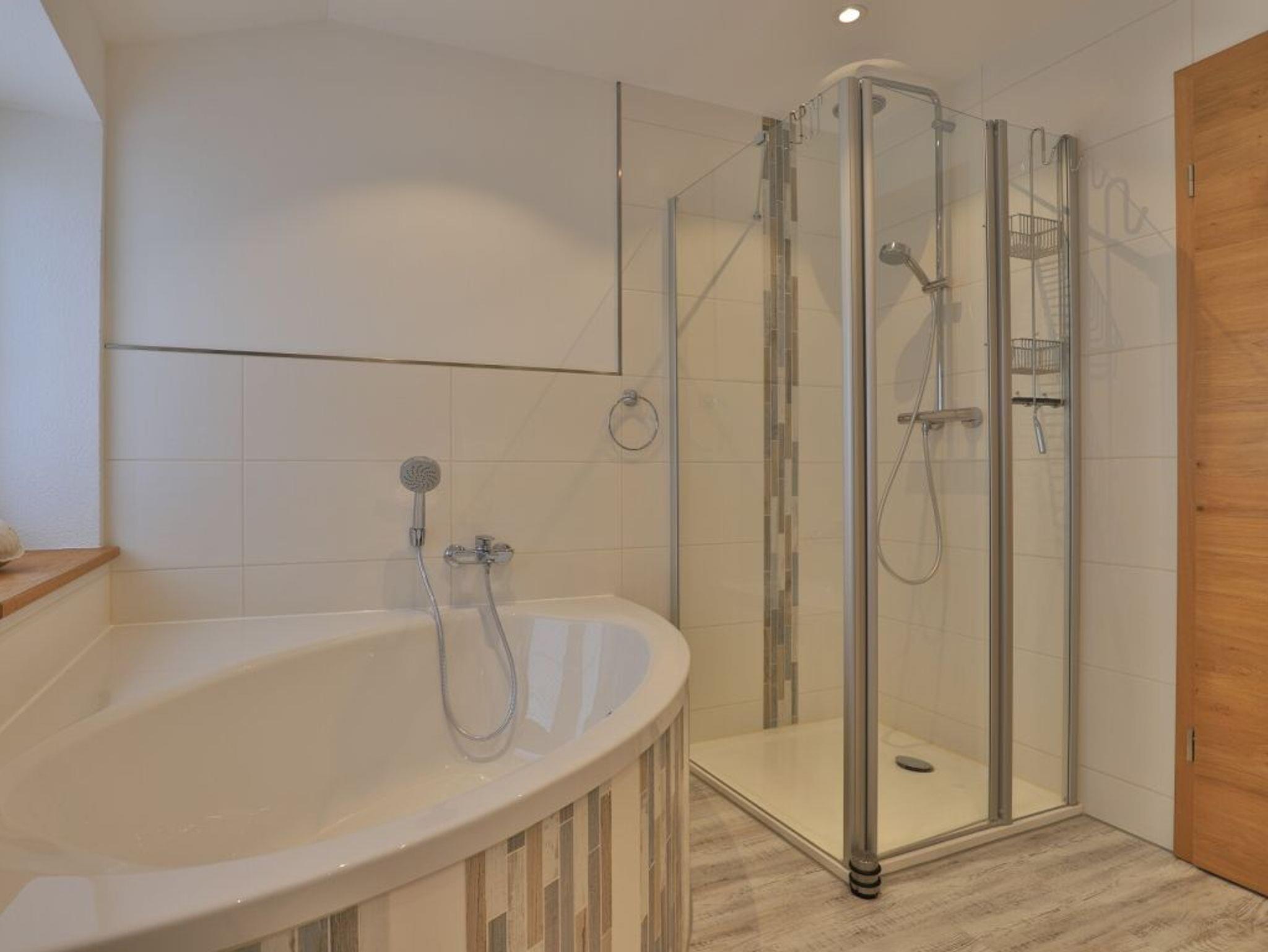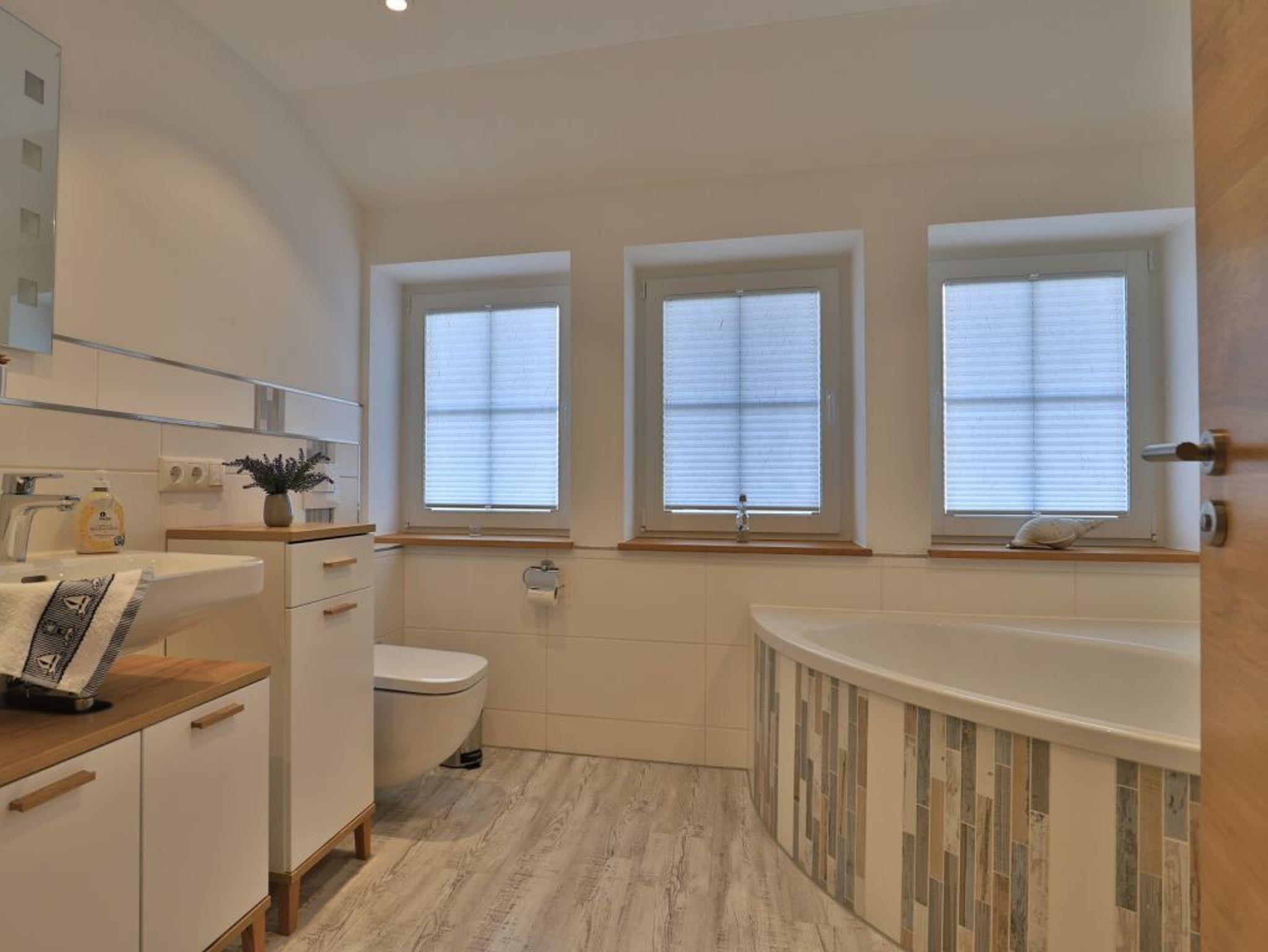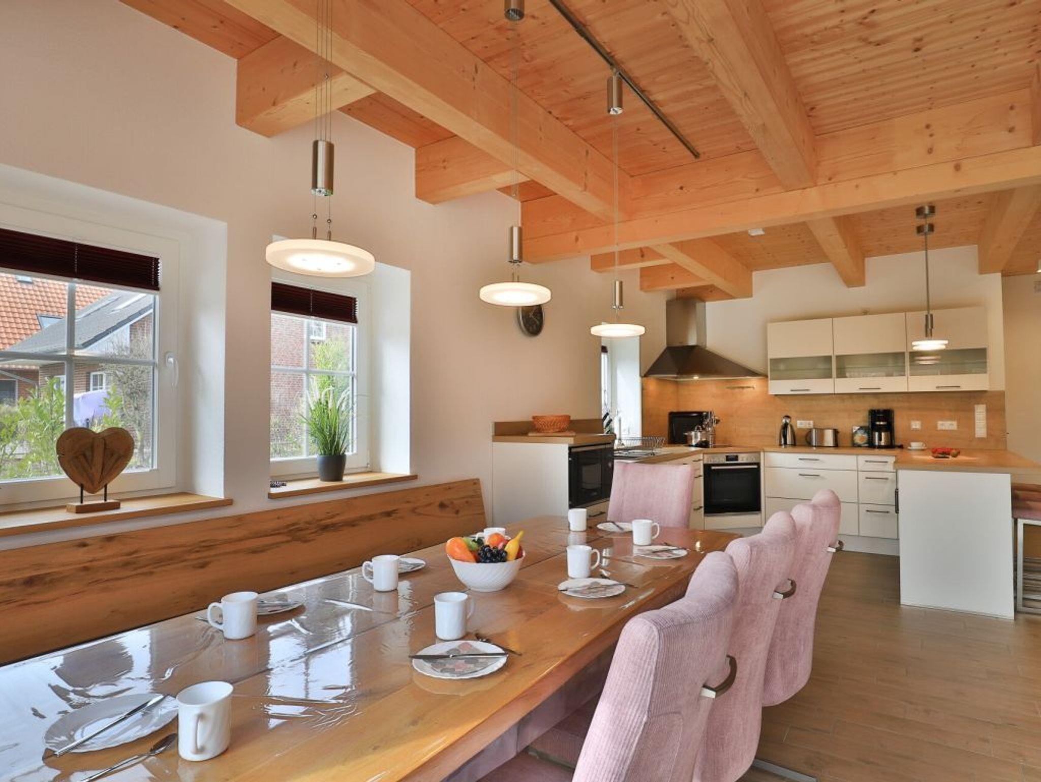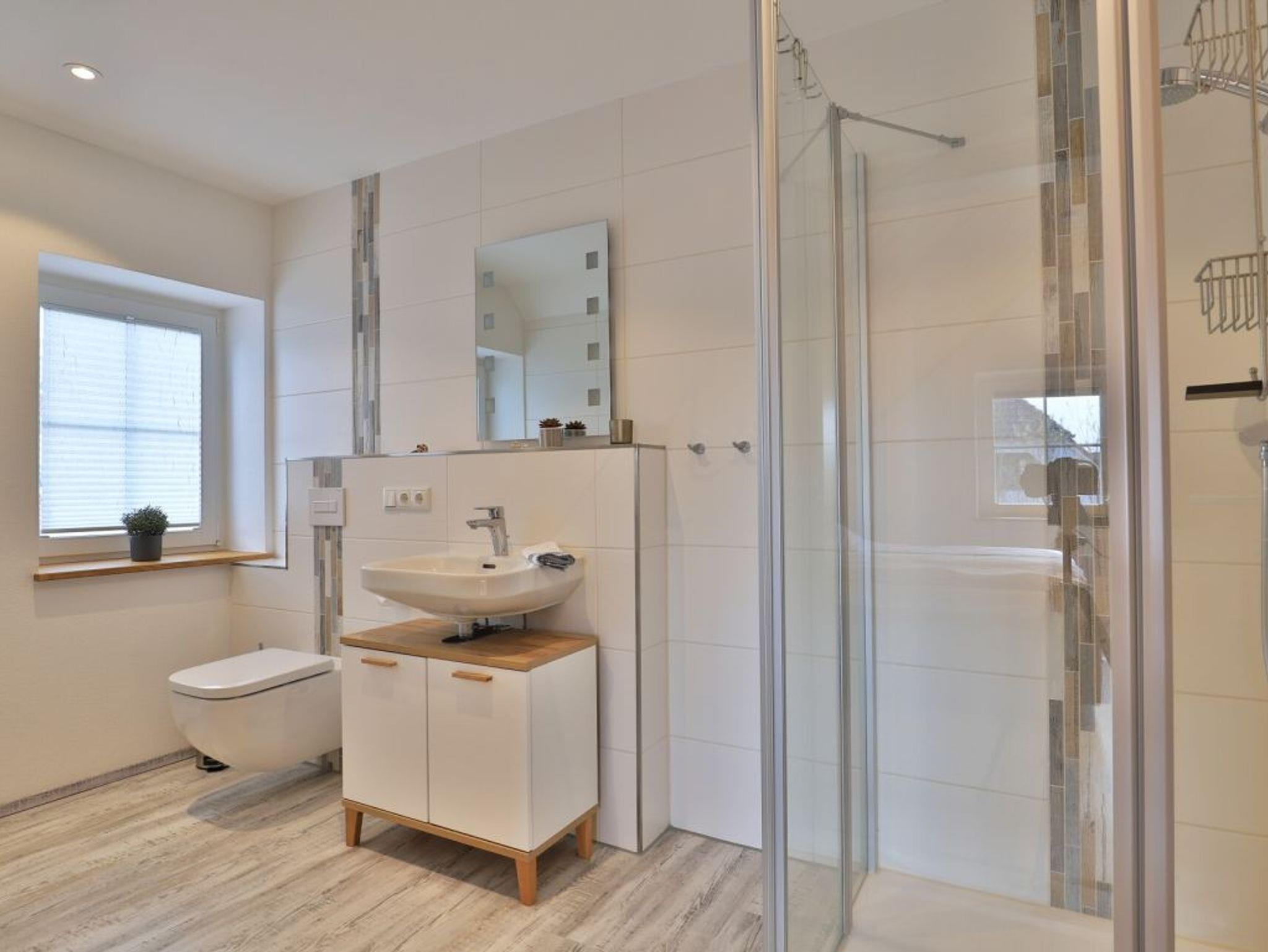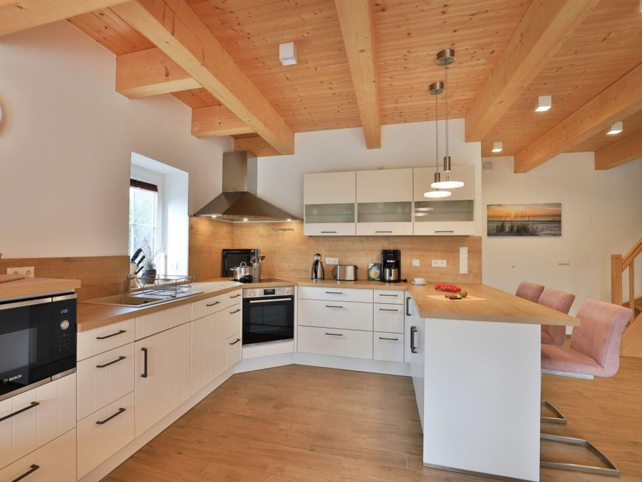 Die Möblierung im Erdgeschossbereich ist stilvoll. Eine Sofalandschaft lädt zur Auszeit am wohligen Kaminofen ein. Fernseher, Musikanlage und auch kostenfreie WLAN-Nutzung sind vorhanden. Vom Wohnbereich gelangen Sie eine saisonal möblierte Terrasse in nord-/ost Ausrichtung. Der große Garten ist ideal für Kinder und bietet zudem eine Grillmöglichkeit. Die offene Küche ist in den Wohnbereich integriert und verfügt über ein Induktionskochfeld, Backofen, Mikrowelle, Kühlschrank, Gefrierschrank, Kaffeemaschine, Toaster, Wasserkocher, Geschirrspüler u.v.m. Ihre zubereiteten Mahlzeiten nehmen Sie an einem großen Esstisch zu sich. Bei schönem Wetter, bestimmt auch gerne auf der Terrasse mit Blick in den Garten. Eines der separaten Komfort- Schlafzimmer befindet sich auf der Wohnebene. Dieses Schlafzimmer ist mit einem Doppelbett, TV und einem eigenen Bad mit ebenerdiger Dusche ausgestattet. Auch ein Hauswirtschaftsraum mit kostenfreier Waschmaschine & Wäschetrocknernutzung sowie ein Gäste-WC sind im Erdgeschoss vorhanden.