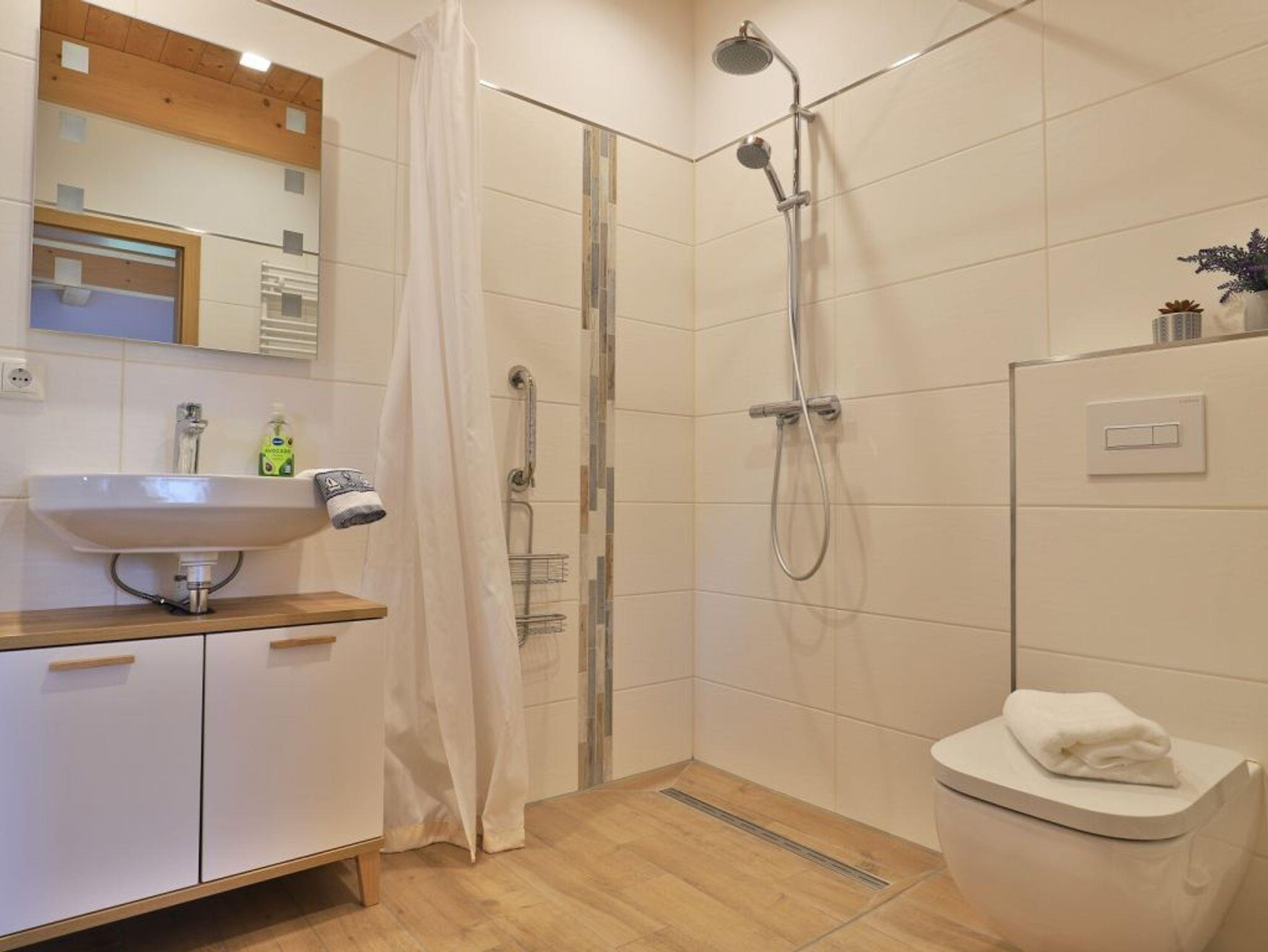 Eine Treppe führt in das Obergeschoss, wo sich zwei weitere Schlafzimmer mit zwei eigenen Bädern befinden. Eines der Schlafbereiche besitzt ein Doppelbett, Fernseher, Duschbad mit Waschtisch, WC. Das weitere, sehr geräumige Familienschlafzimmer bietet ein Doppelbett, ein Schlafsofa ideal für Kinder (160cm x 200cm) und ist zudem mit einem modernen Tageslicht Badezimmer mit Eckbadewanne, Dusche, Waschtisch und WC ausgestattet.
