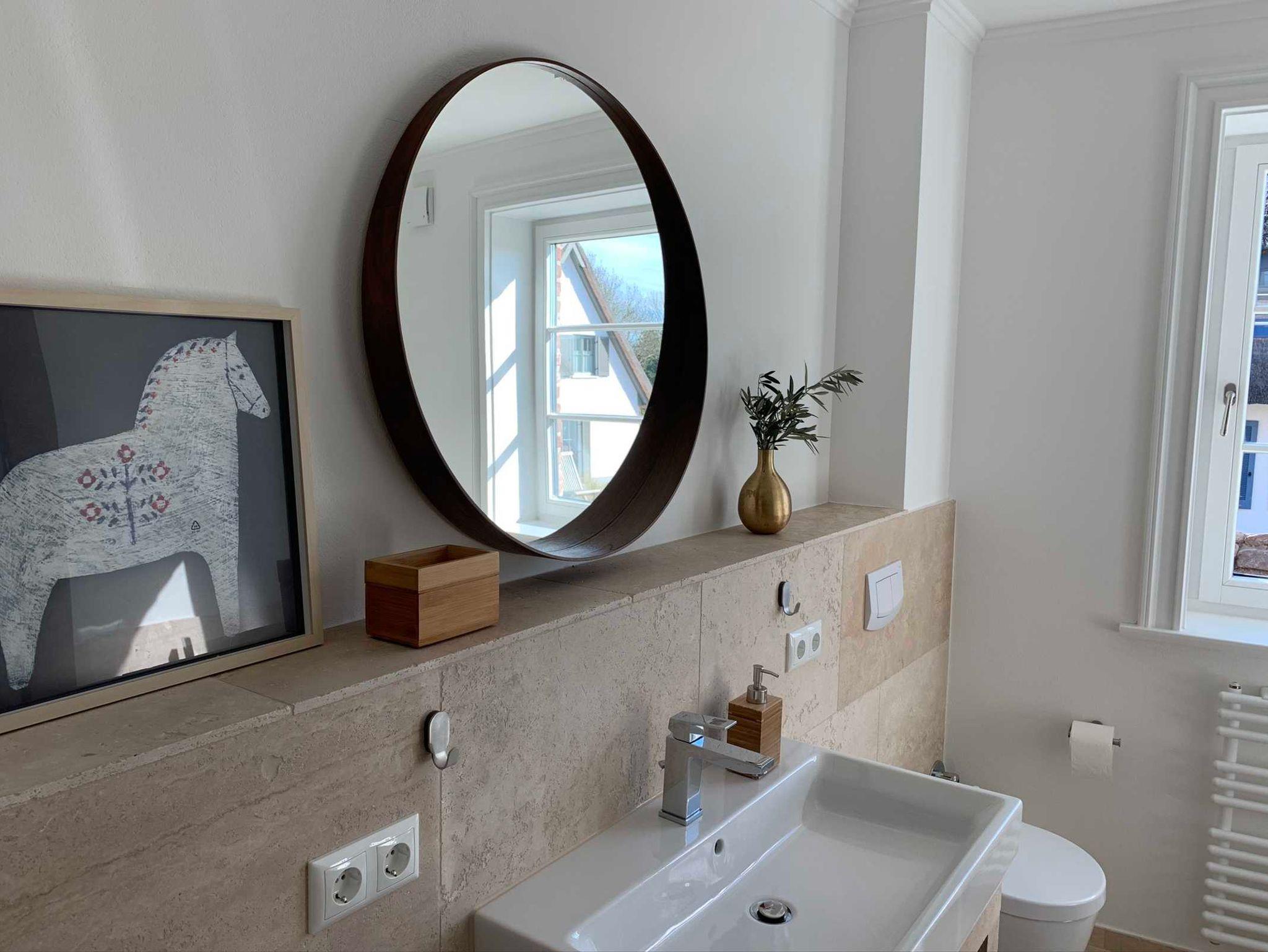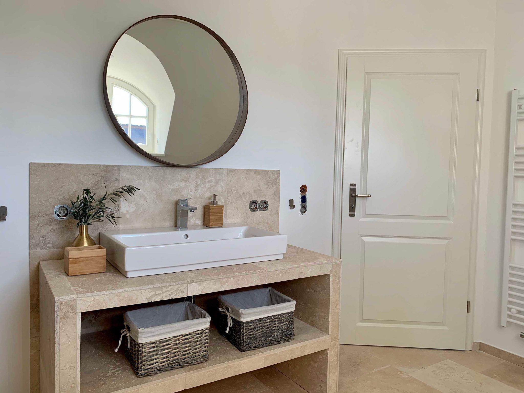 gemütliche und entspannende Stunden. Das Badezimmer mit Waschtisch, großer