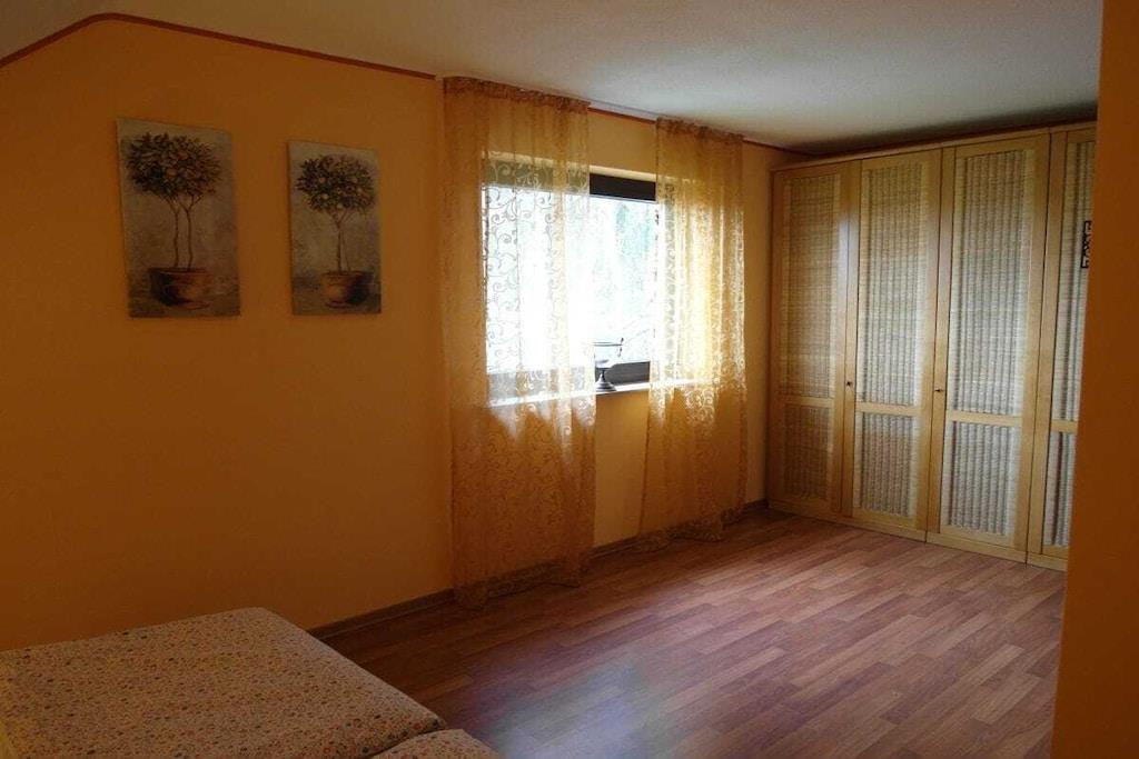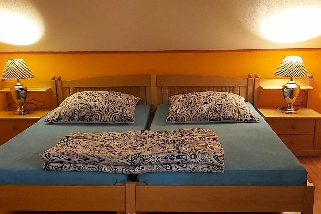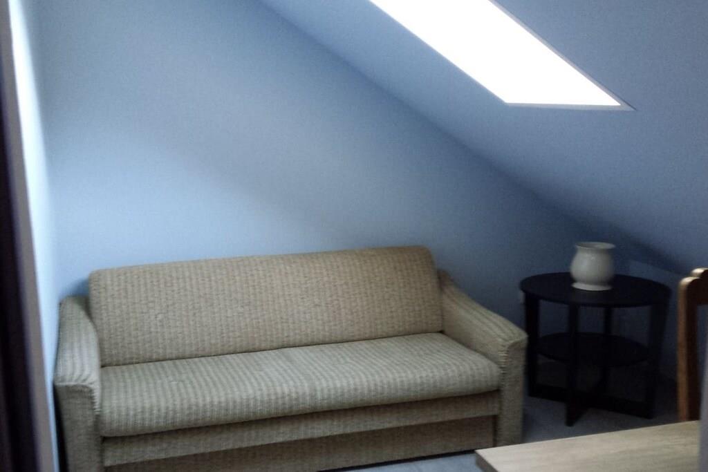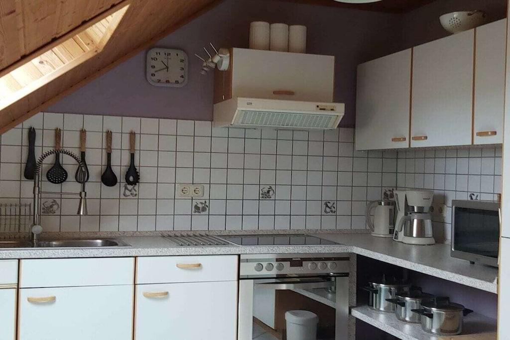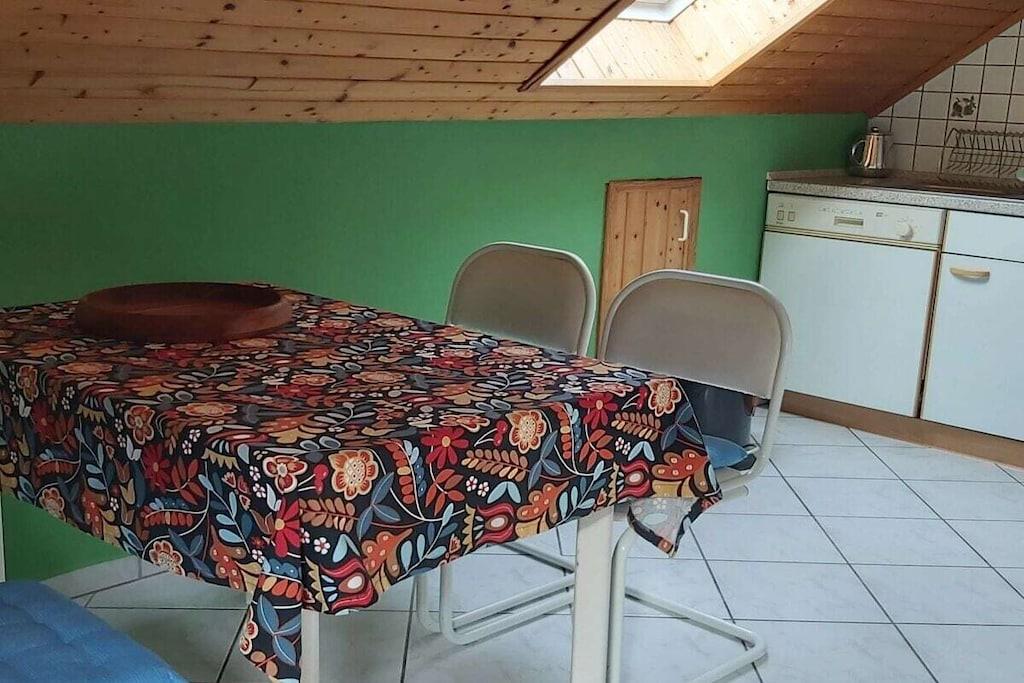 Ferielejligheden ligger på øverste etage i vores hus. Køkkenet er fuldt udstyret og har et elektrisk komfur, et stort køleskab med fryser og en opvaskemaskine. Ved siden af køkkenet er der en spiseplads til fem personer. Stuen har satellit-tv. Stuen har et siddeområde. Soveværelset har to senge og et stort klædeskab. Badeværelset har badekar og bruser. I gangen er der en knagerække og et skoskab.