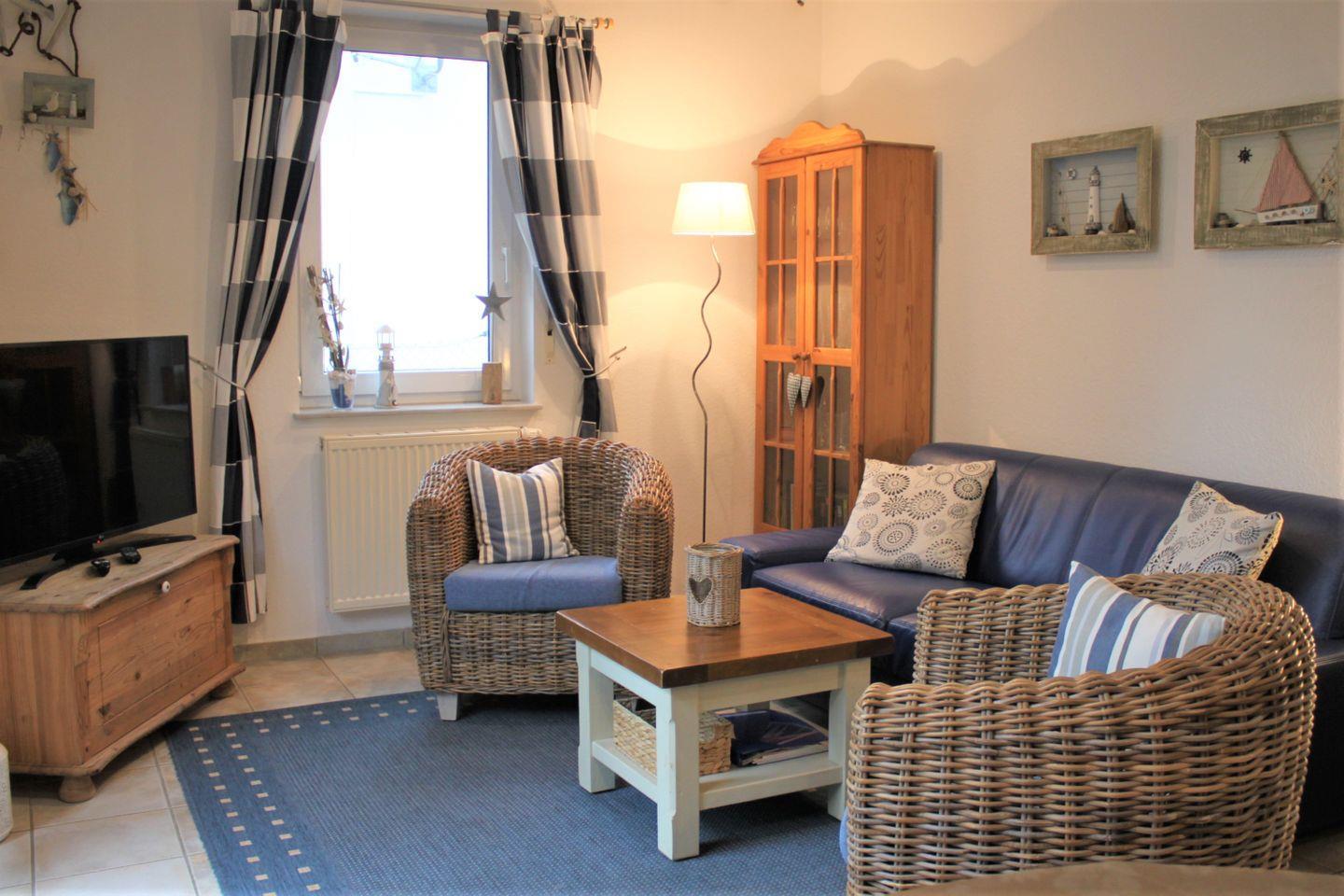 Im hellen und gemütlichen Wohnzimmer stehen Ihnen ein Flachbildschirm-TV-Gerät (Satellitenempfang), ein Blu-Ray- sowie ein DVD-Player und WLAN zur Verfügung.