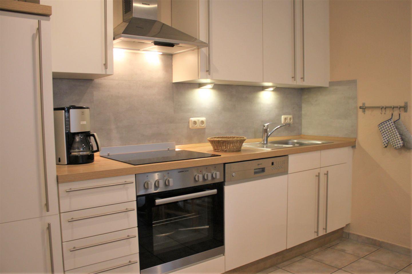 Die zum Wohnzimmer offene Küche ist mit Haushaltsgeräten wie Geschirrspülmaschine oder Mikrowelle und reichlich Geschirr gut ausgestattet und an dem großzügigen Esstisch haben alle Gäste genügend Platz.