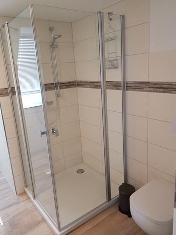 Im modernen Badezimmer mit Fenster verfügen Sie über eine ebenerdige Dusche, Waschtisch, Handtuschheizkörper, WC und Waschmaschine.