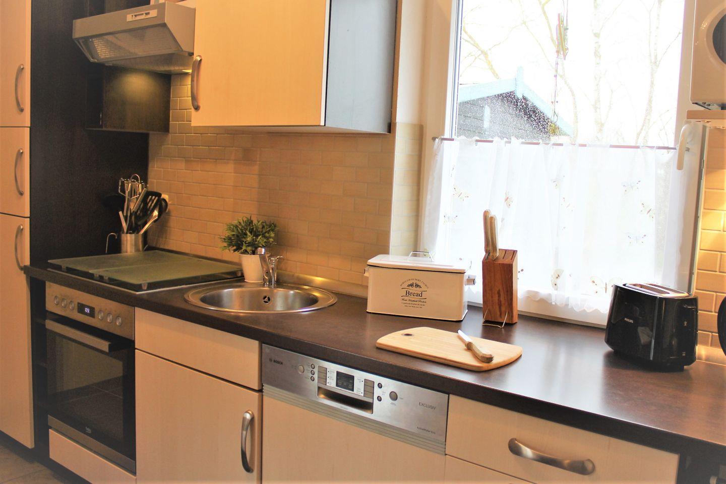 Im großzügigen Wohn- und Essbereich verfügen Sie über eine komfortable, große Couch, ein TV-Gerät und einen großzügigen Esstisch, an dem alle Gäste bequem Platz finden. Die Küche ist in den Raum integriert und bietet eine tolle Ausstattung, wie z.B. Kühlschrank mit Gefrierfach, Herd mit Backofen, Mikrowelle, Geschirrspülmaschine und diverse Kleingeräte. Sie können sich bestens selbst versorgen.