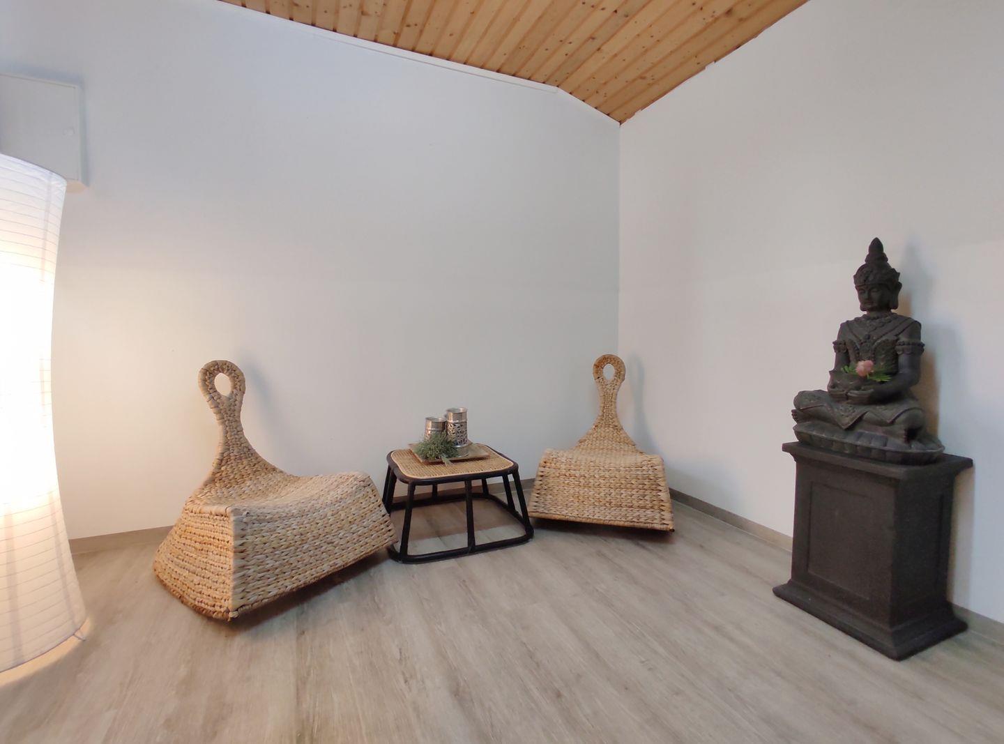 Der Wohnbereich lädt zum Entspannen ein. Ein bequemes Ecksofa und ein Fernseher bieten Unterhaltungsmöglichkeiten für gemütliche Abende. Wenn Sie sich in einem guten Buch verlieren möchten, finden Sie in einer Ecke des Raumes eine Auswahl an Lesematerial.