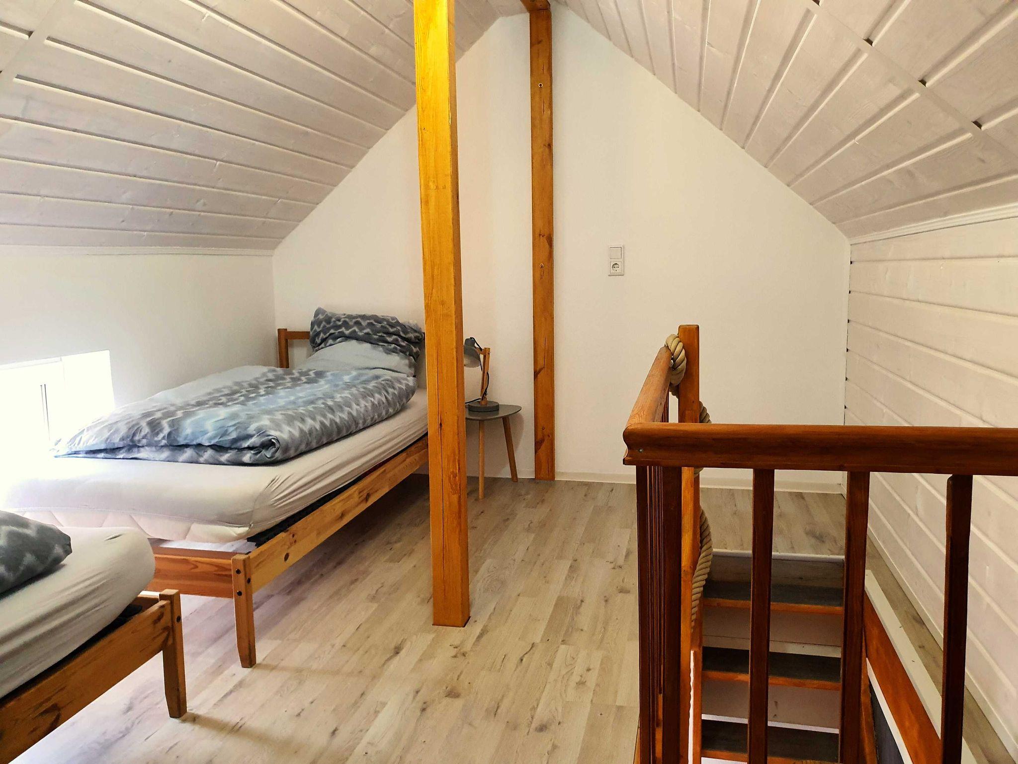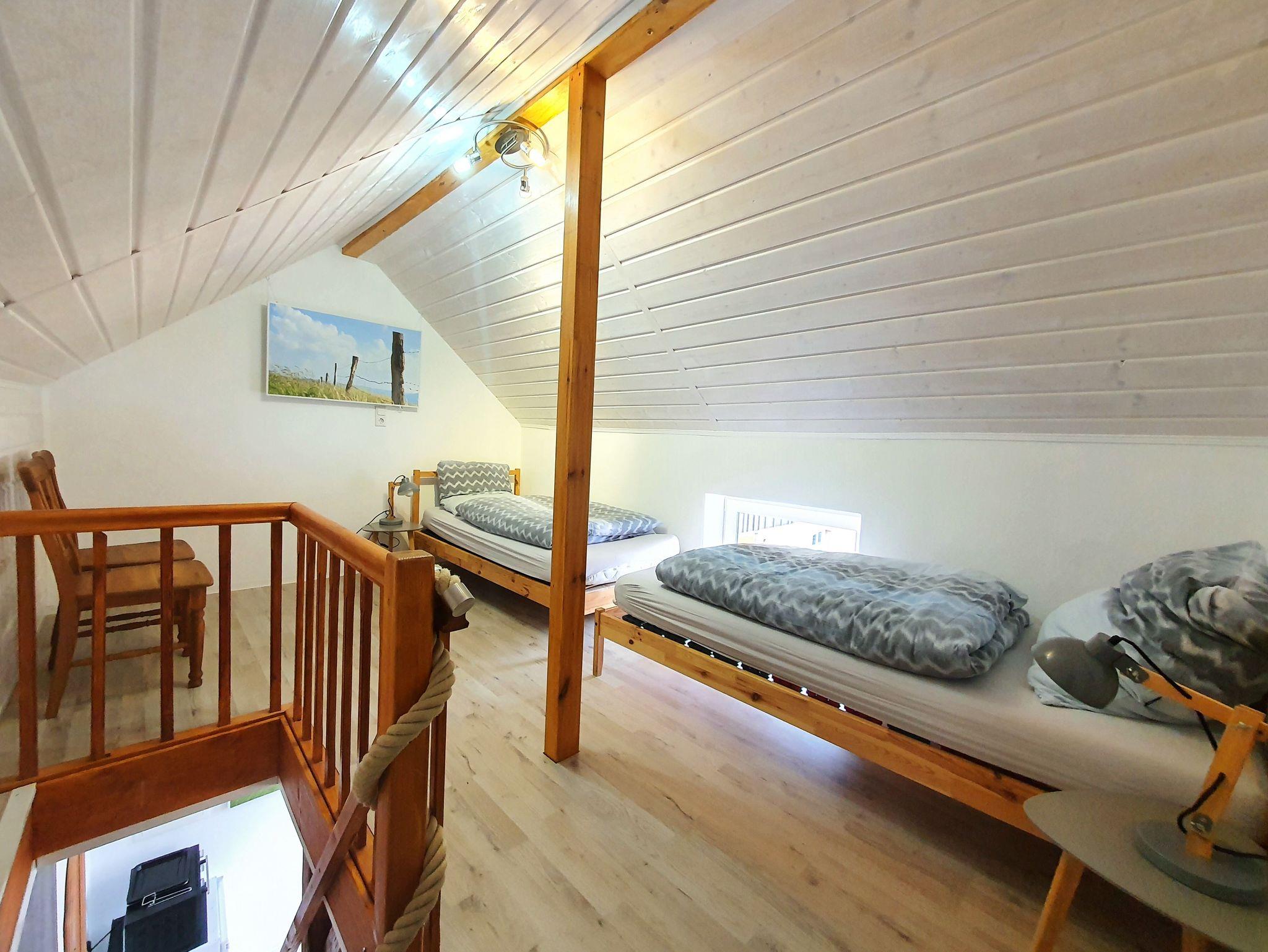 Im Spitzdach, erreichbar über eine schmale Treppe mit Handlauf, befindet sich das Schlafzimmer. Es ist mit zwei Einzelbetten ausgestattet und lädt zum entspannen ein.