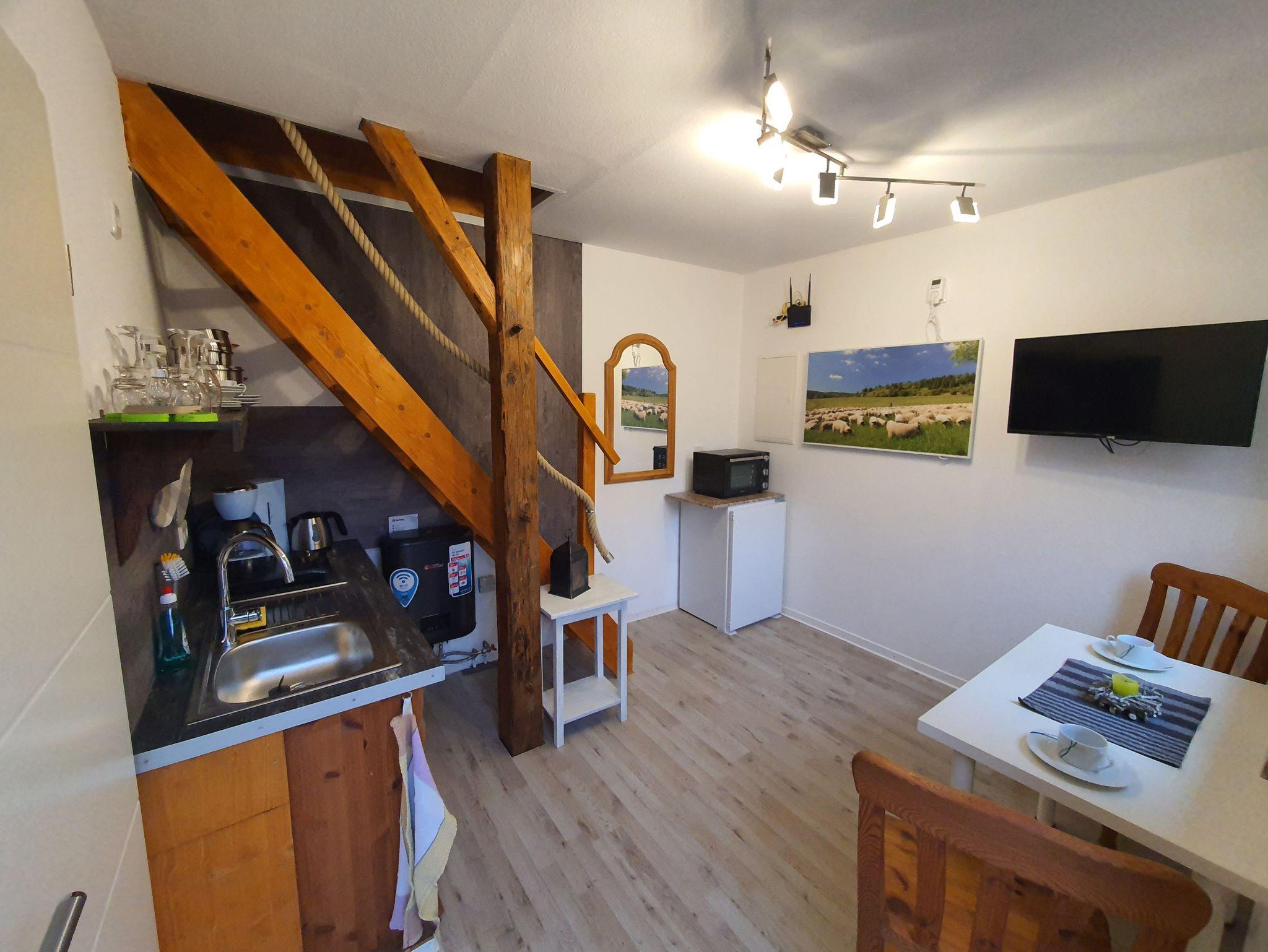 Die Wohnküche ist mit einer Küchenzeile ( Induktions-Kochfeld, Mini-Backofen, Kühlschrank, Wasserkocher, Kaffeemaschine, Toaster ) ausgestattet. Ein Esstisch mit Bestuhlung, LCD-TV und Radio gehören zur weiteren Ausstattung.