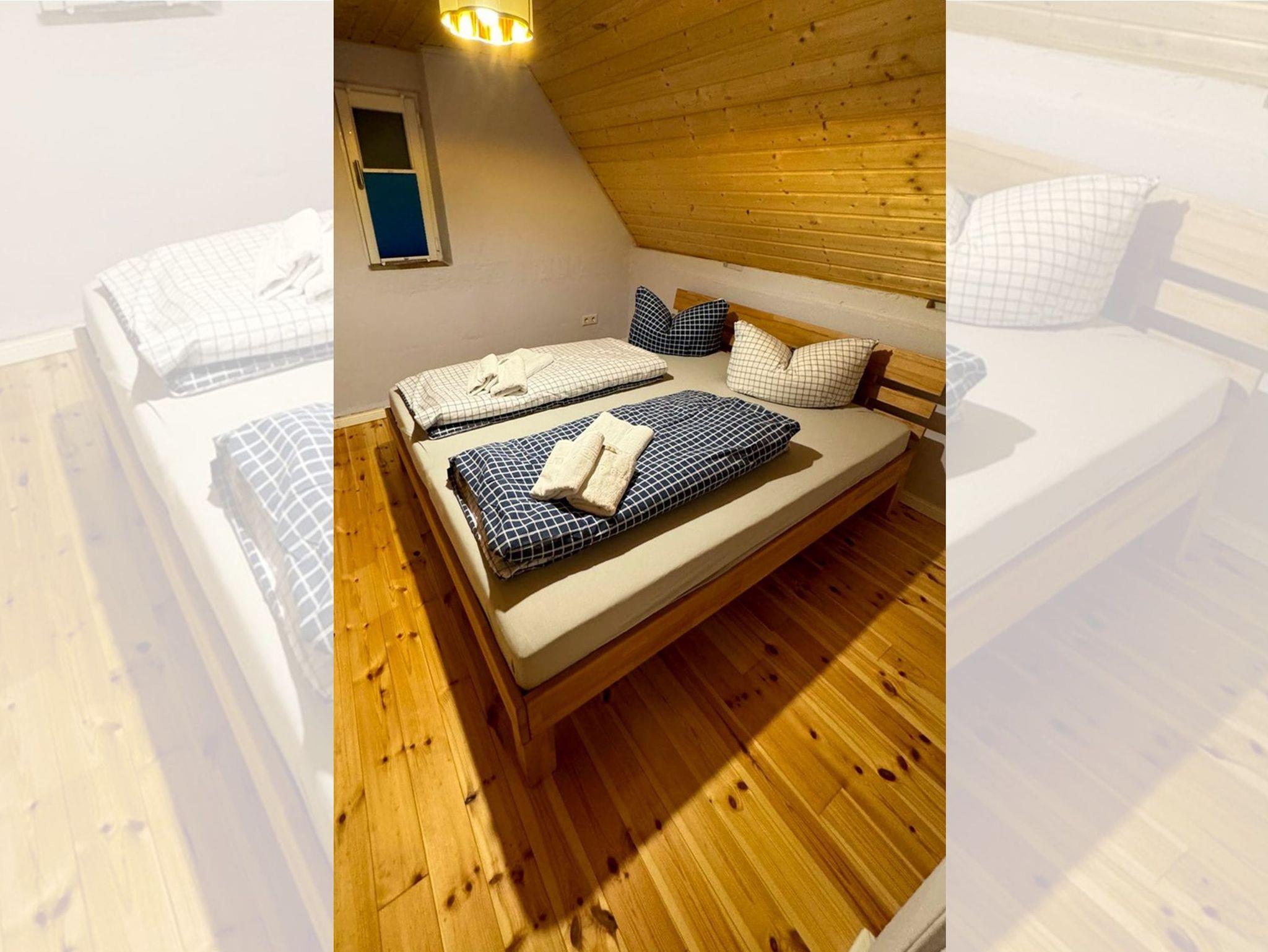 Das erste Häuschen, „Ellas Gehöft“, bietet im Erdgeschoss ein gemütliches Wohnzimmer, eine separate Küche mit rustikalem Holzofen und Zugang zur Terrasse sowie ein Badezimmer mit Dusche und WC. Eine charmante, steilere Holztreppe führt Sie in die oberen Etagen, wo sich zwei Schlafzimmer mit je einem Doppelbett und ein weiteres Badezimmer mit Dusche und WC befinden.