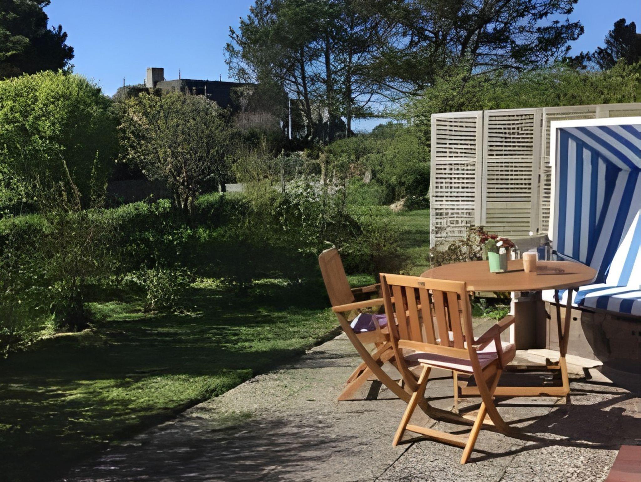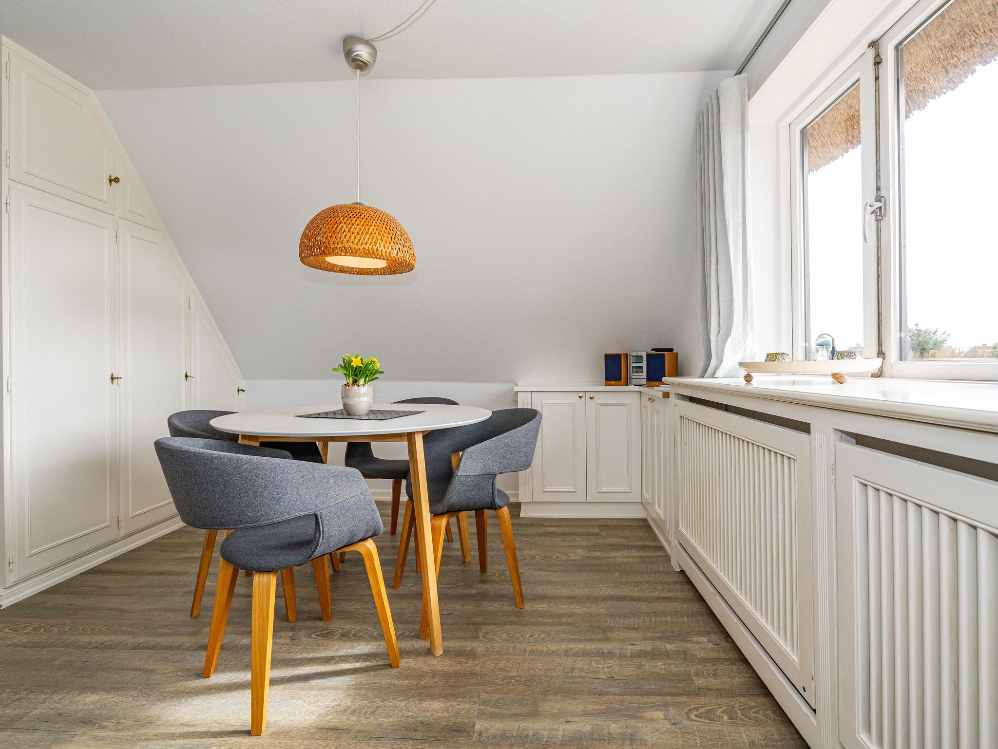 Wohnen in bester Lage und doch mitten in der Ruhe der Natur. Heideland, Wildblumenwiese und sogar ein kleiner Hühnerstall sorgen für ländliche Gemütlichkeit - fußläufig nach Kampen Mitte. Dieses Quartier für bis zu Drei liegt im 1. Obergeschoss eines klassischen Reetdachhauses, auch ein kleiner Vierbeiner hat hier Platz. Das gemütliche WohnEsszimmer begrüßt mit großer Fensterfront gen Süden und hat Platz für bis zu Vier am Esstisch. Die kleine Küche ist separat untergebracht und voll ausgestattet. Der erste Kaffee im Stehen lässt sich hier mit grandioser Aussicht über die auf dem Wattenmeer glitzernde Morgensonne genießen. Gleich nebenan ein frisch renoviertes, modernes Duschbad und gegenüber ein kleines Einzelschlafzimmer mit kuscheliger Schlafkoje. Das größere Doppelschlafzimmer liegt am Ende des Flures. Hier gibt es durch maßgeschneiderte Tischlereinbauten viel Stauraum und auch hier Natur pur - vom Bett aus kann man den Wind in den Baumwipfeln sehen. Die zugehörige Terrasse mit Strandkorb befindet sich direkt vor der Haustür und nach Westen ausgerichtet. Das Quartier ist mit Laminat ausgelegt.