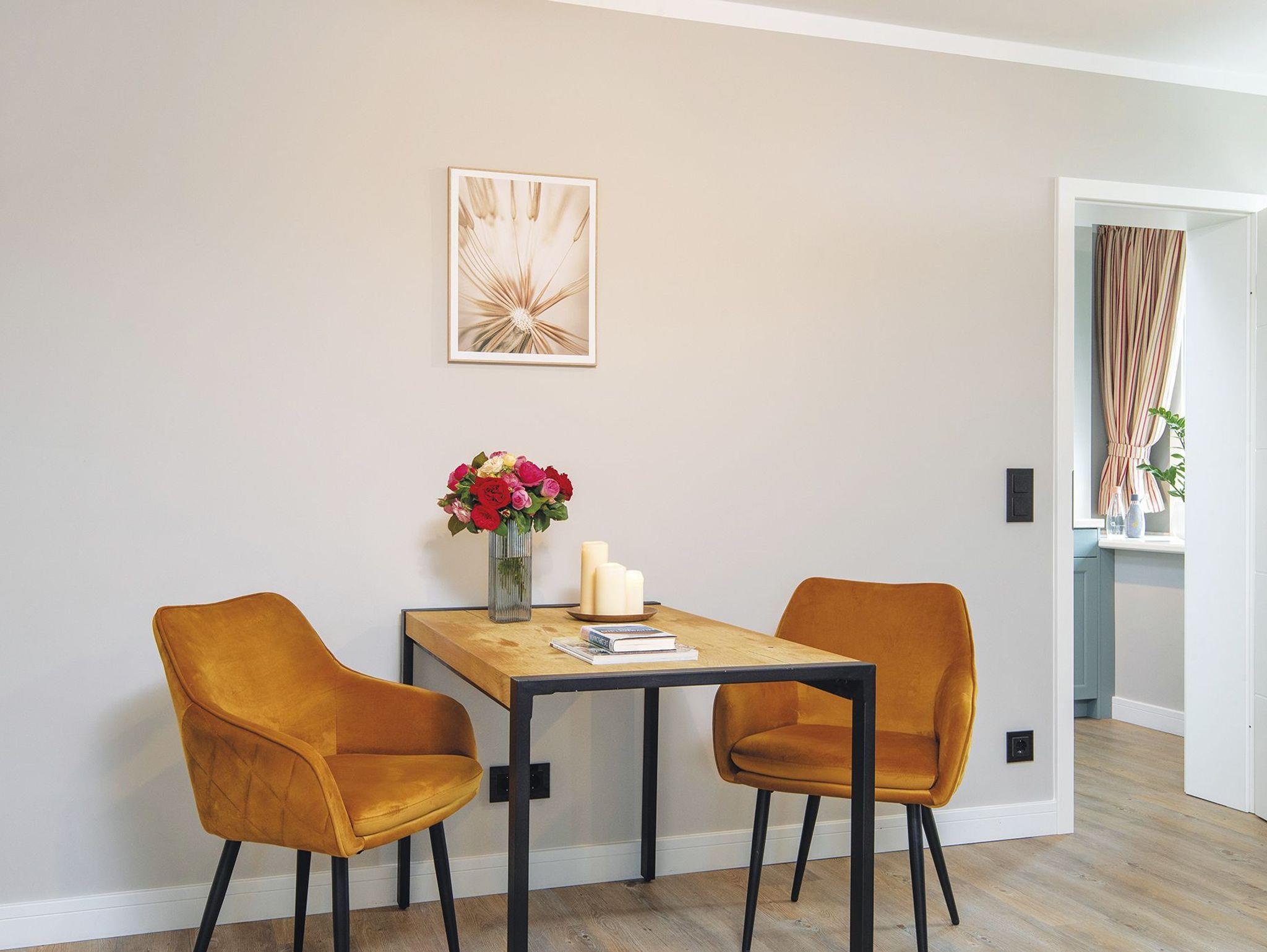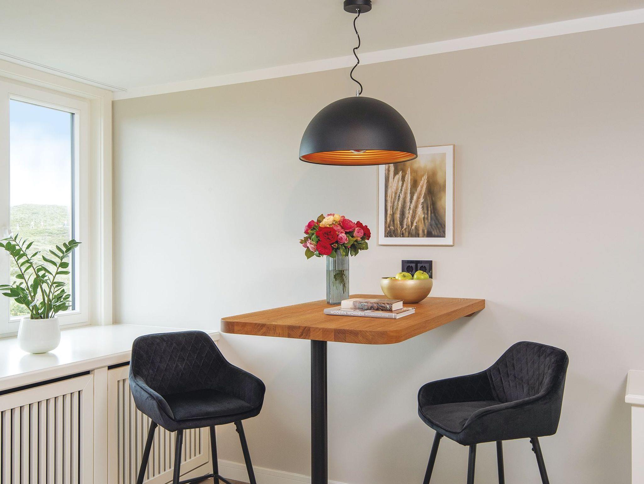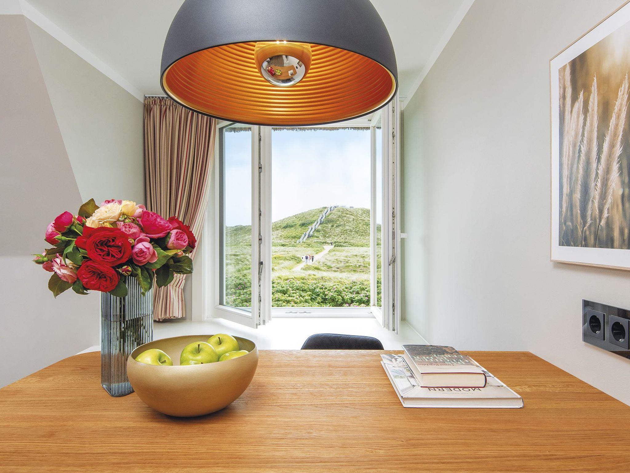 Vom Flur aus gelangt man vorbei an einem modernen kleinen Bad mit ebenerdiger Dusche in den kombinierten WohnEssbereich. Gleich zwei Essecken, ein Doppelbett und eine Sofaecke für gemütliche Lesestunden bieten hier alles was das Herz begehrt. Es erwartet Sie außerdem eine separate und voll ausgestattete Küche in modernem graugrün. Das perfekte Quartier für Alleinreisende und Paare, in ruhiger Lage direkt auf der Düne.