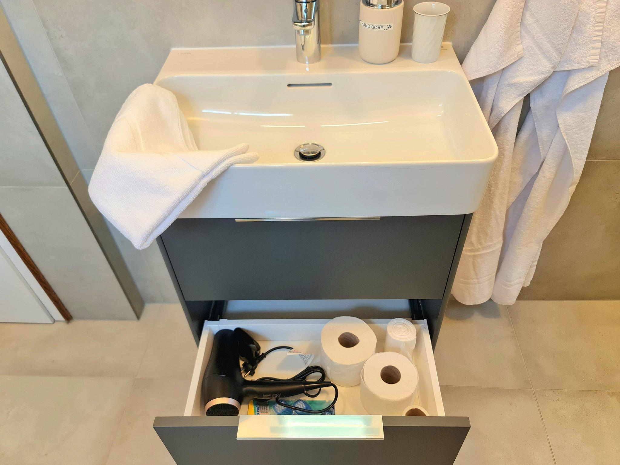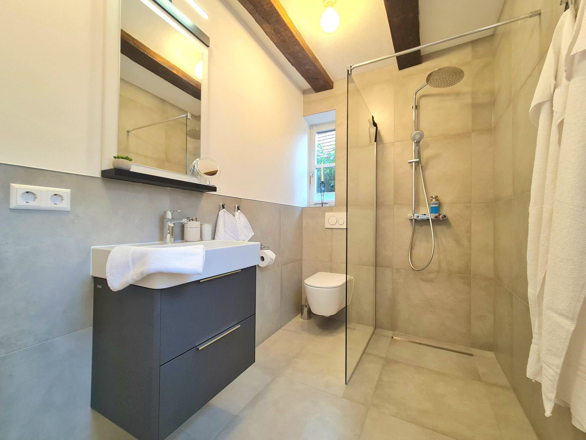Im neu sanierten und renovierten Tageslicht-Bad kannst mit einer Regendusche ein unvergessliches Duschvergnügen erleben. Selbstverständlich stellen wir frische Handtücher und Dinge wie Toilettenpapier, Seife, Haar- und Bodywaschgel und Föhn zur Verfügung.