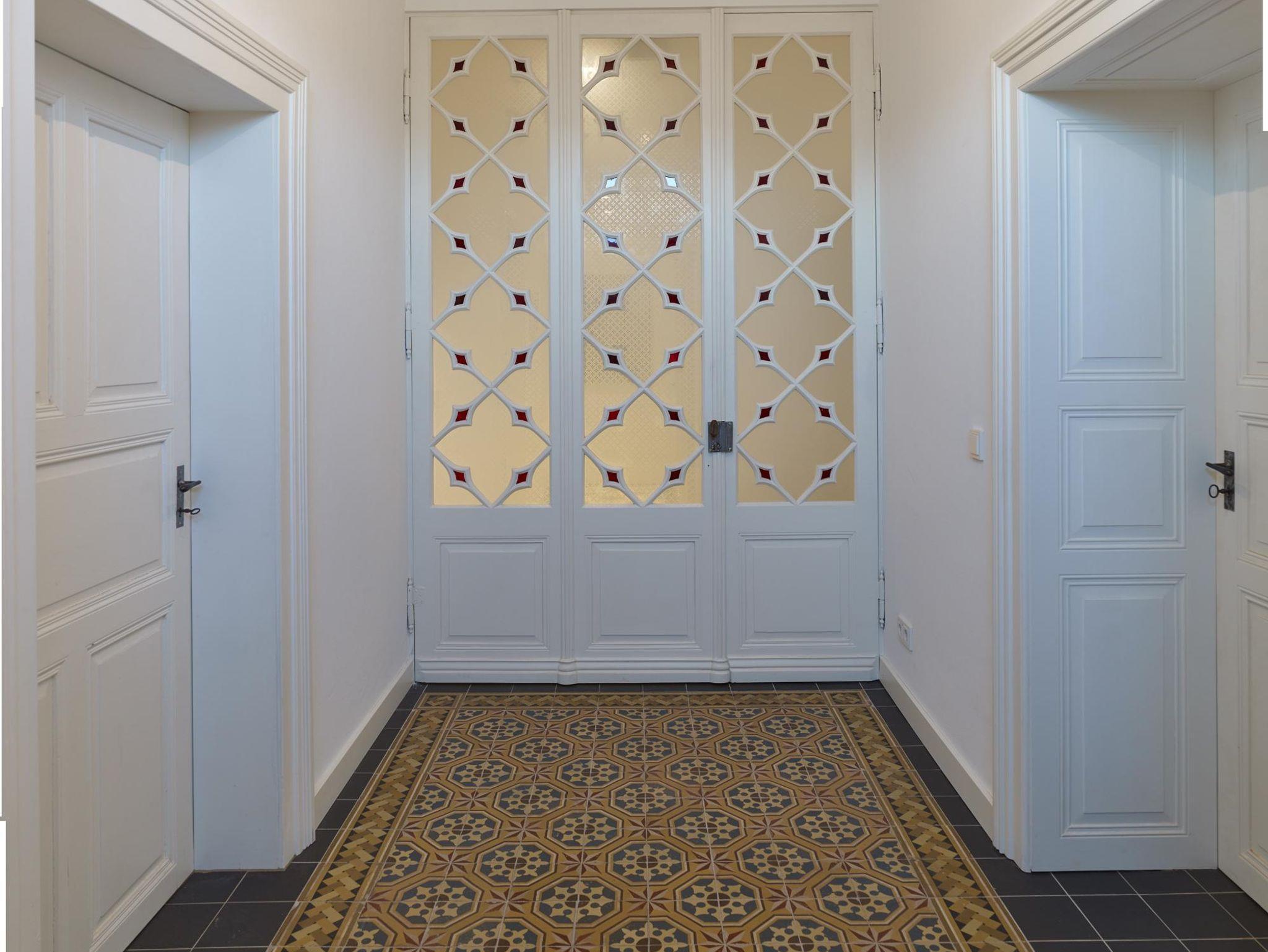 Das Terrazzotreppenhaus der Remise sowie die Kirschholzböden und -möbel schlagen die Brücke zum Gutshaus, welches innenarchitektonisch mit denselben Materialien gestaltet ist.