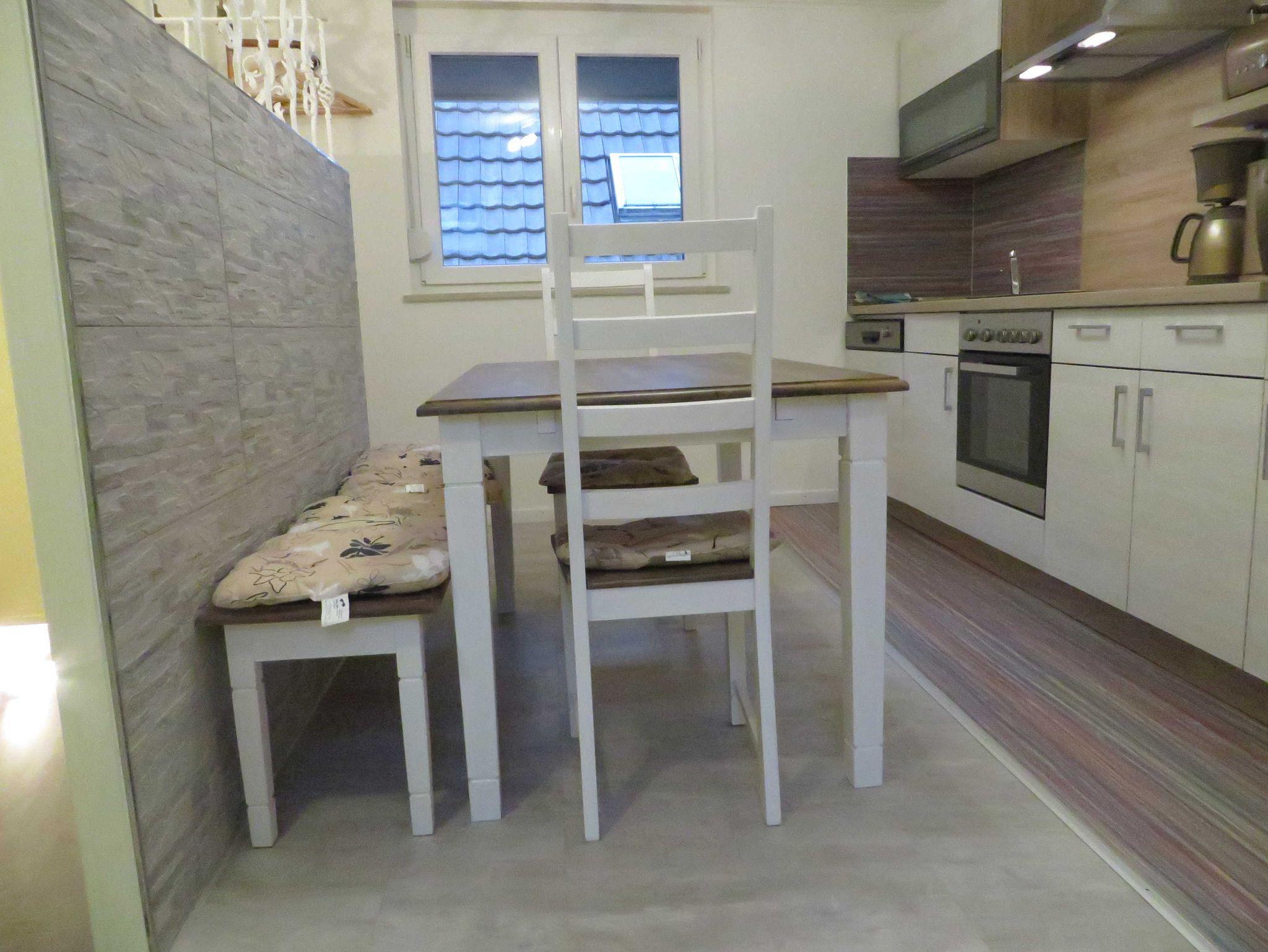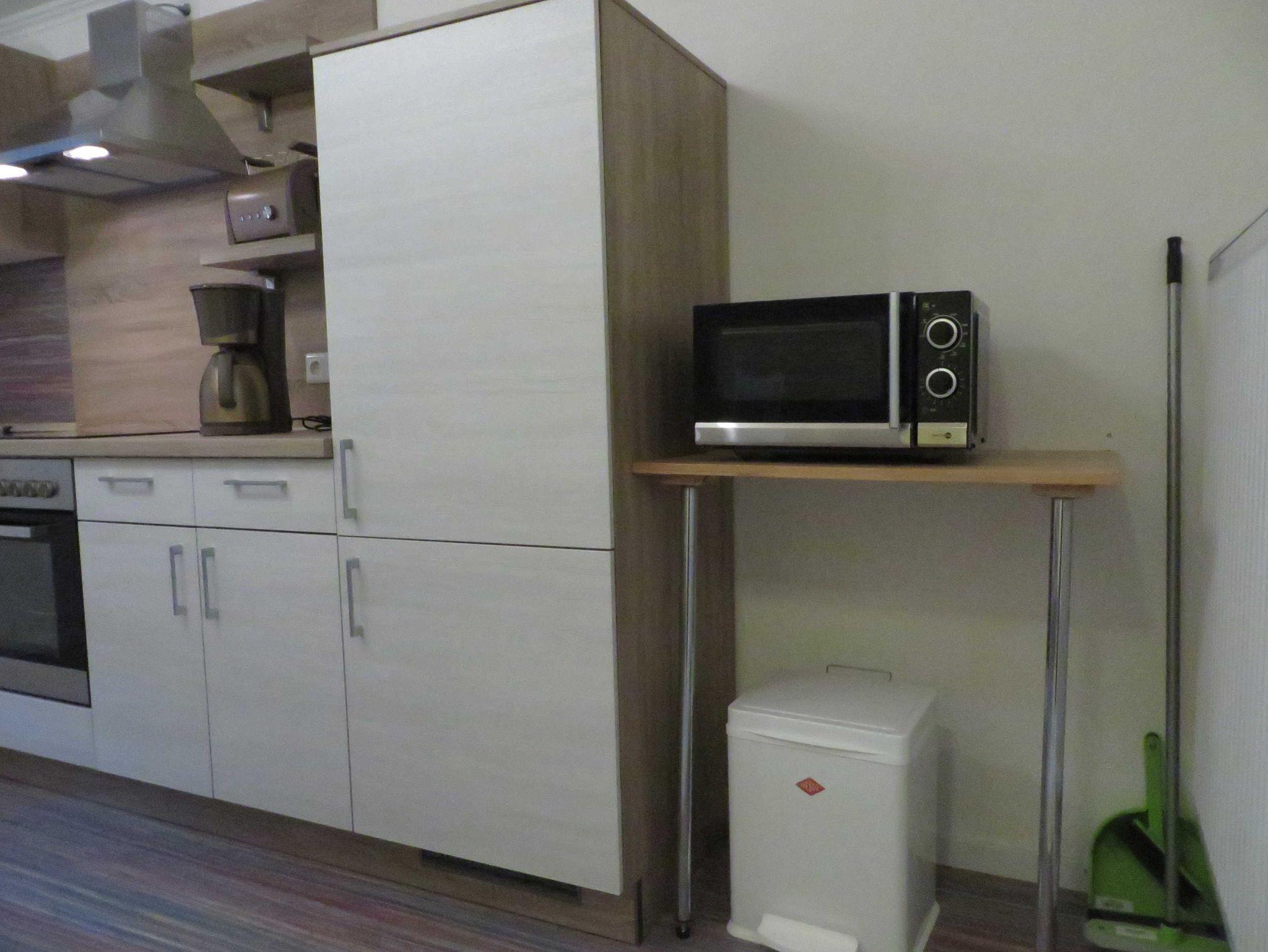 In der Fewo befinden sich 2 Schlafräume mit einem Doppelbett (1,80 m x2,00 m) und einem Doppelbett (1,60mx2,00 m), einem Wohnzimmer mit zusätzlicher ausziehbarer Schlafcouch mit Flachbildfenseher und Radio, eine abgegrenzte Küche mit ausreichendem Geschirr, Herd mit Ceranfeld, Kühlschrank mit Gefrierfach, Kaffeemaschine, Toaster, Wasserkocher und Mikrowelle, ein Bad mit Dusche und Toilette.