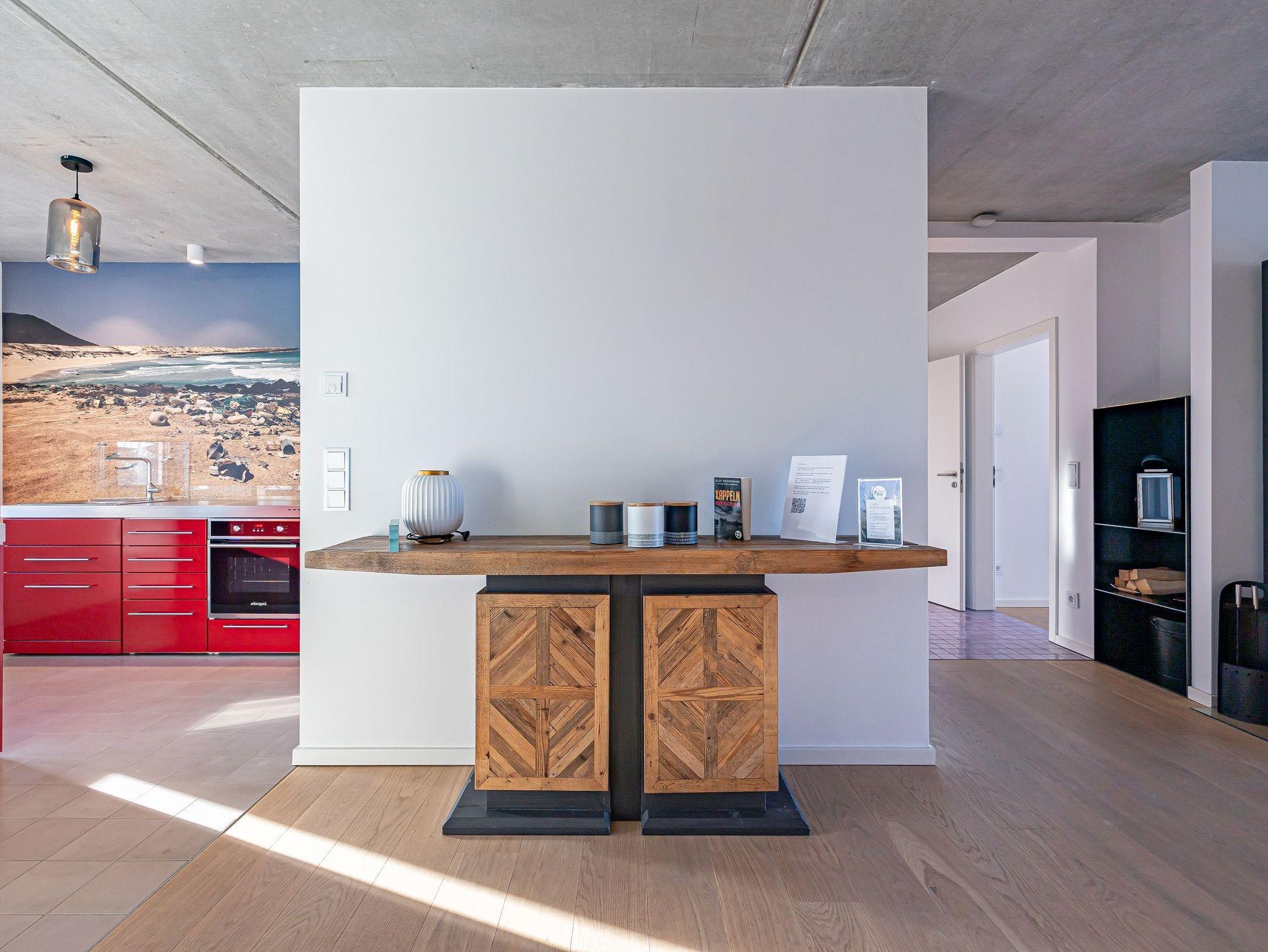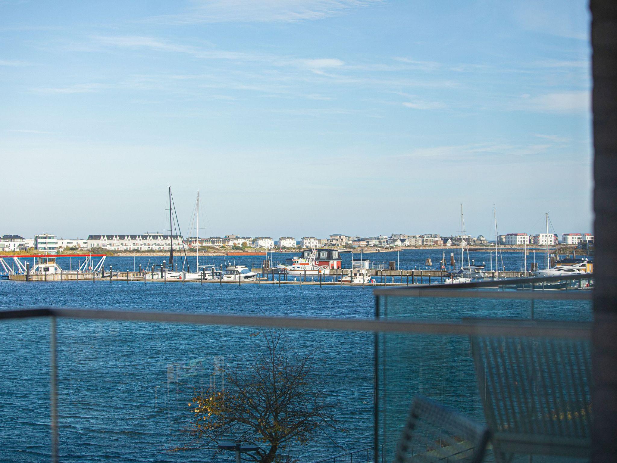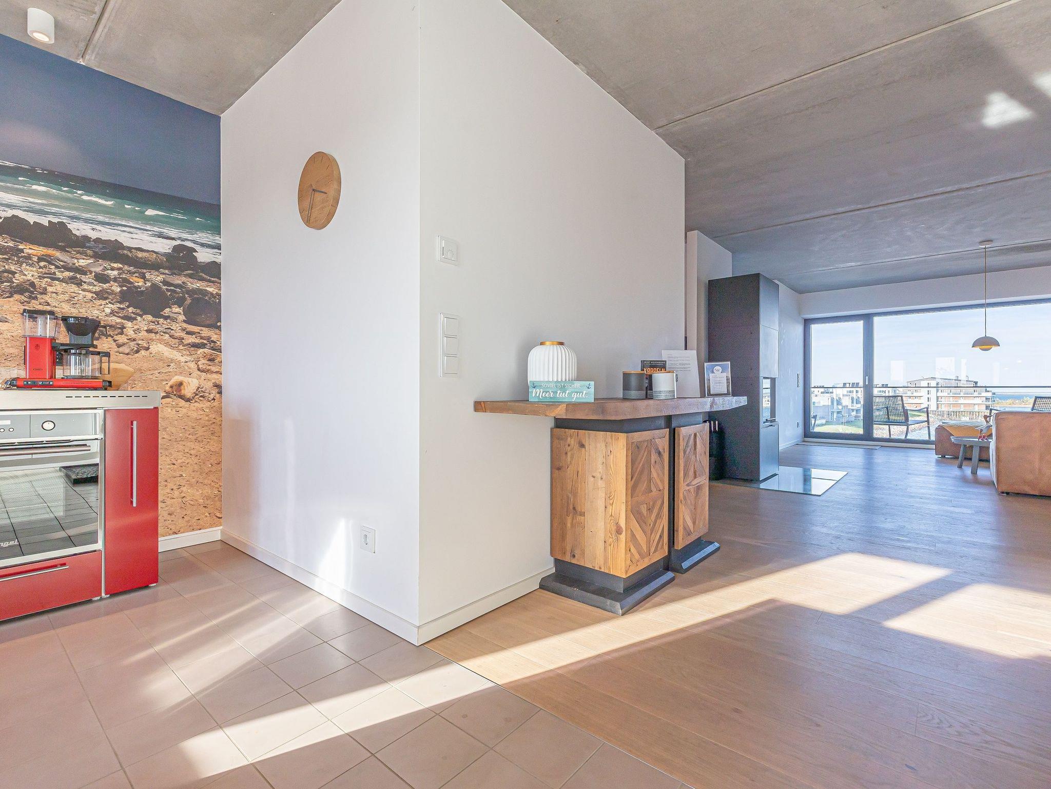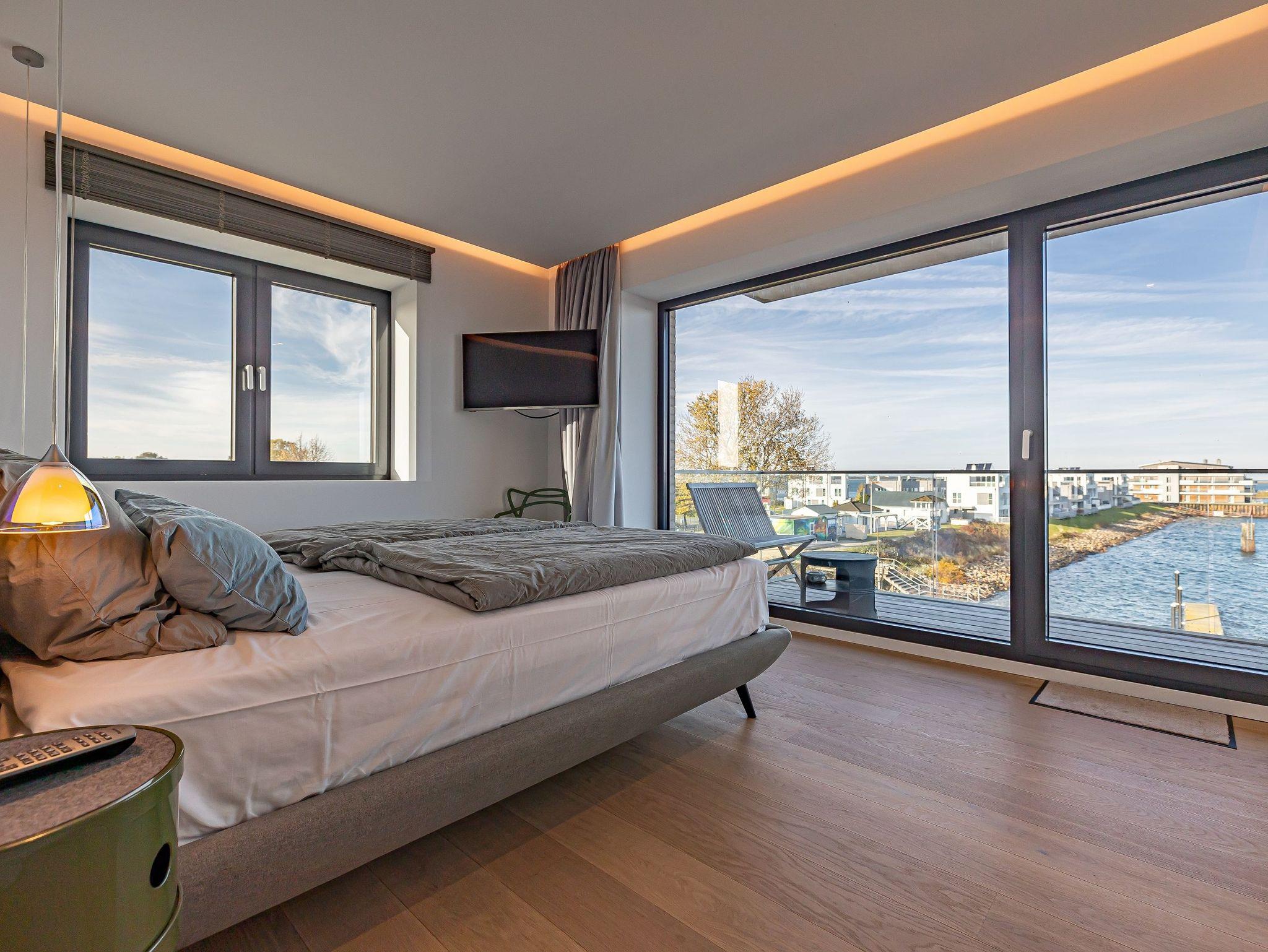 Die offene Designküche, komplett ausgestattet und mit einem inspirierenden Wandbild verziert, lädt zu genussvollen Kochabenden ein. Entspannen Sie im stilvollen Wohnbereich mit Kamin und lassen Sie sich von der traumhaften Aussicht auf den Hafen, die Schleimündung mit Leuchtturm und die Ostsee verzaubern.