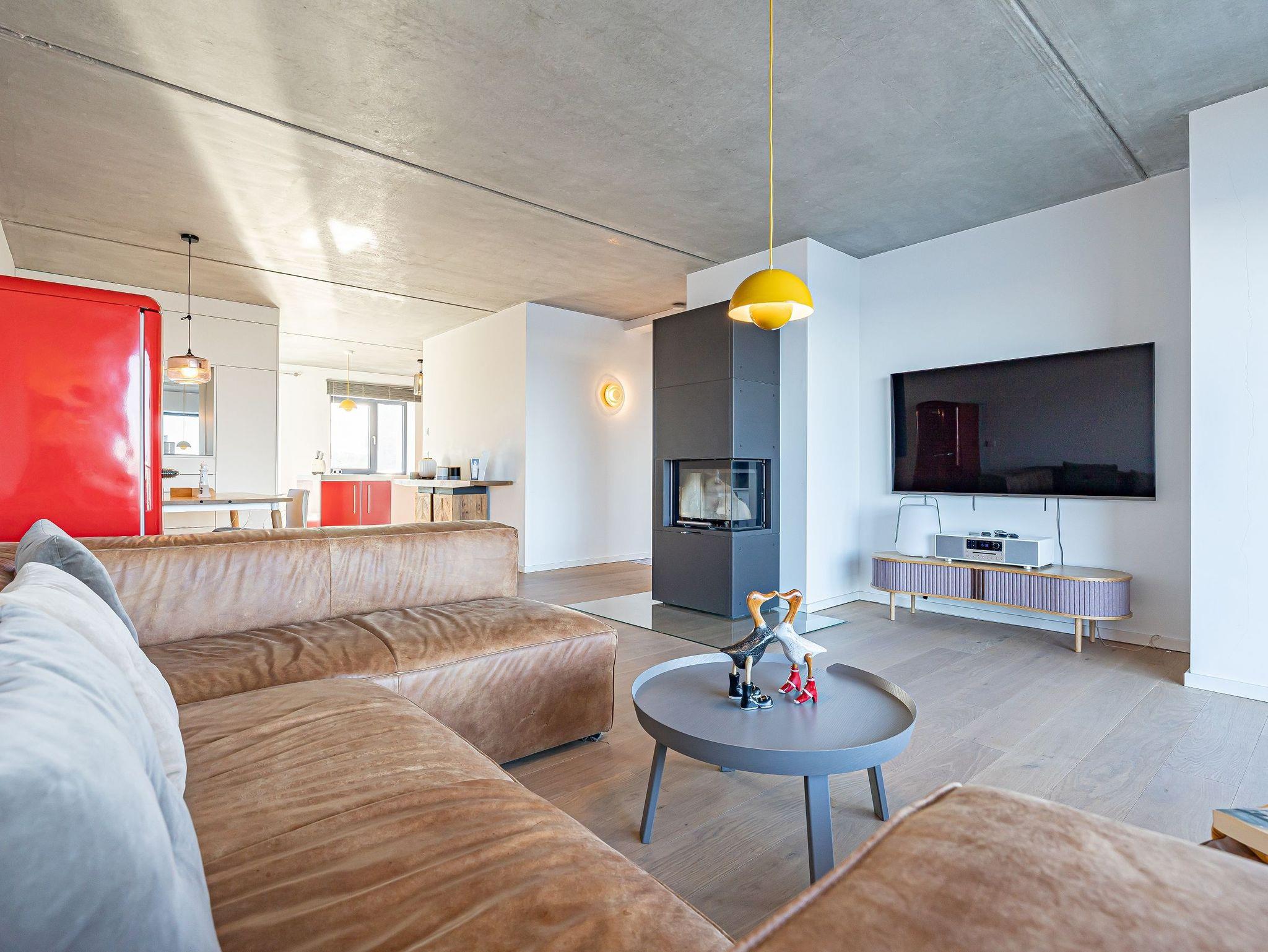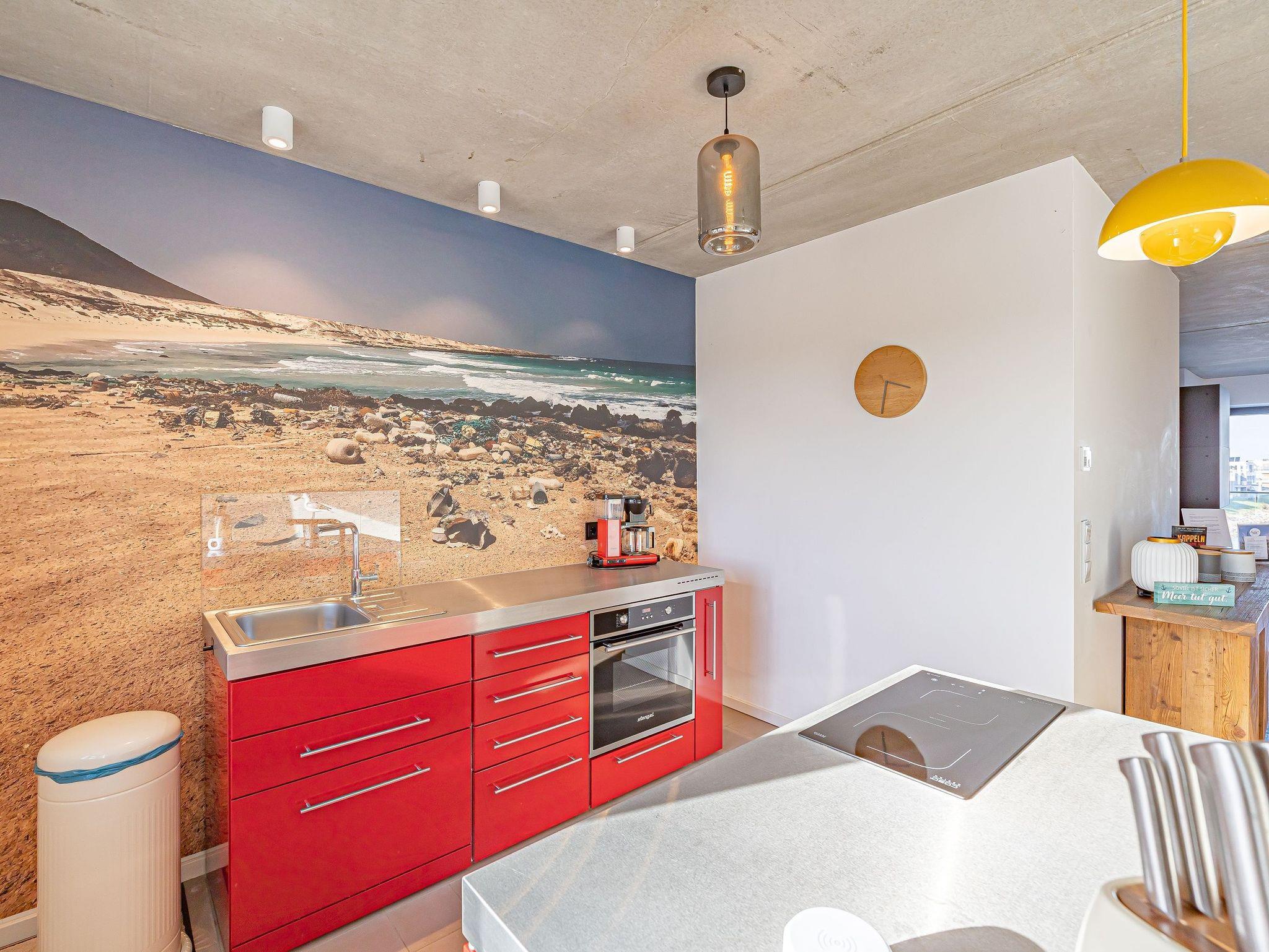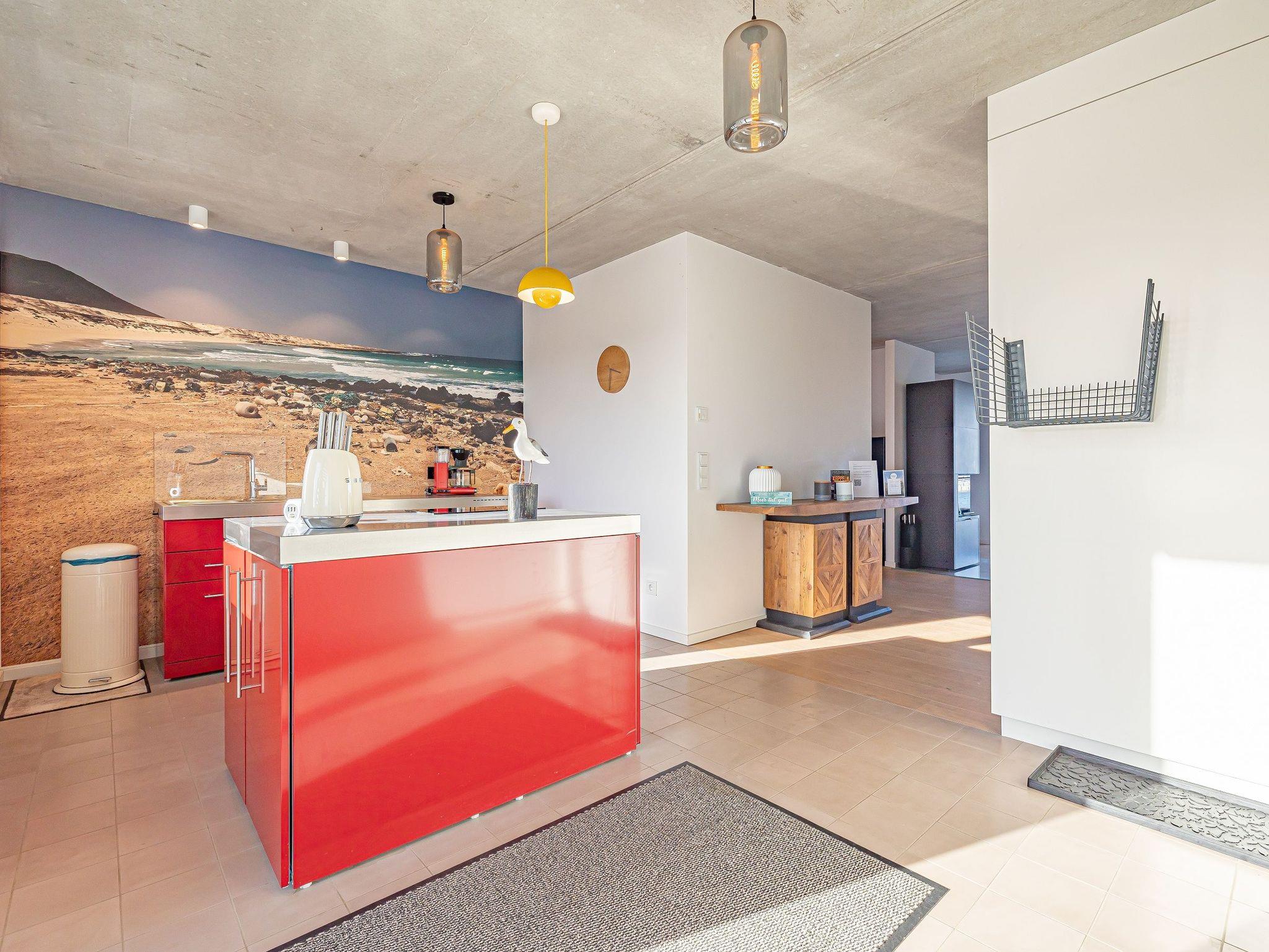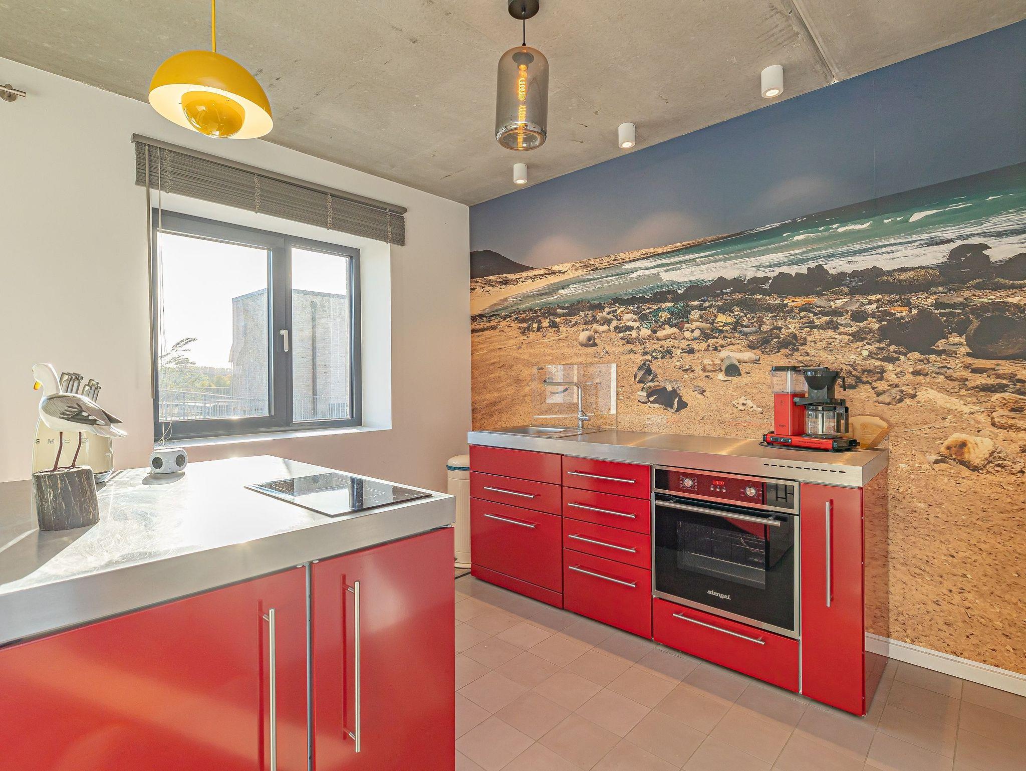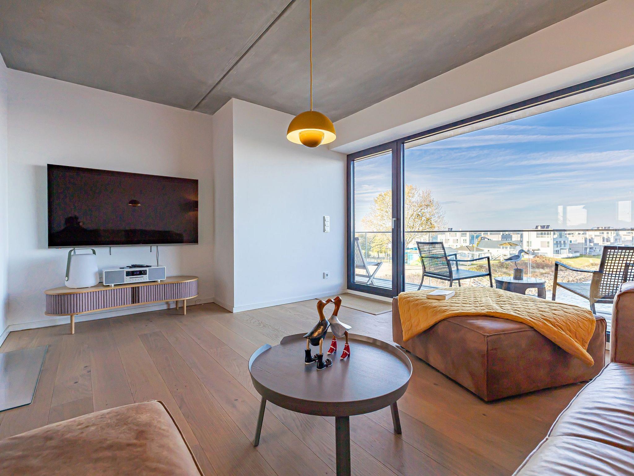 Die offene Designküche, komplett ausgestattet und mit einem inspirierenden Wandbild verziert, lädt zu genussvollen Kochabenden ein. Entspannen Sie im stilvollen Wohnbereich mit Kamin und lassen Sie sich von der traumhaften Aussicht auf den Hafen, die Schleimündung mit Leuchtturm und die Ostsee verzaubern.
