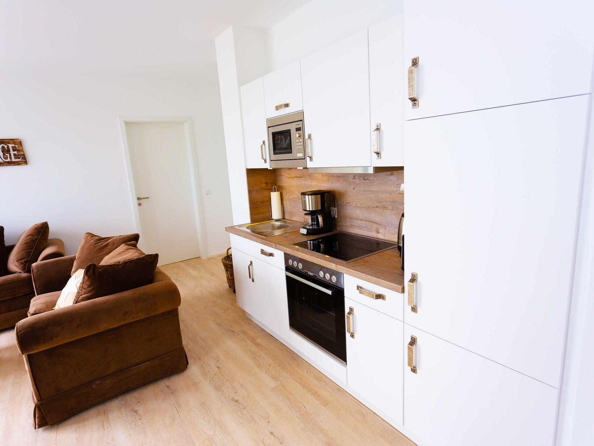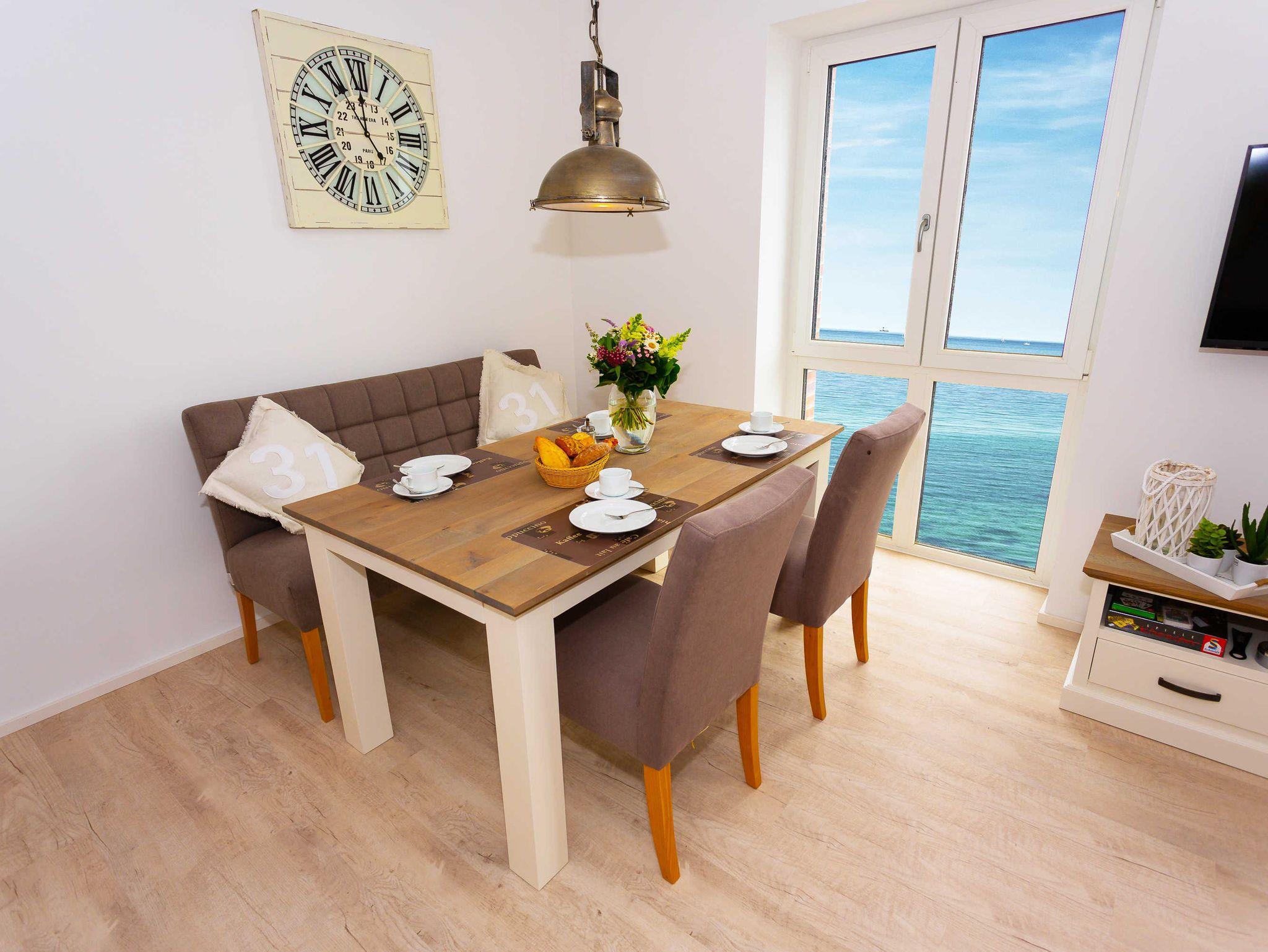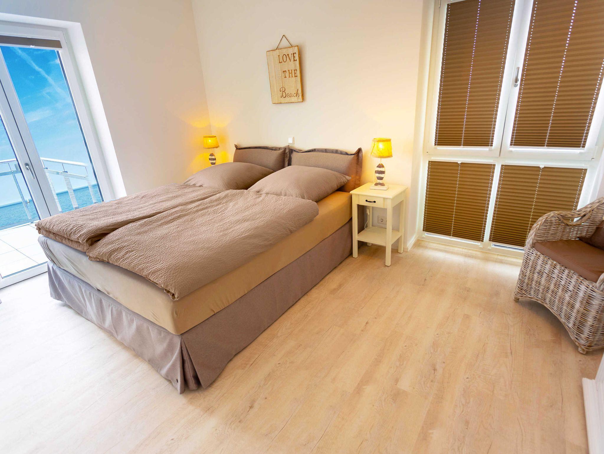 Ein geschmackvoll eingerichtetes Wohnzimmer mit einer kuscheligen Couchgarnitur bietet Ihnen einen traumhaften, direkten und wohl einzigartigen Meerblick. Es schließt sich ein Balkon an, auf dem sich der atemberaubende Blick auf die Ostsee im Freien genießen lässt. Zu der komplett ausgestatteten Küche gehören der einladende Esstisch samt gemütlicher Bestuhlung, ein Kühlschrank mit Gefrierfach, ein Backofen, eine Mikrowelle, ein Geschirrspüler und selbstverständlich weitere Küchenutensilien. Zwei gemütliche Schlafzimmer sind mit jeweils einem Boxspring-Doppelbett eingerichtet. Des Weiteren gehören ein Duschbad sowie ein weiteres Bad mit Badewanne zur Ferienwohnung.