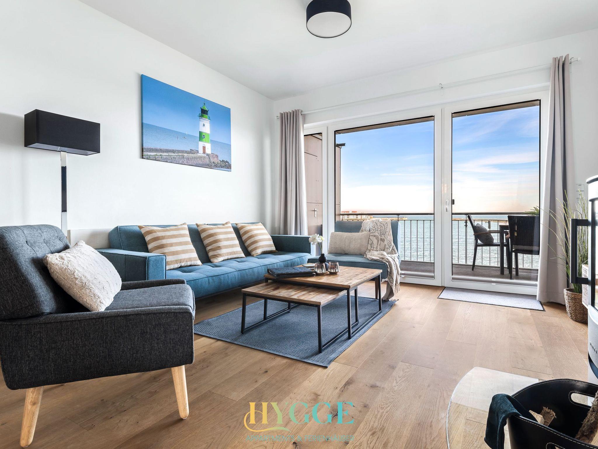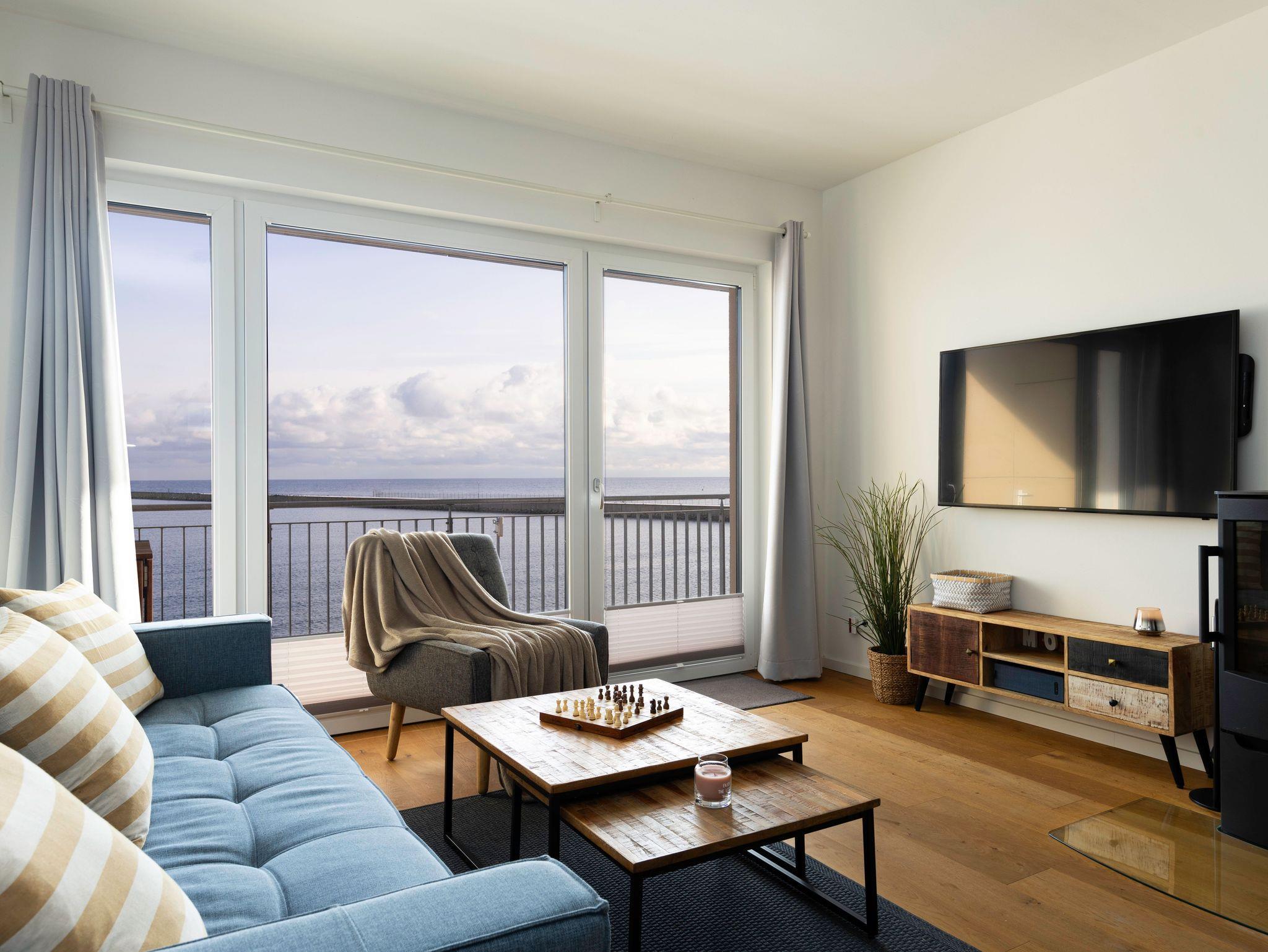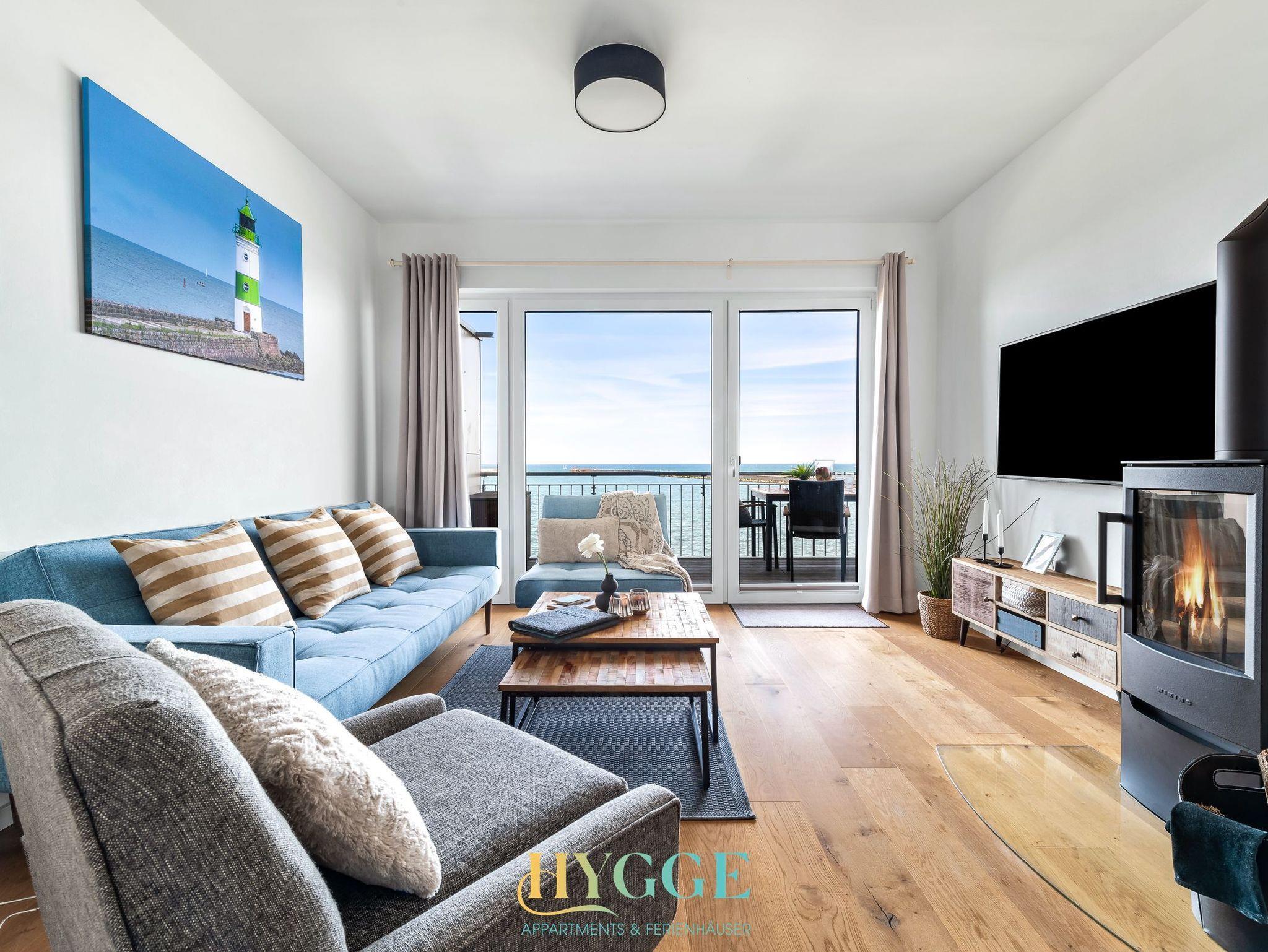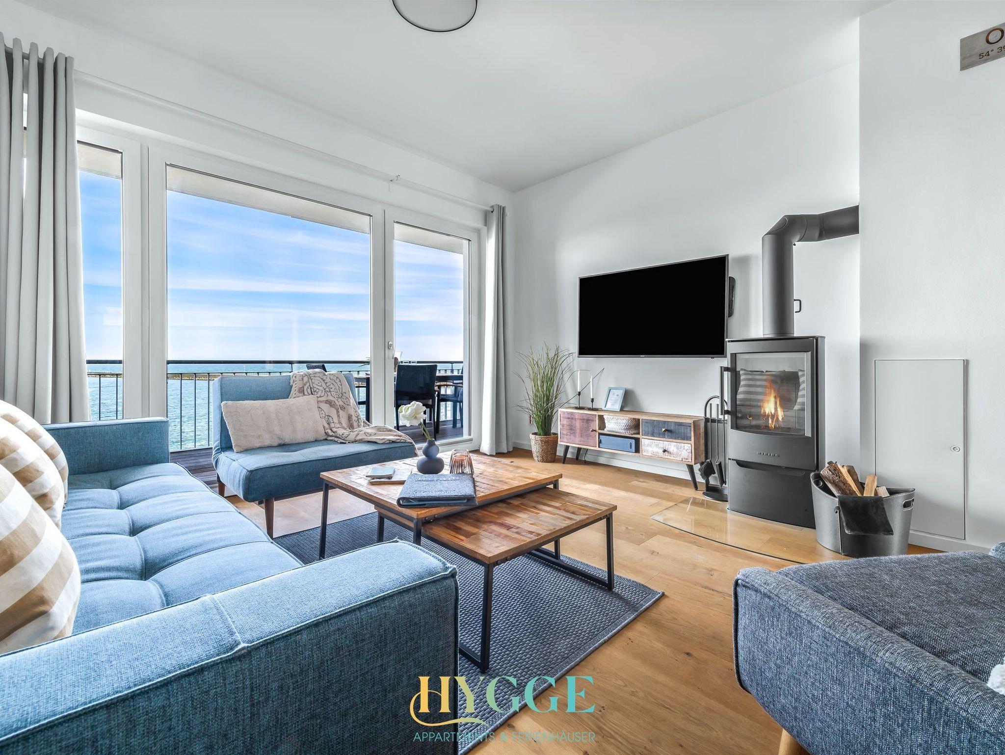 Die gemütliche Sitzlandschaft im Wohnbereich lädt zum Entspannen ein und bietet einen faszinierenden Blick auf das Wasser. Morgens sehen sie den unfassbar schönen Sonnenaufgang über dem Meer und auch in der dunklen Jahreszeit wird es hier hyggelig, wenn die Ostsee vor der Fensterfront ihr Temperament zeigt und das Sofa zu einem Rotwein bei prasselndem Kaminfeuer einlädt. Für Indoor-Entertainment sorgt ein großer Fernseher.