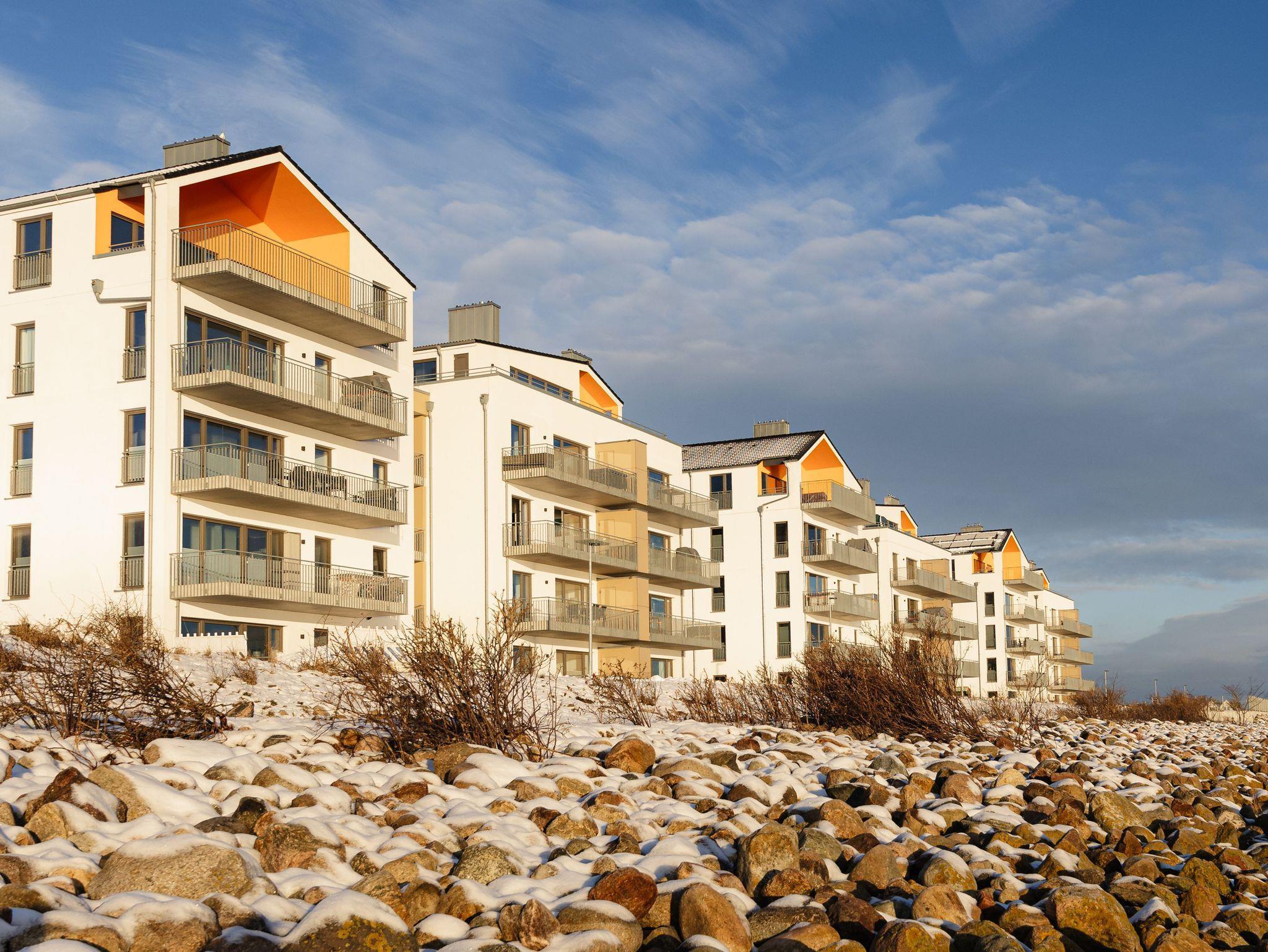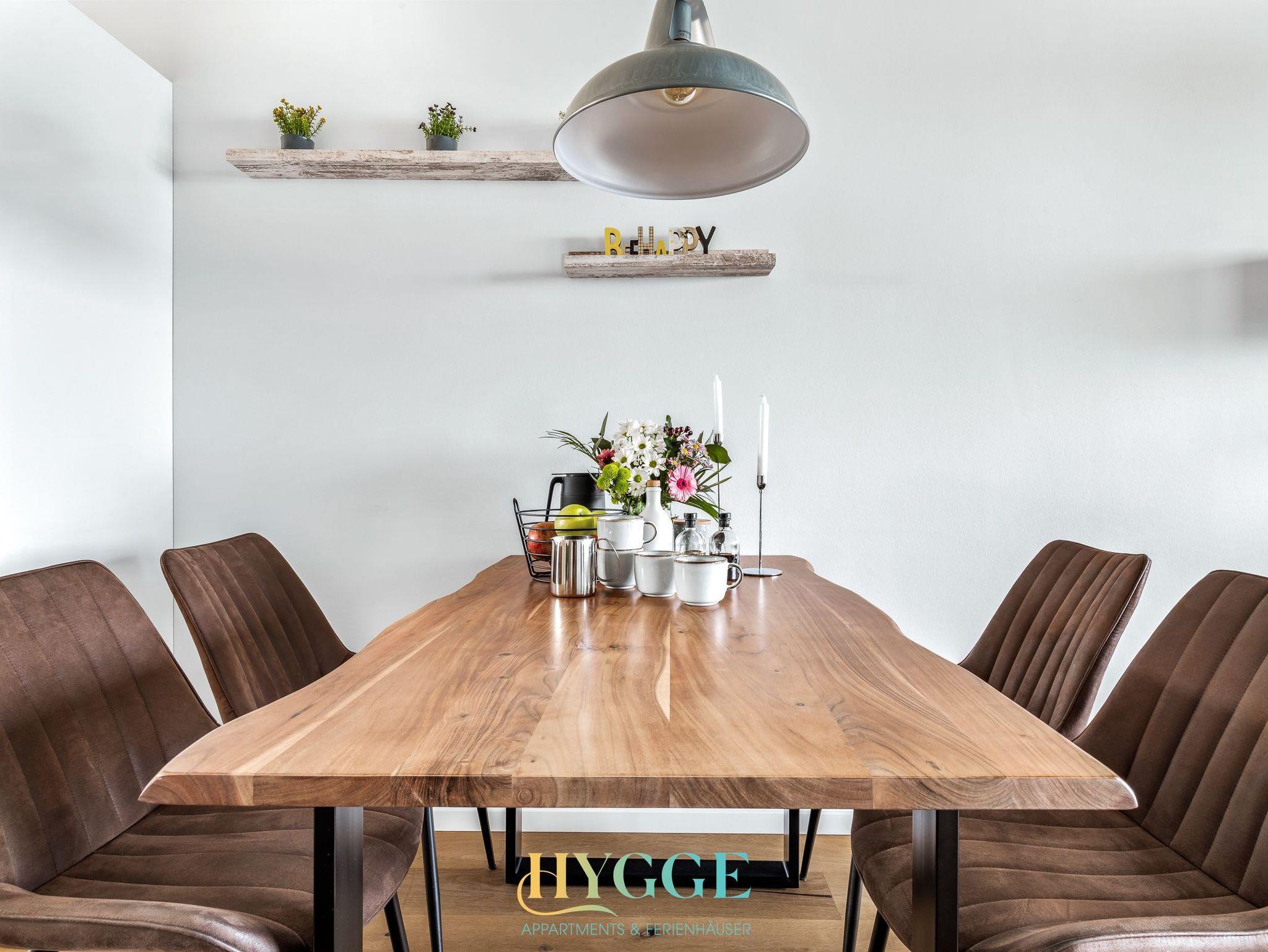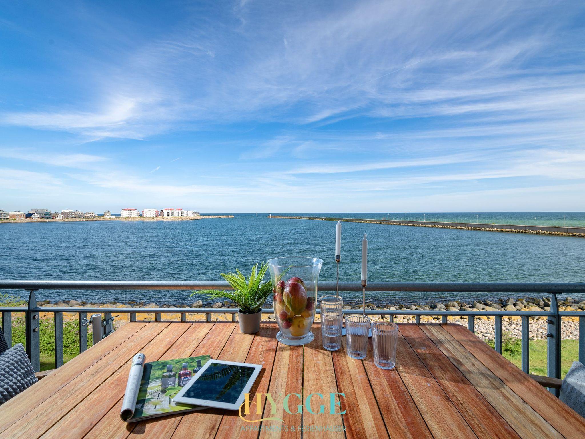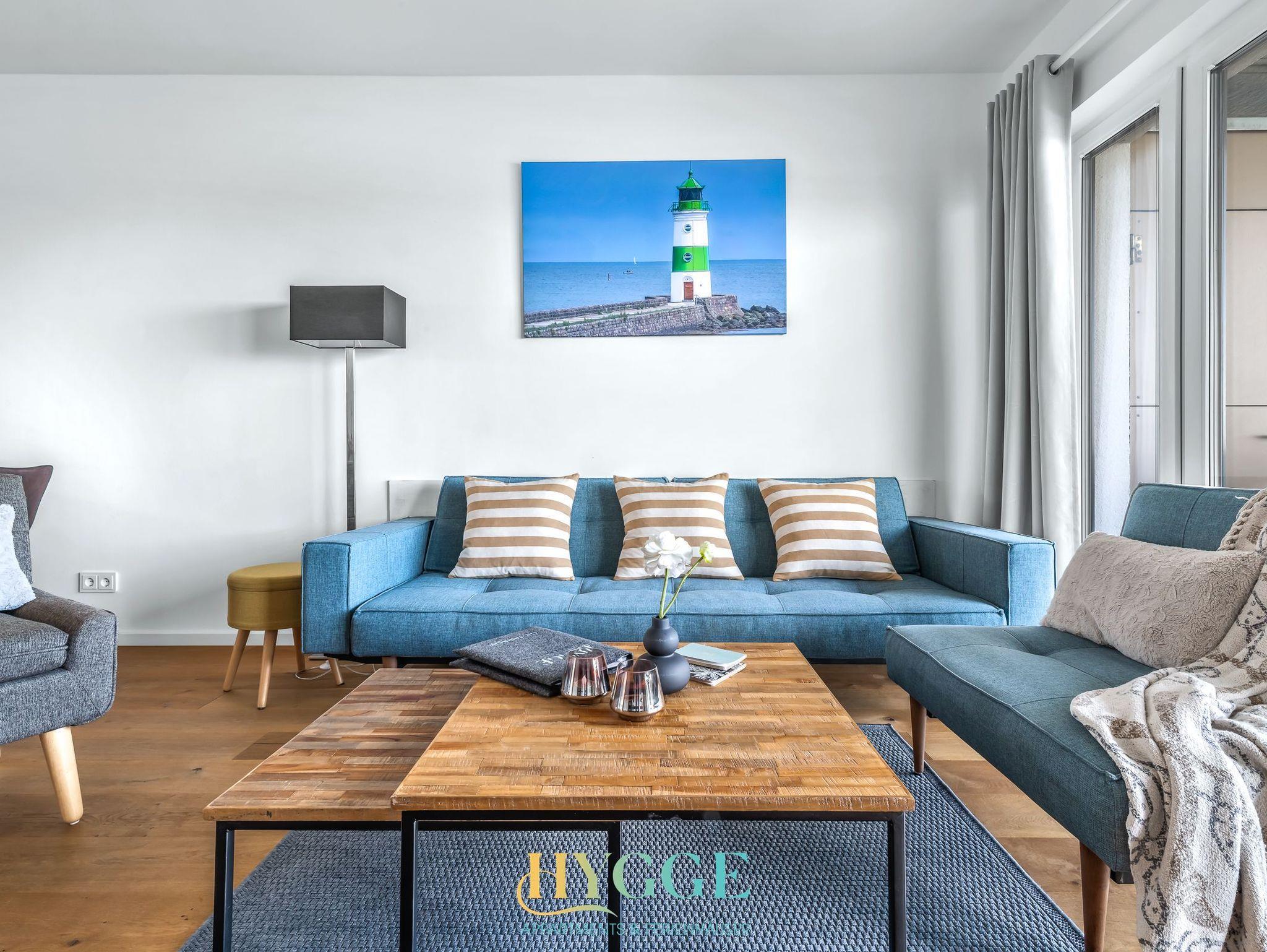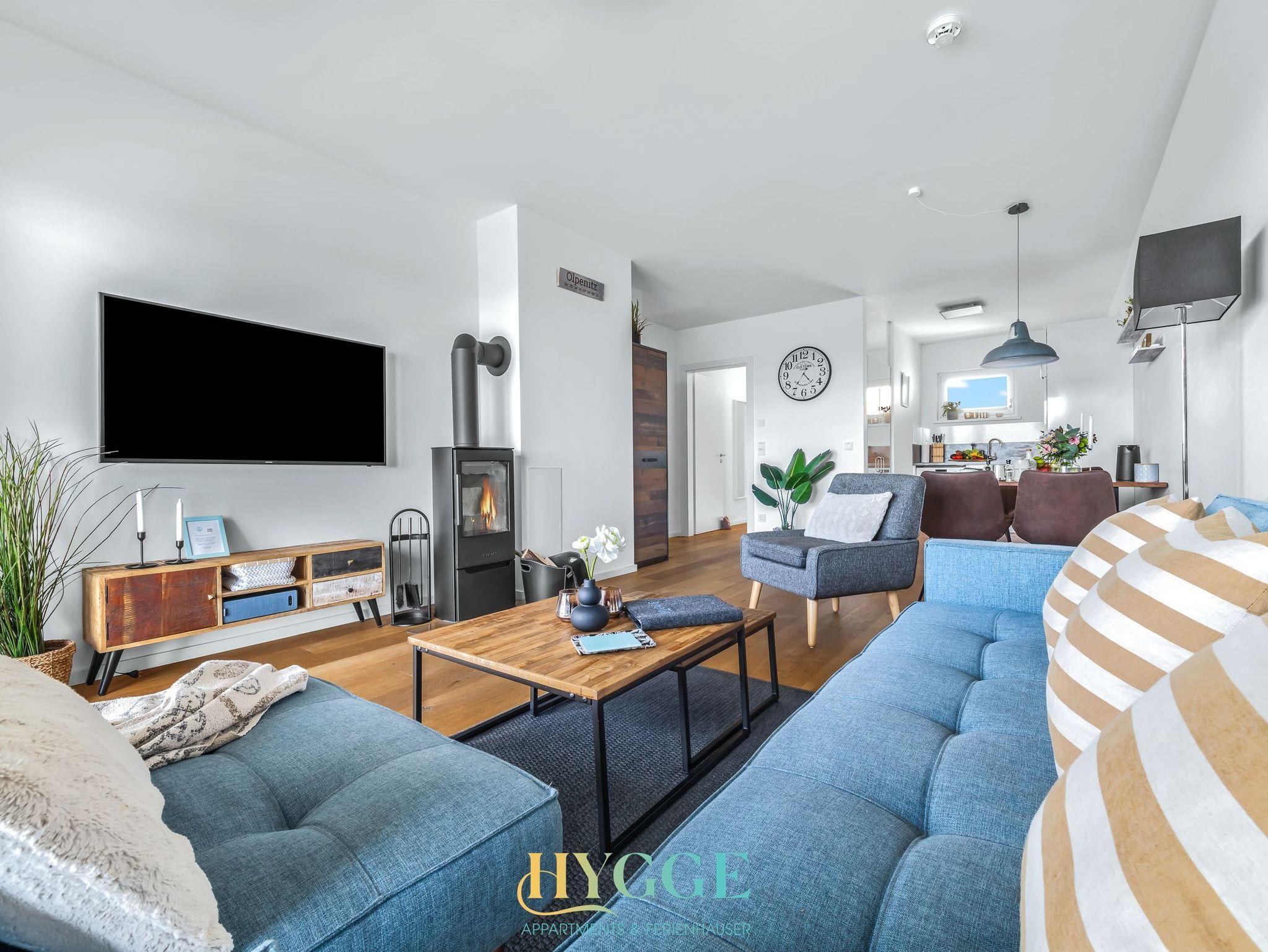 Die gemütliche Sitzlandschaft im Wohnbereich lädt zum Entspannen ein und bietet einen faszinierenden Blick auf das Wasser. Morgens sehen sie den unfassbar schönen Sonnenaufgang über dem Meer und auch in der dunklen Jahreszeit wird es hier hyggelig, wenn die Ostsee vor der Fensterfront ihr Temperament zeigt und das Sofa zu einem Rotwein bei prasselndem Kaminfeuer einlädt. Für Indoor-Entertainment sorgt ein großer Fernseher.