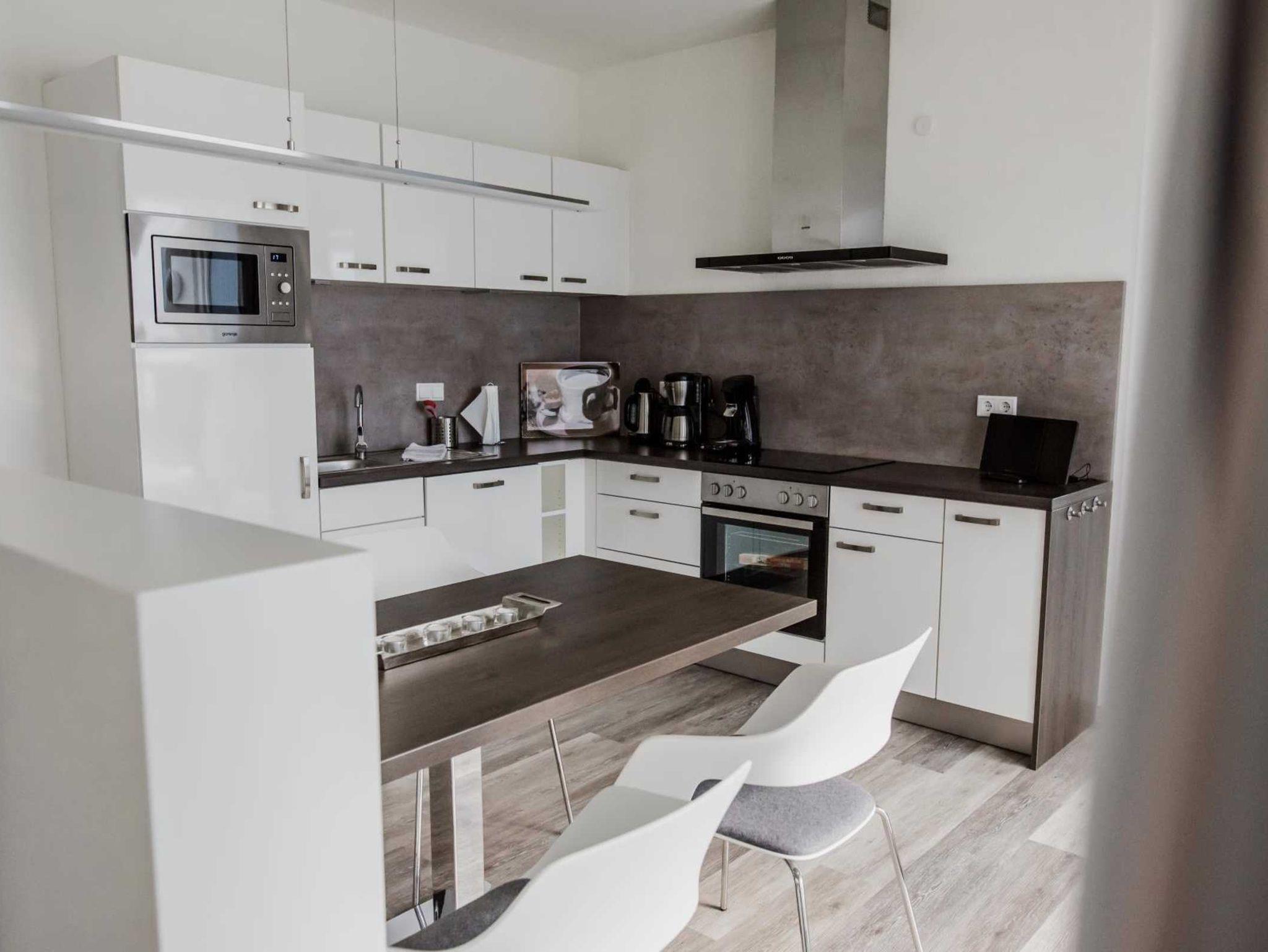 - Ein optimal ausgestatteter Küchenbereich (Cerankochfeld, Backofen, Mikrowelle, Kühlschrank mit Gefrierfach, Geschirrspüler, Kaffeemaschine, Senseo-Kaffeemaschine, Waffeleisen, Eierkocher, etc.),
