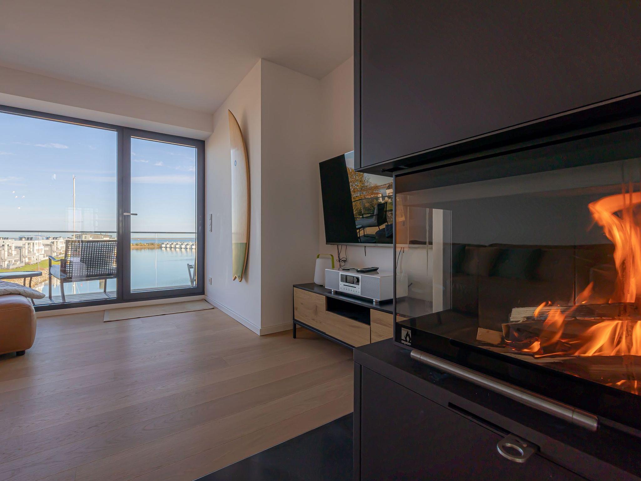 Genießen Sie Luxus und Behaglichkeit in dieser exklusiven 126 m² großen Maisonette-Wohnung mit offenem Dachausbau, die Platz für bis zu 6 Personen bietet. Die moderne, voll ausgestattete Küche mit einem kreativen Wandbild lädt zum gemeinsamen Kochen und Verweilen ein. Im stilvoll eingerichteten Wohnbereich mit Kamin erwartet Sie eine gemütliche Atmosphäre, begleitet von einem beeindruckenden Panoramablick auf den Hafen, Schleimünde mit seinem Leuchtturm und die Ostsee.