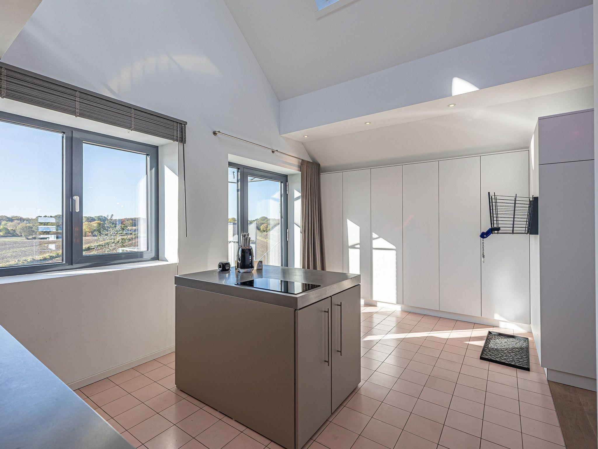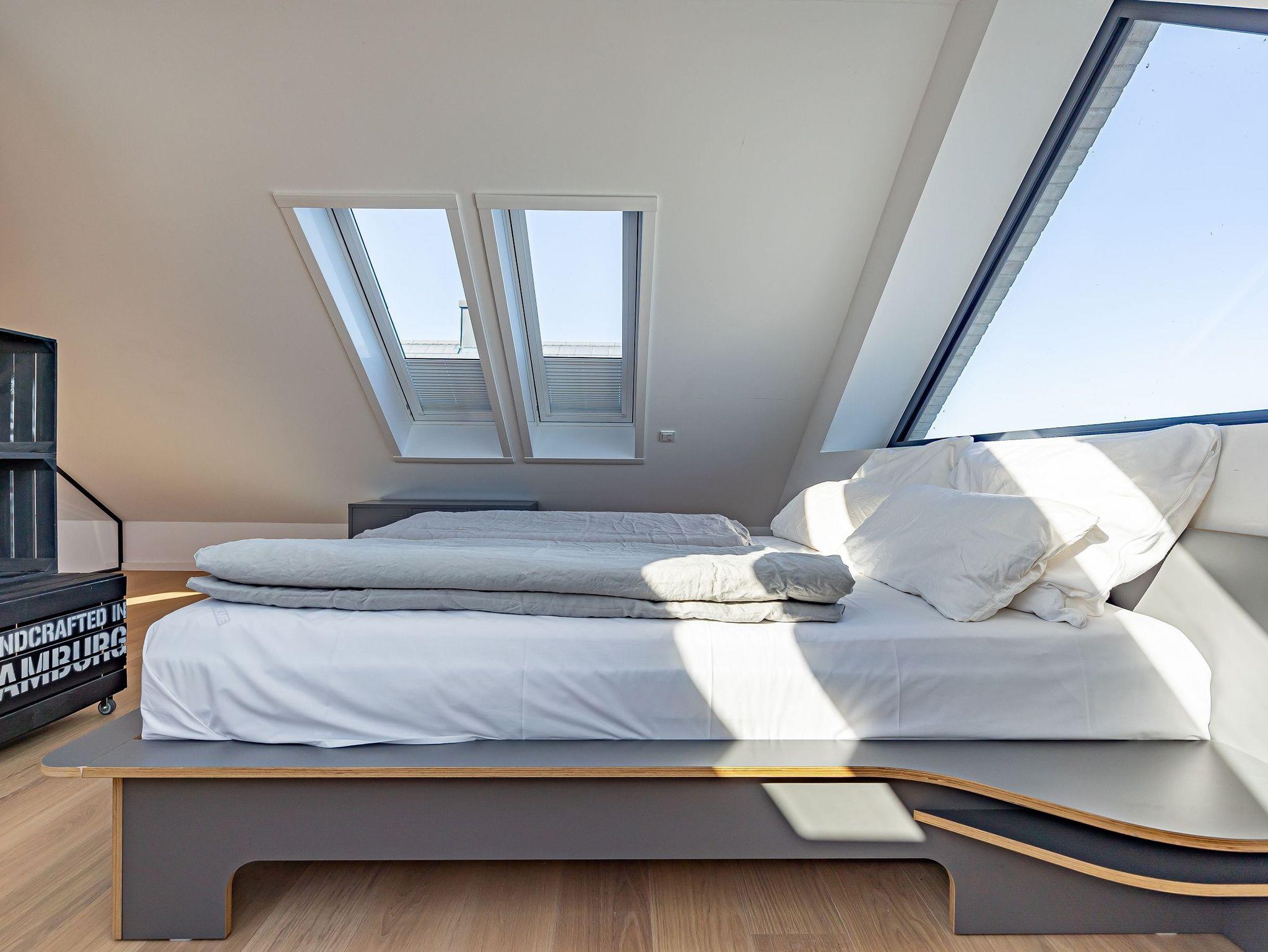 Der offene Dachausbau, durchflutet von Tageslicht und ausgestattet mit großen Fenstern, vermittelt ein unvergleichliches Wohngefühl. Hier befindet sich ein komfortables Bett, von dem aus Sie die Schlei und Ostsee in Ruhe betrachten können.